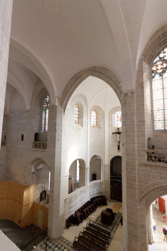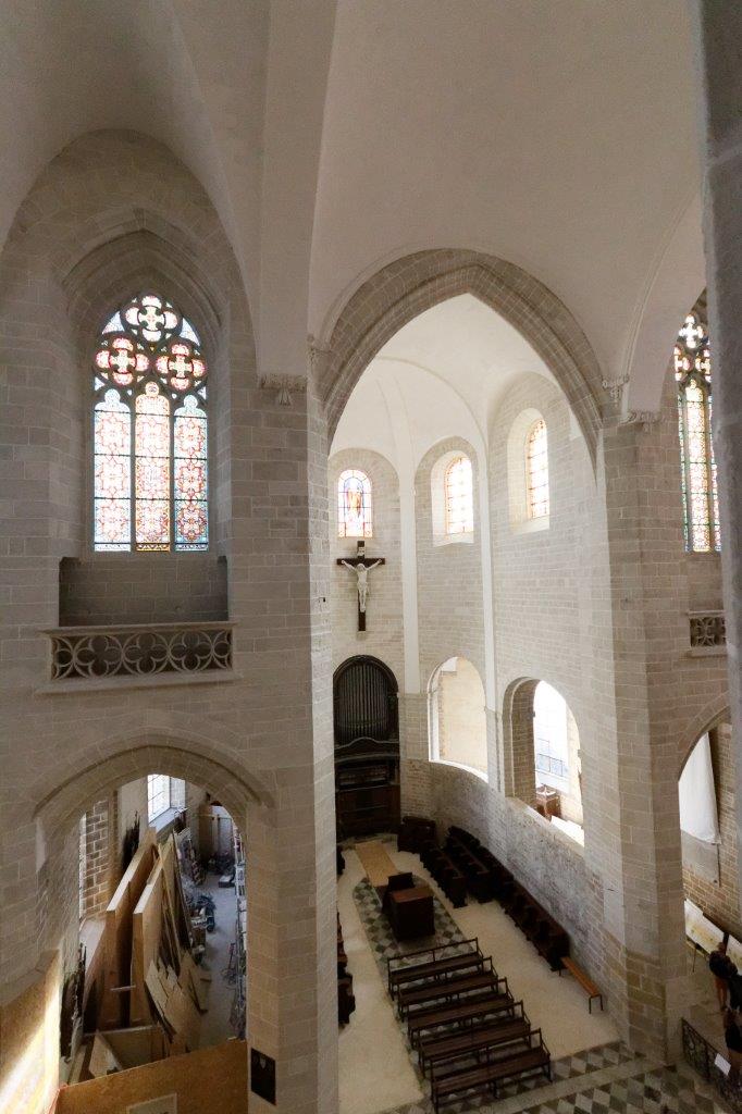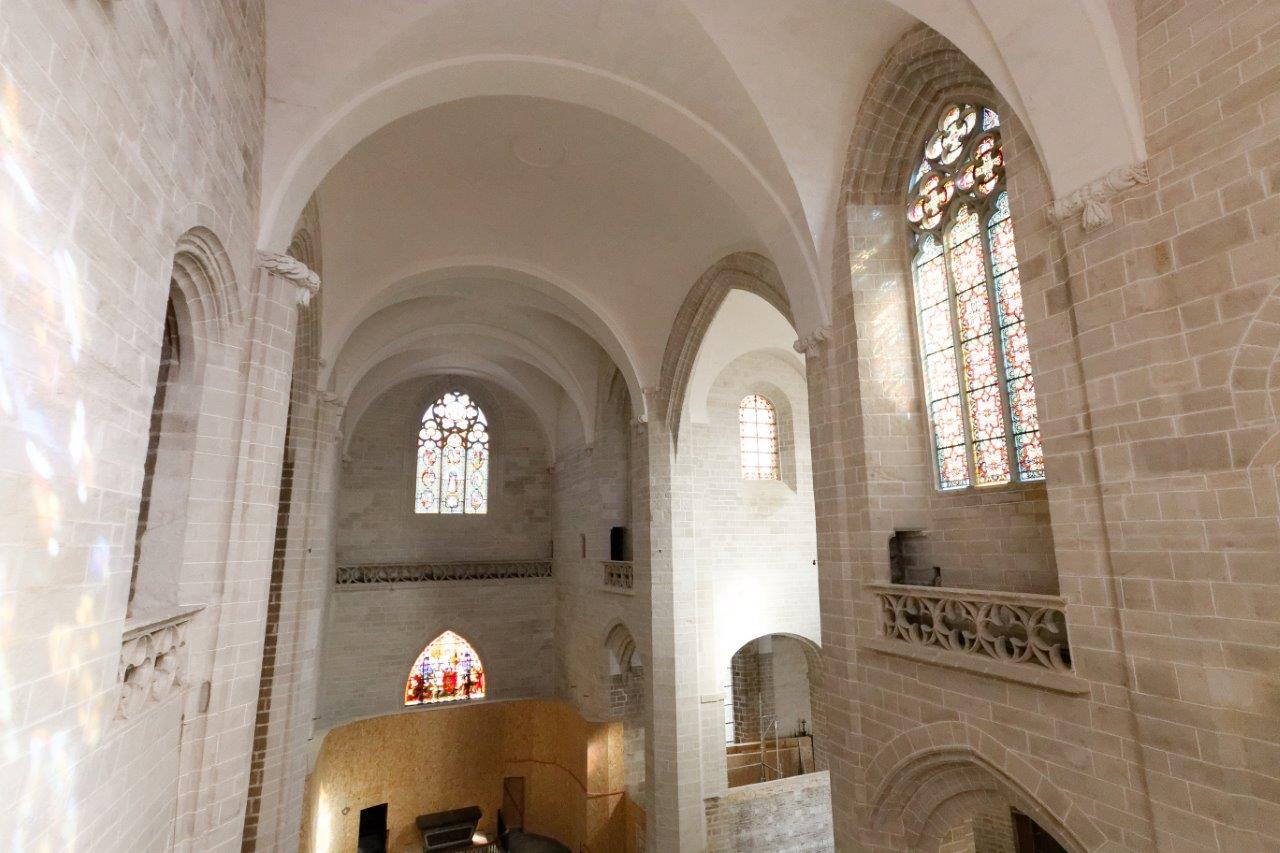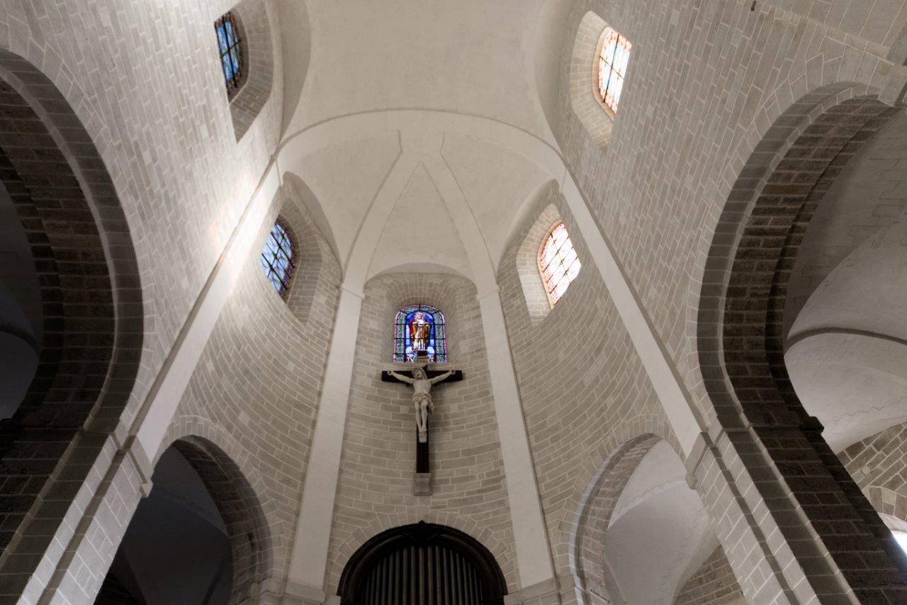 L'harmonieux équilibre des voûtes et de l'arrondi du chevet où le vitrail et la croix, qui s'offrent aux regards, provoquent un émerveillement immédiat !