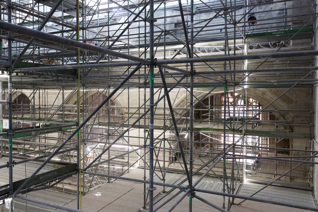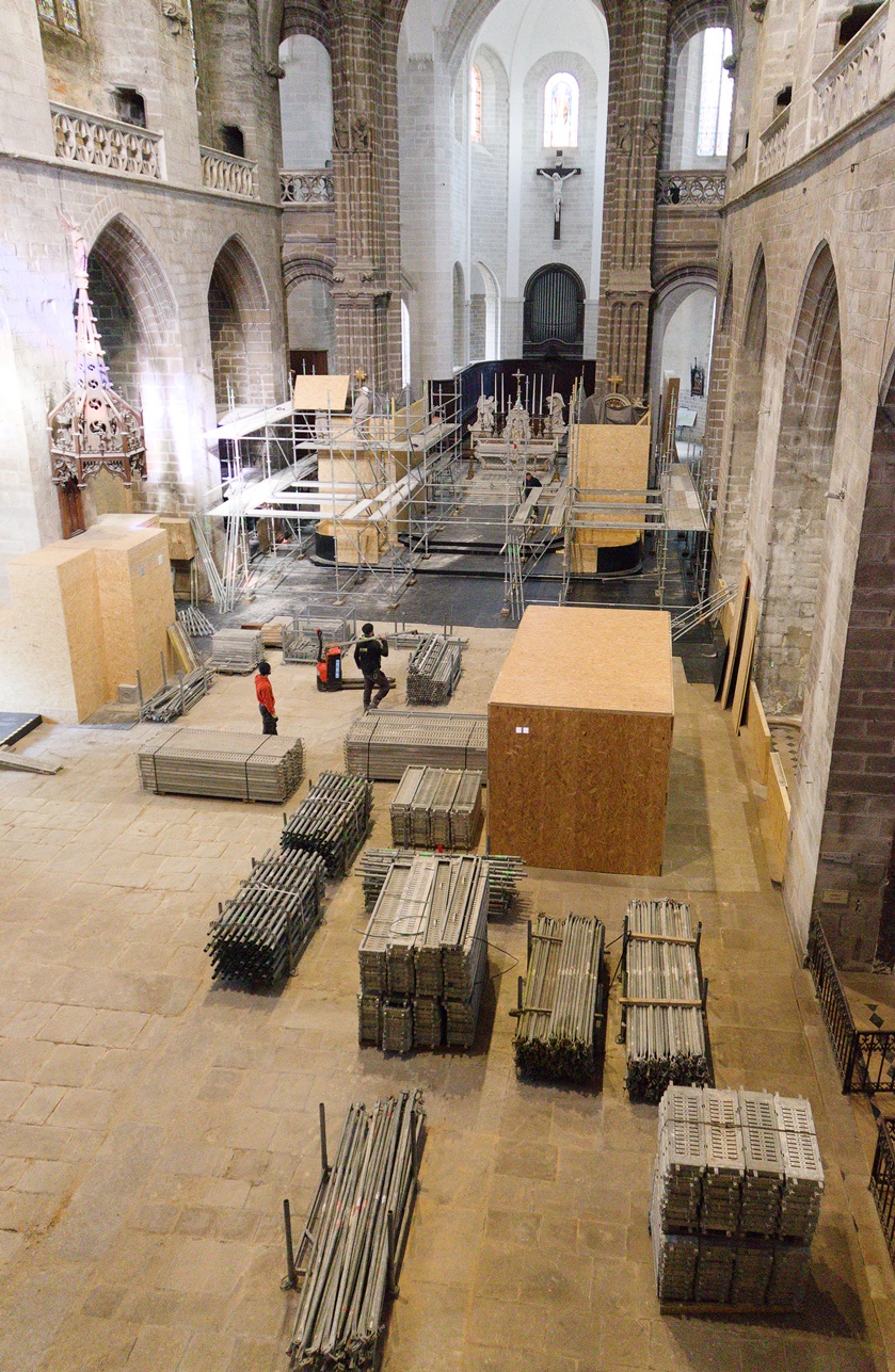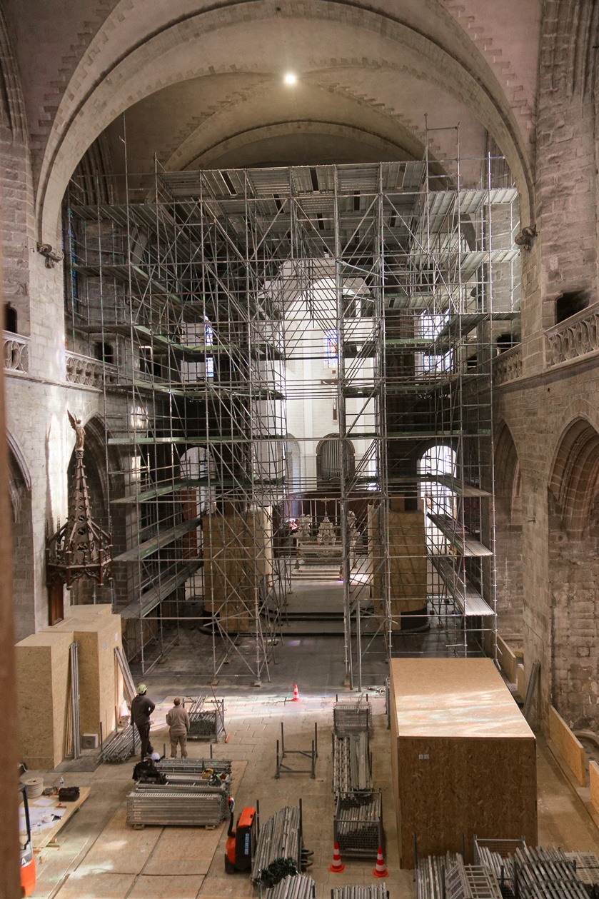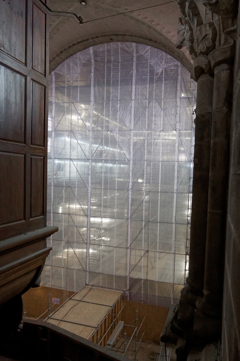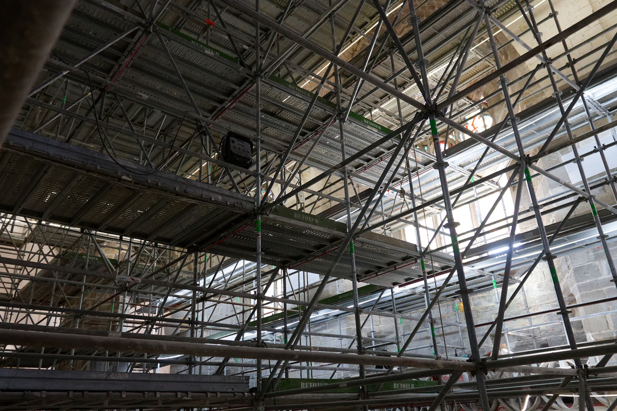 Tout d'abord, voici un aperçu des impressionnants échafaudages qui occupent toute la nef et au dessus du tunnel en contreplaqué installé en juin, permettant ainsi la déambulation des visiteurs et des priants, vers les transepts rénovés et l'abside.