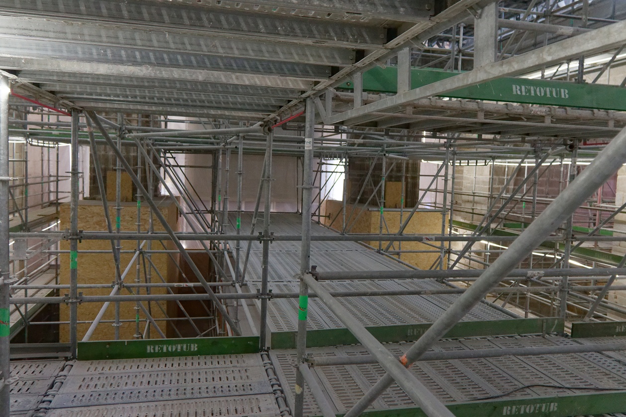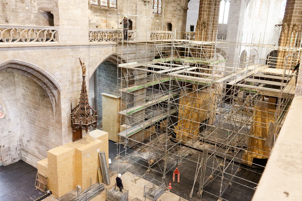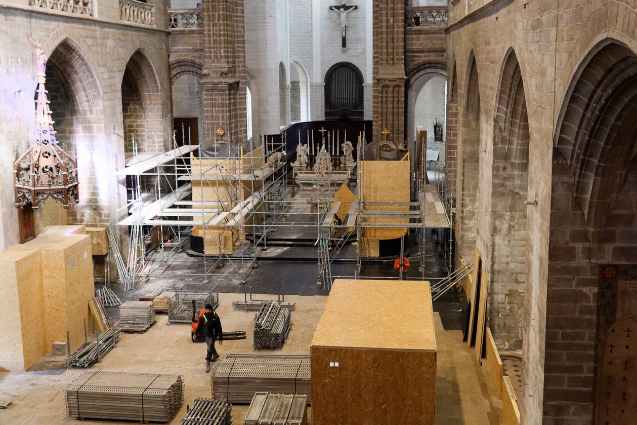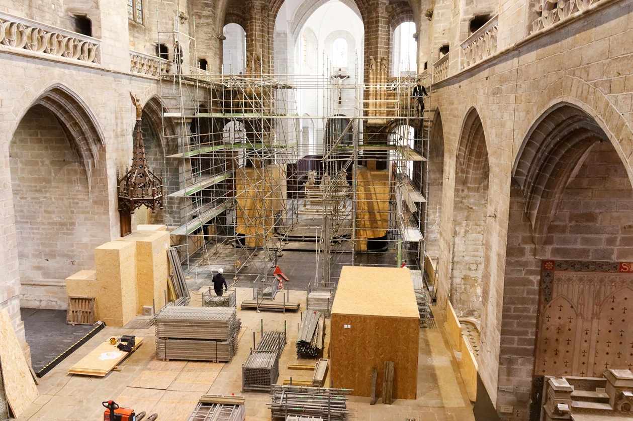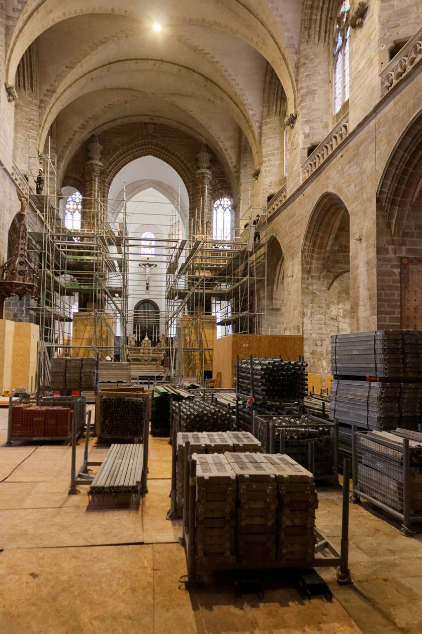 Tout d'abord, voici un aperçu des impressionnants échafaudages qui occupent toute la nef et au dessus du tunnel en contreplaqué installé en juin, permettant ainsi la déambulation des visiteurs et des priants, vers les transepts rénovés et l'abside.