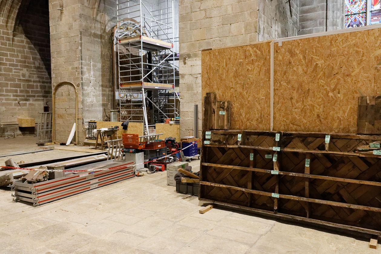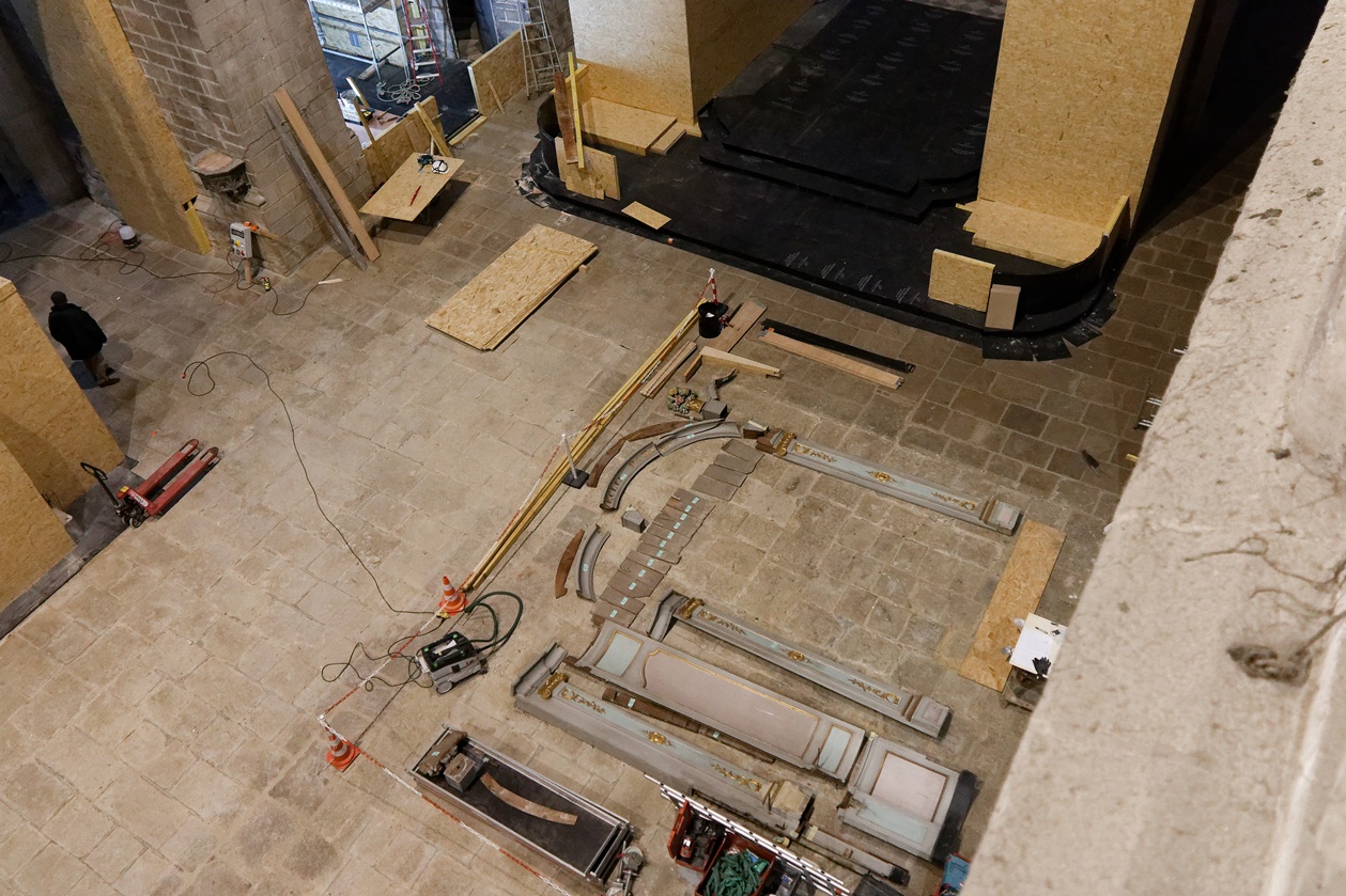 On n'imagine pas les allées et venues que nécessitent un tel chantier de restauration, pour déposer les boisieries, dans l'ordre afin de n'en perdre aucune, et pour le faire avec précaution ! Monter, descendre ... manoeuvrer, et recommencer.