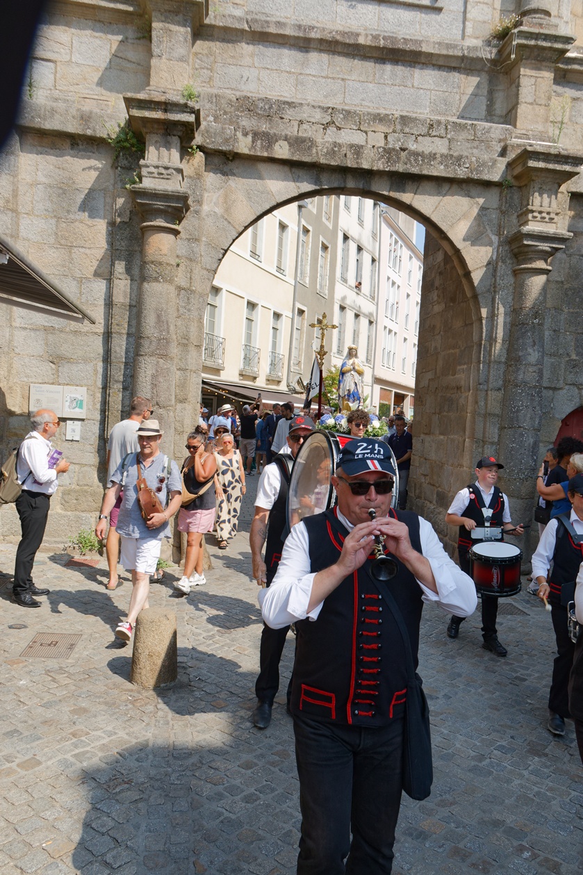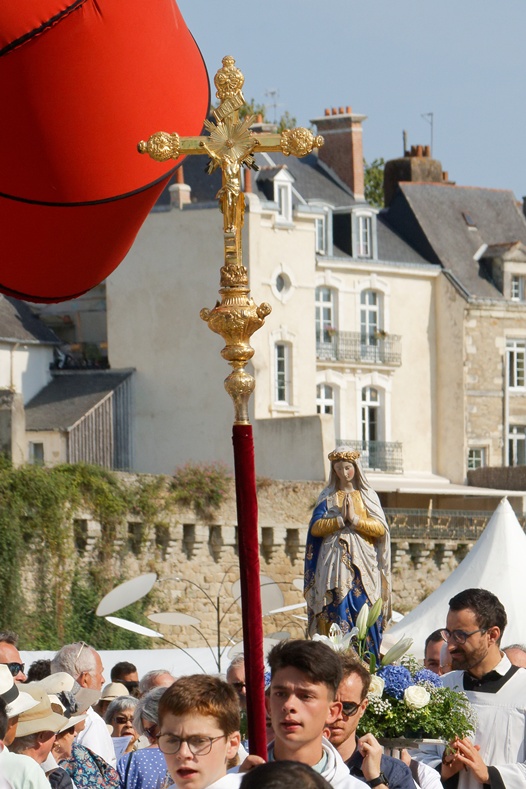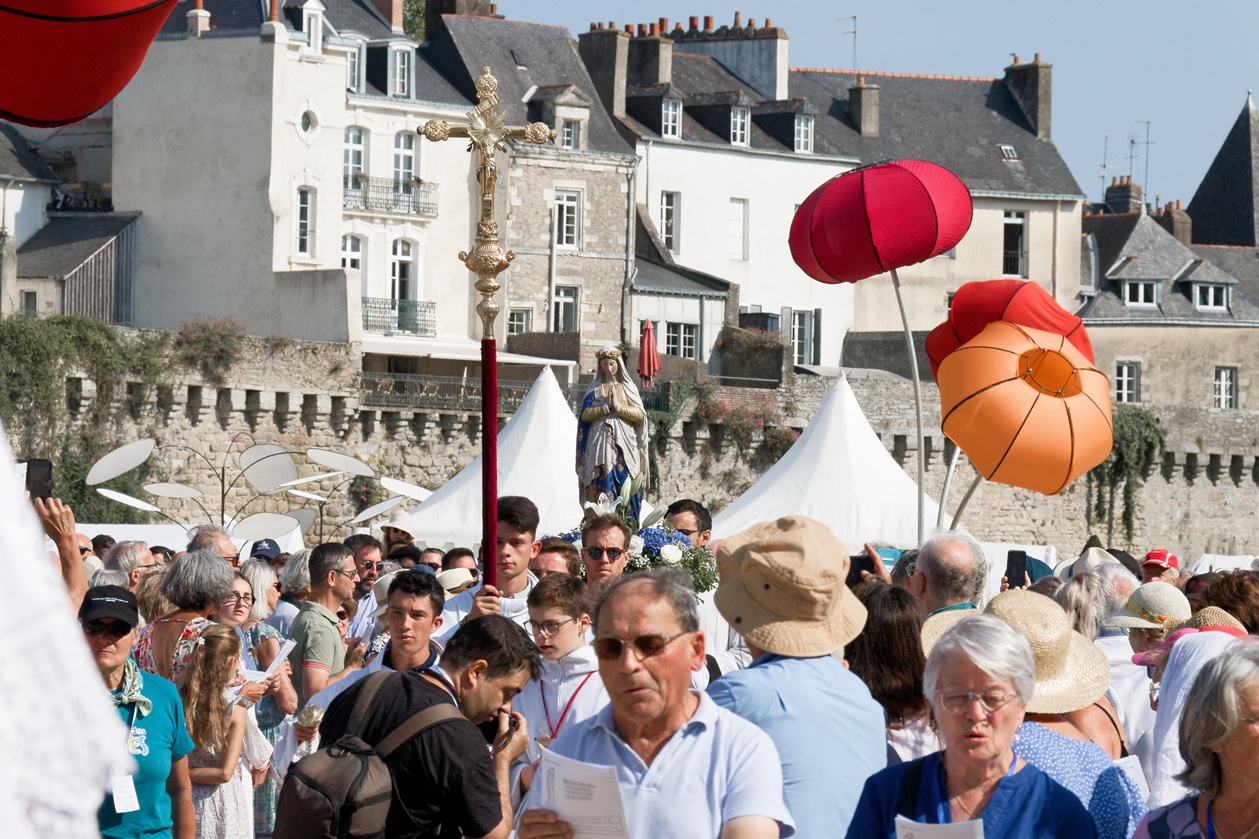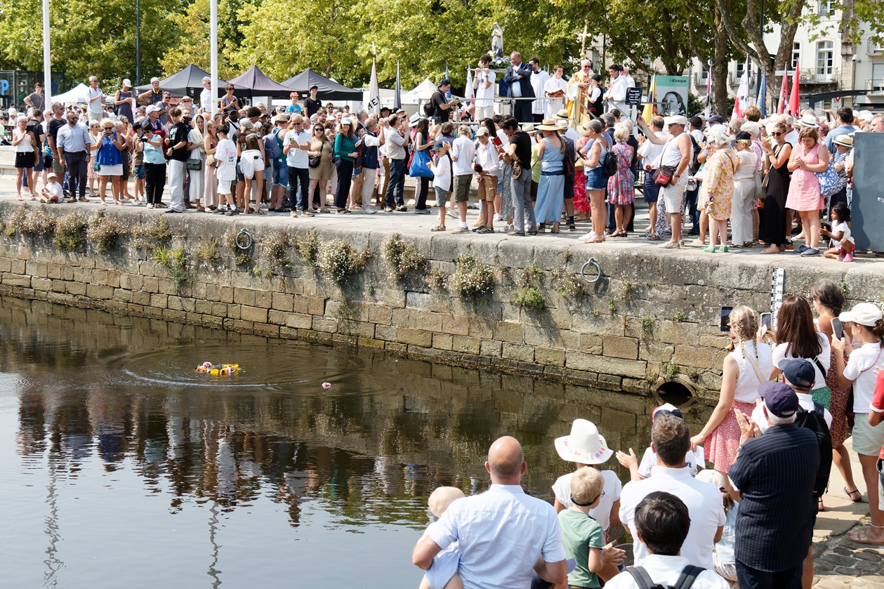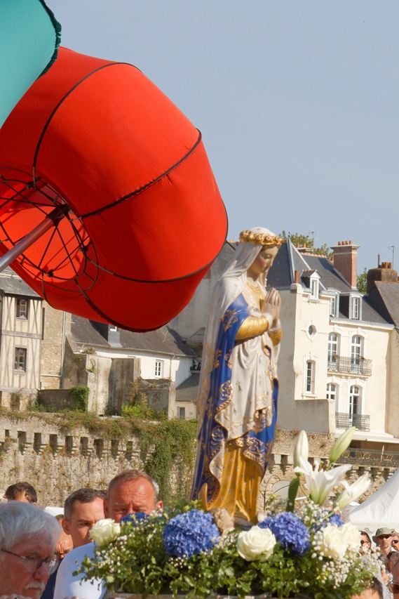 La mission s'est faite toute seule avec la liturgie !!! Puis, comme chaque année la procession s'est mise en marche vers le port, en passant par la places des Lices, puis la Porte Saint-Vincent. Drapeaux et bannières au vent, précédant la statue de Marie, Reine de l'Arvor, la foule derrière les prêtres et les servants d'autel, se sont regroupés pour la bénédiction de la mer et notre maire a lancé la couronne de fleurs dans les eaux du port.