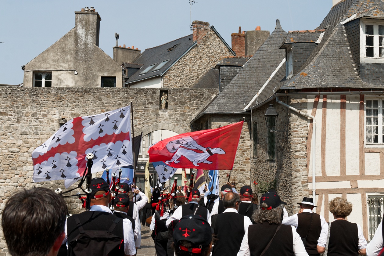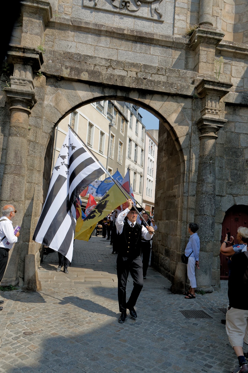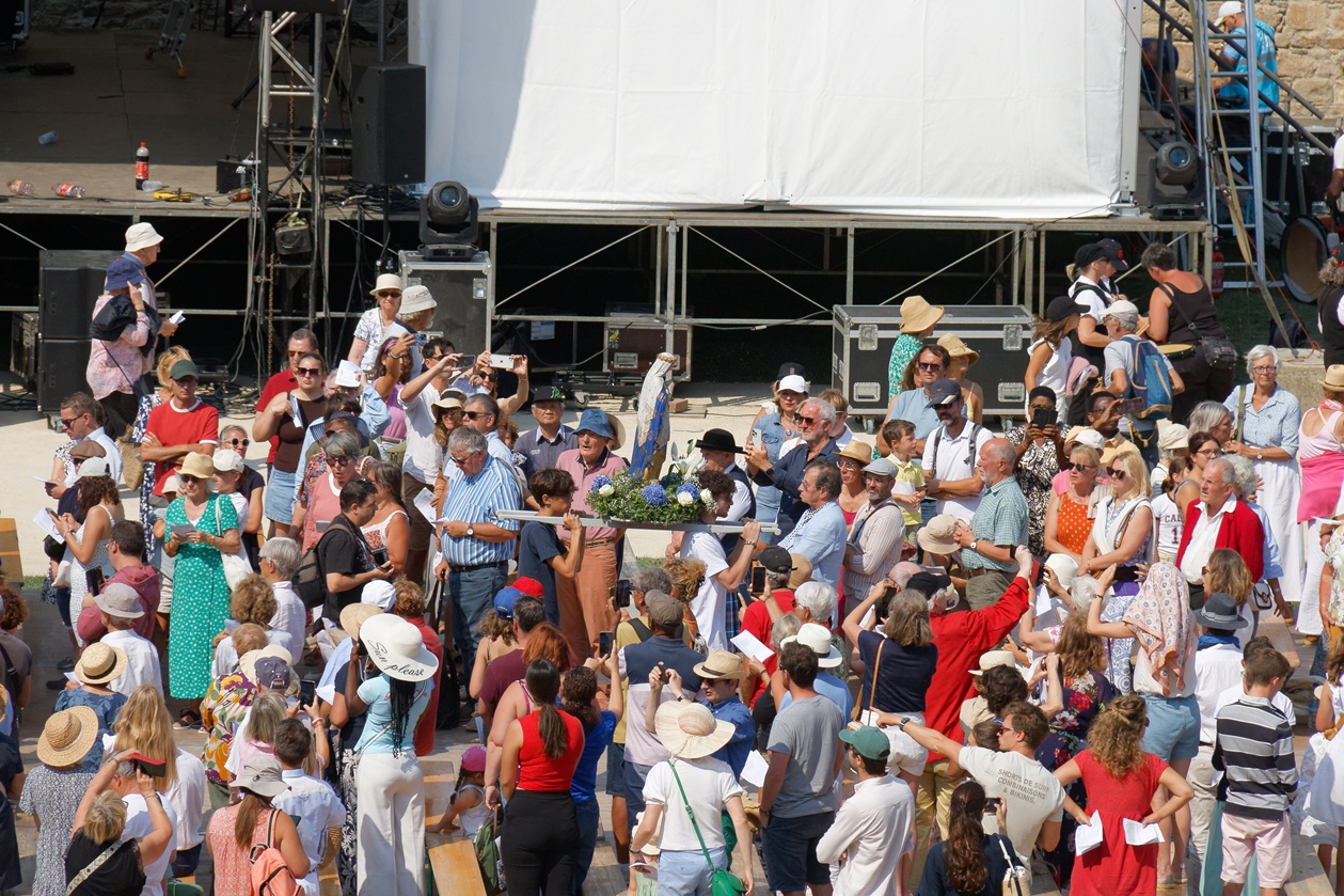 La mission s'est faite toute seule avec la liturgie !!! Puis, comme chaque année la procession s'est mise en marche vers le port, en passant par la places des Lices, puis la Porte Saint-Vincent. Drapeaux et bannières au vent, précédant la statue de Marie, Reine de l'Arvor, la foule derrière les prêtres et les servants d'autel, se sont regroupés pour la bénédiction de la mer et notre maire a lancé la couronne de fleurs dans les eaux du port.