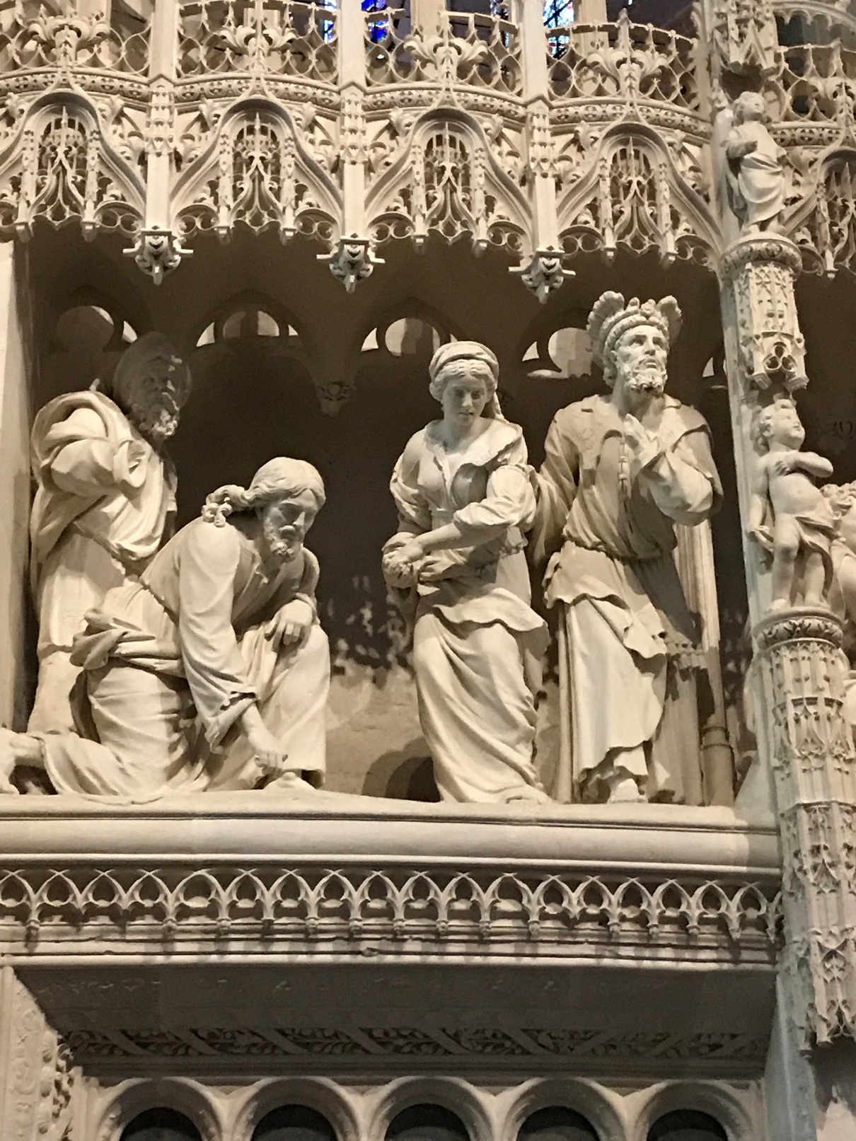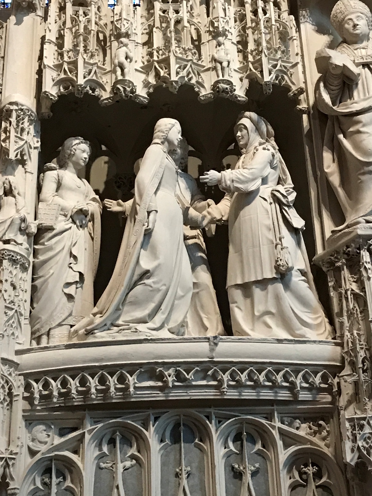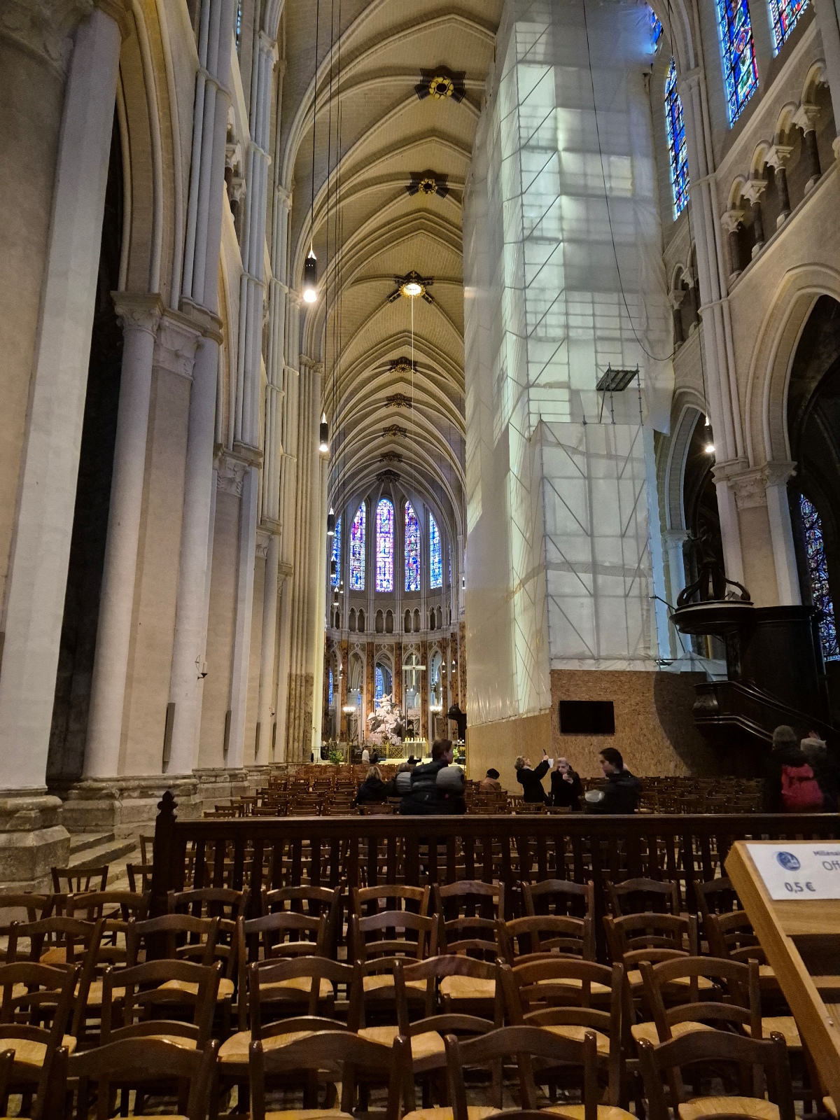 Aujourd'hui, la cathédrale a été presqu’entièrement rénovée, puisque seuls les murs intérieurs des bas-côtés n’ont pas été nettoyés puis blanchis au lait de chaux. Nous avons pu voir le nouveau mobilier liturgique, mais surtout nous avons été saisis par la beauté du tour extérieur du chœur, qui se présente comme une étonnante frise sculptée datant des années 1520-1530. Chapeau les artistes ! On pourrait comparer cette frise à une longue BD retraçant toutes les scènes de l’évangile. Une pure merveille !