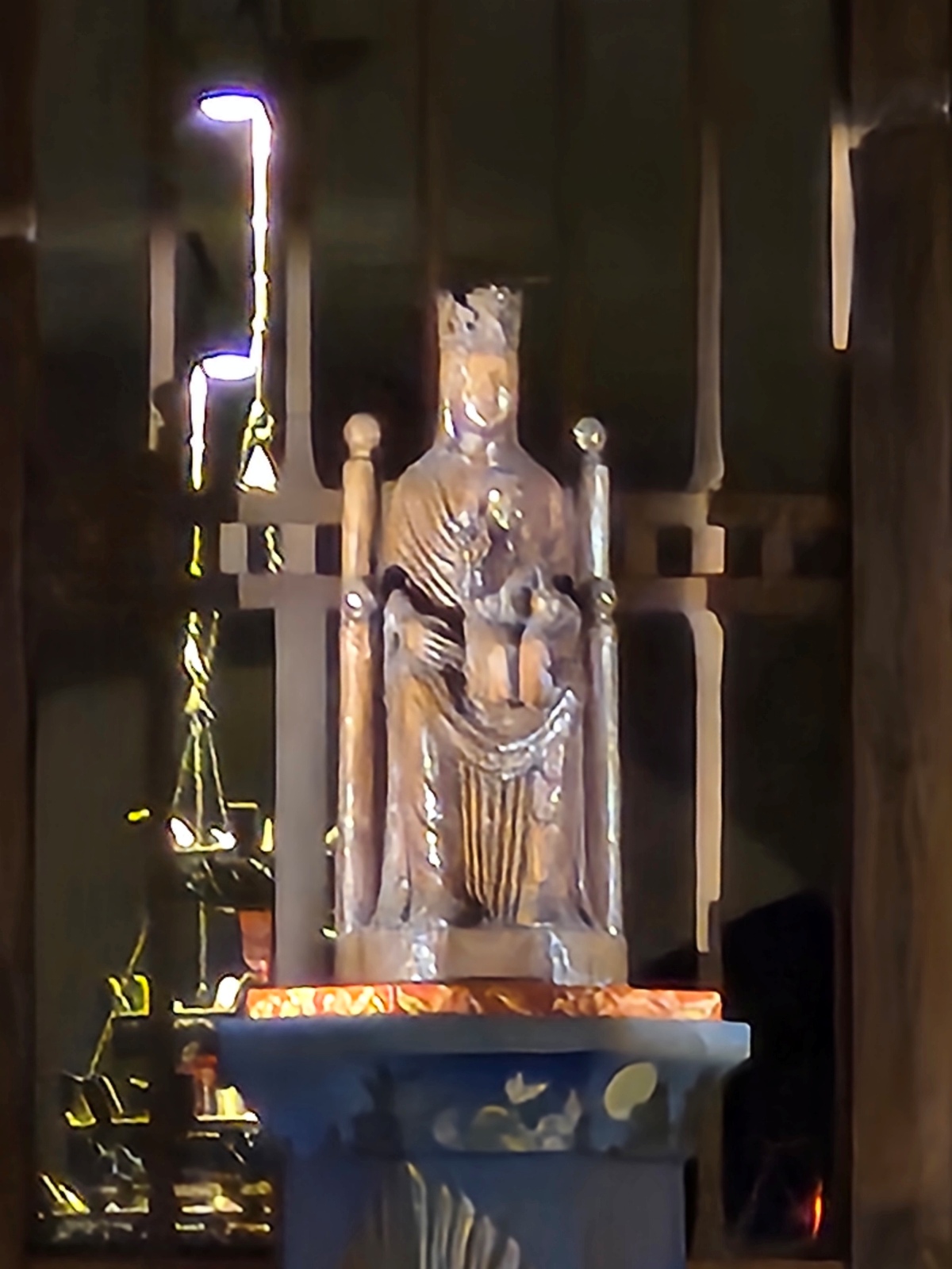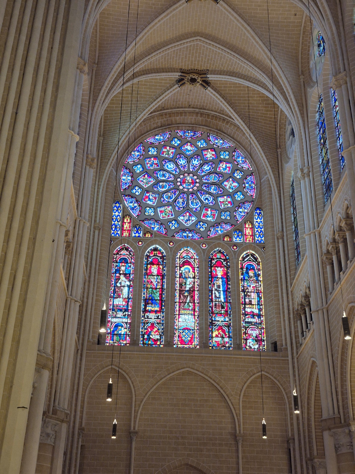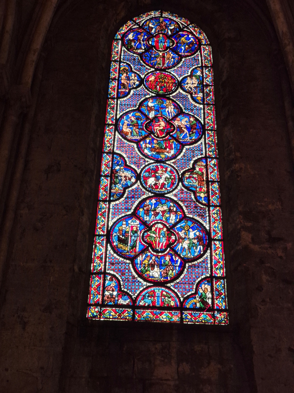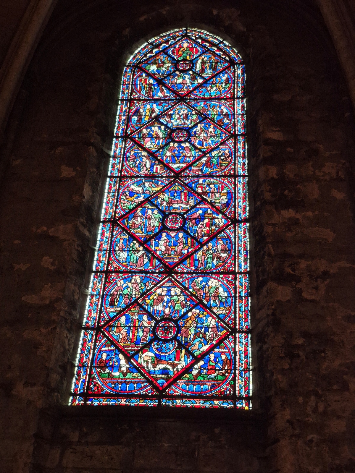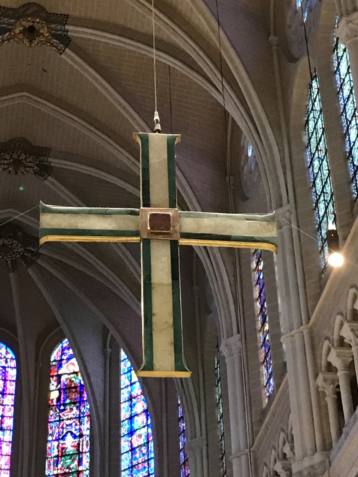 Nous avons été frappés par le bleuté des vitraux, qui, nous a-t-on dit, sont d’origine, à 90% ! Un bleu dit de Chartres.