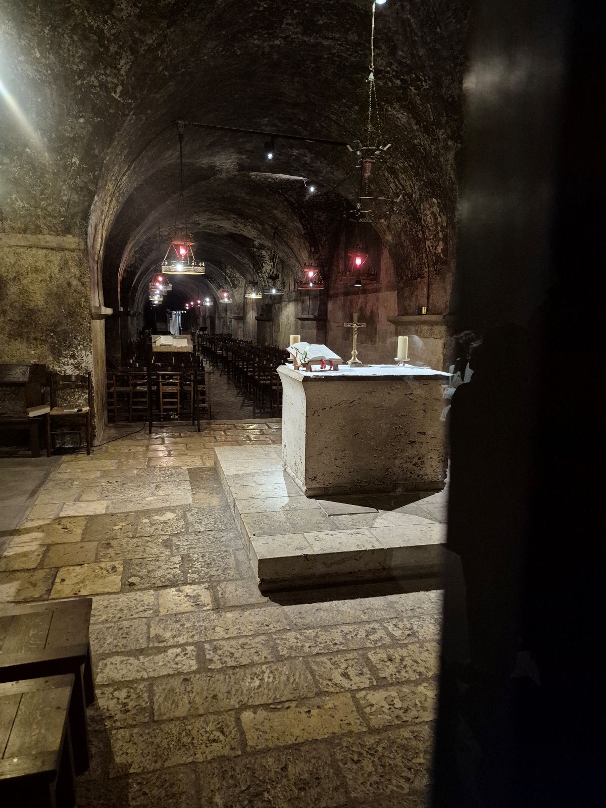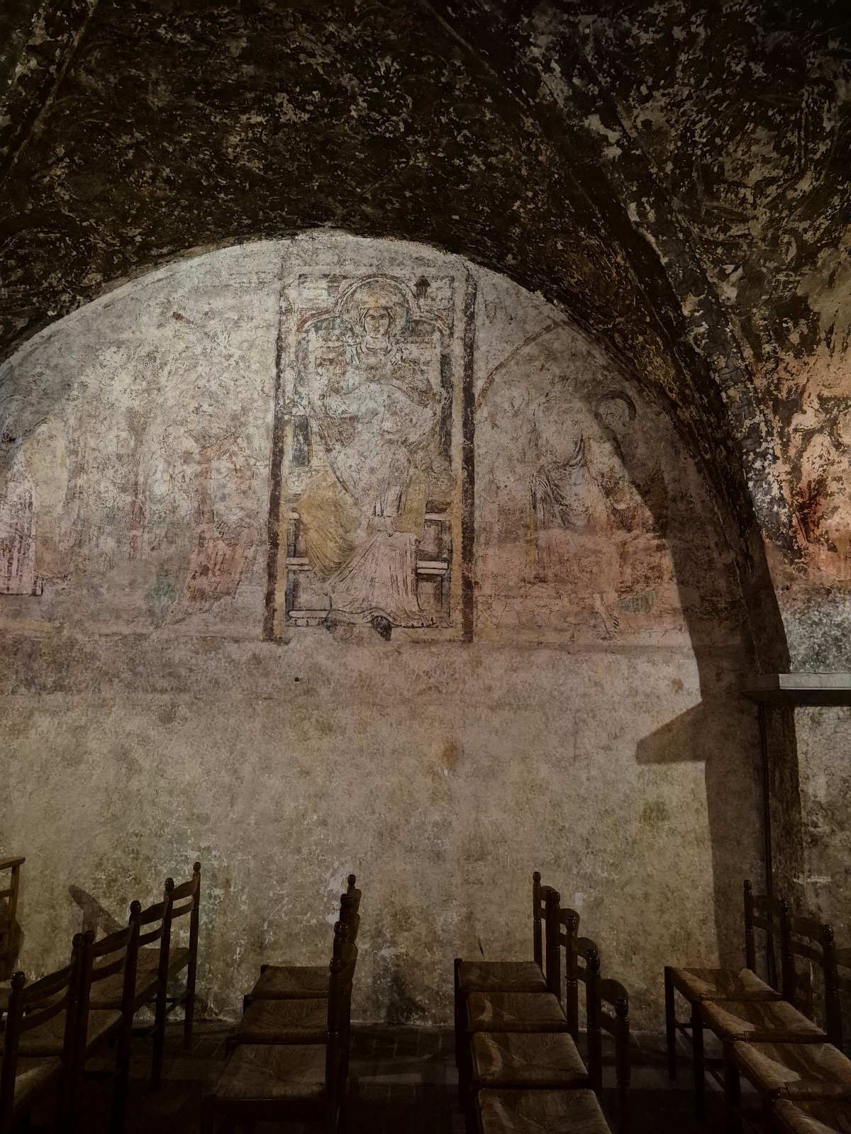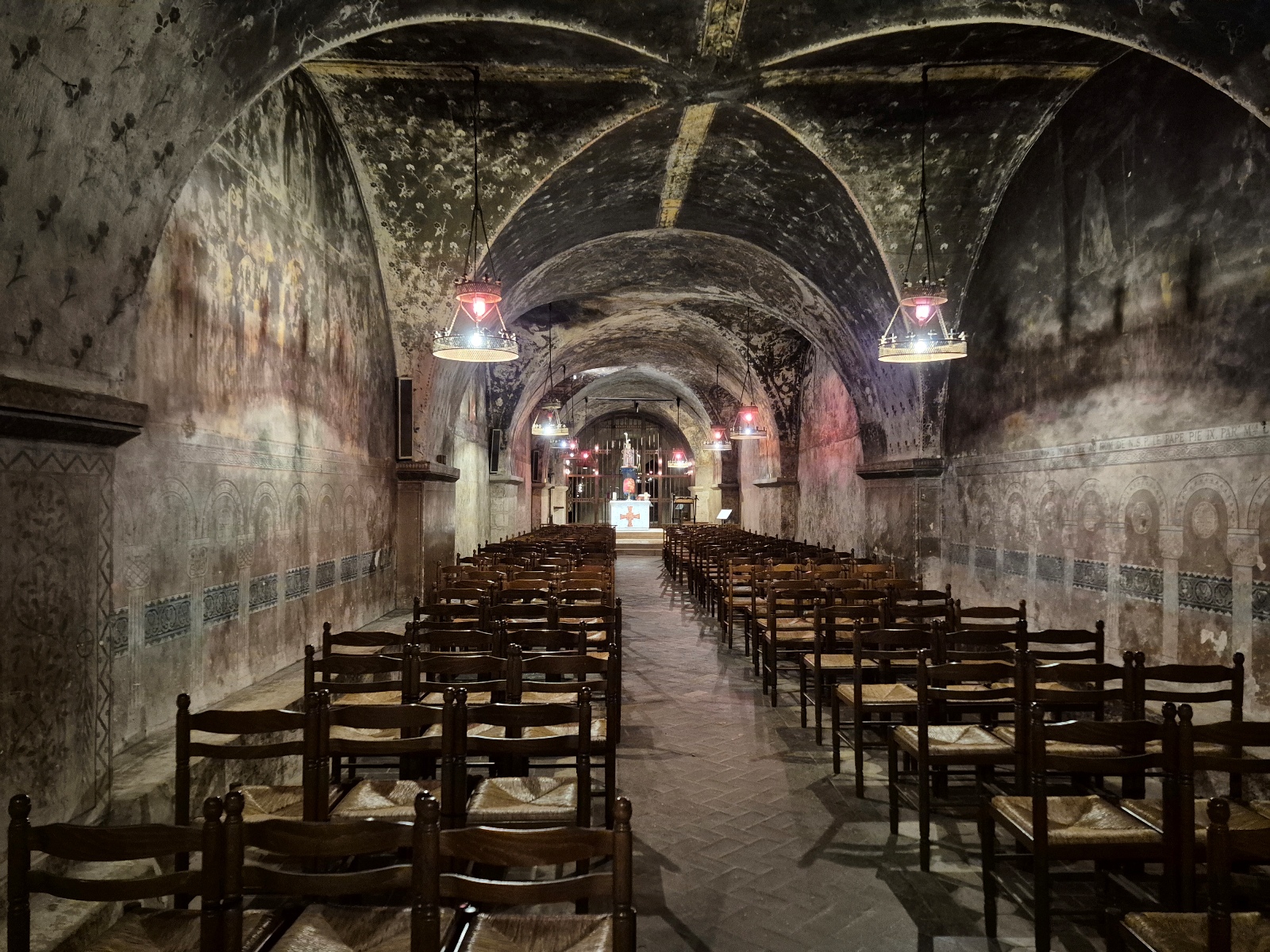 Il faut dire un mot de cette crypte qui fait 200 m de longueur et qui est aménagée comme une église souterraine : nef étroite, partitionnée en 2, l’une pour le côté cultuel, et l’autre pour le côté culturel. Cette église souterraine date de 1020.