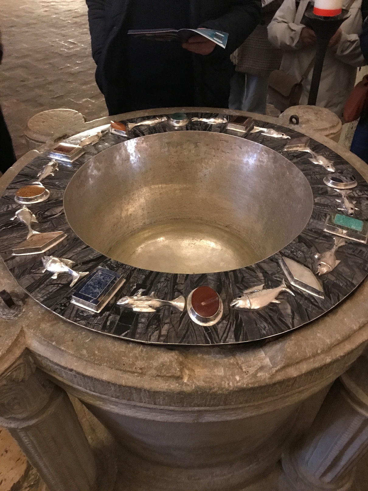 Ensuite, nous sommes descendus dans la crypte, pour une 2ème visite guidée, avec une approche spirituelle pour le pèlerinage jubilaire « Pèlerins d’espérance ». Art, culture et foi ! Notre guide nous a, en quelque sorte, pris par la main pour prier, chanter et en fin de parcours, nous proposer de renouveler les promesses de notre baptême devant le magnifique baptistère.