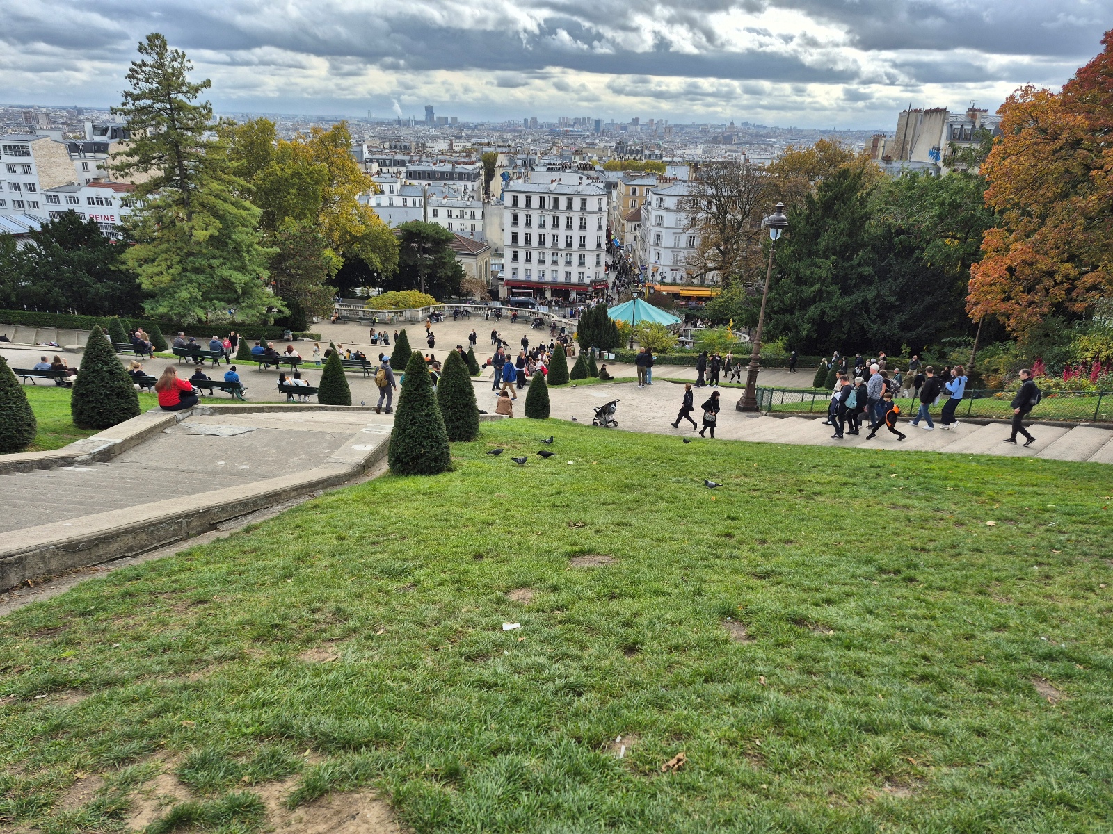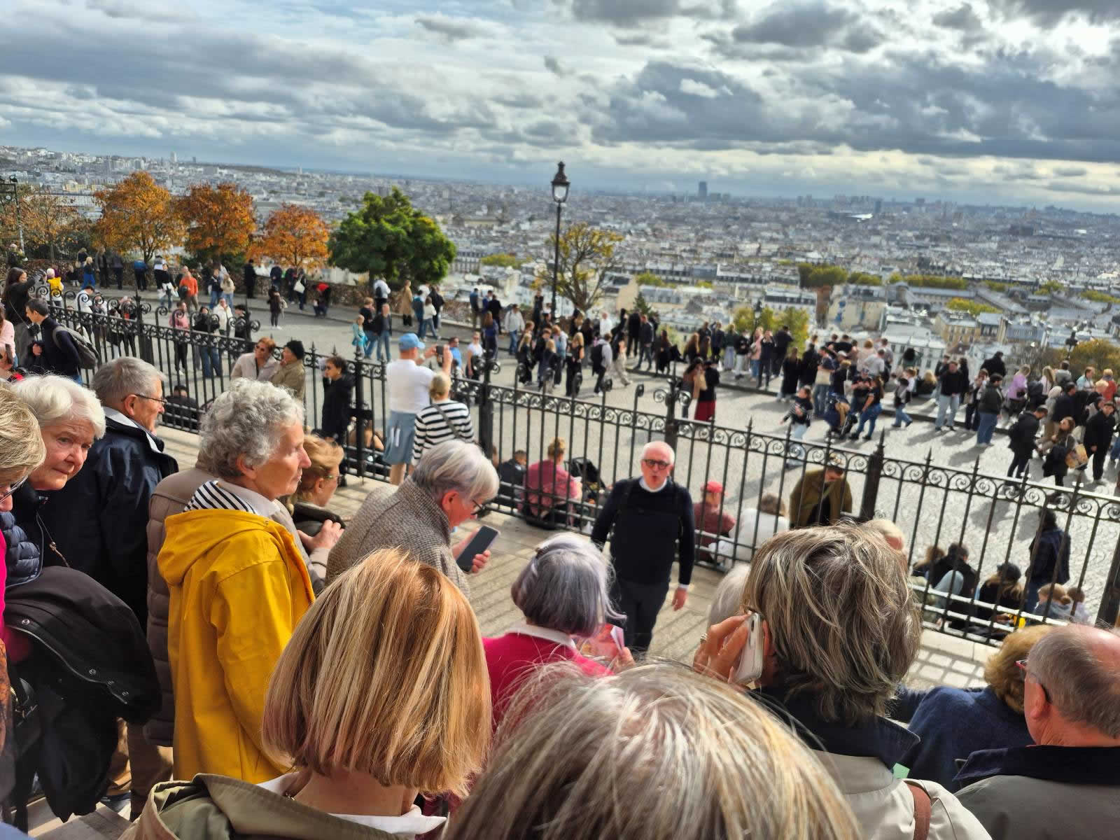Ensuite, avant de redescendre de la Butte Montmartre, sur les marches de la Basilique, nous avons pris la pause pour la photo-souvenir du groupe ! et nos appareils photos ont engrangé des vues panoramiques de Paris qui s’étalait à nos pieds, sous le soleil.