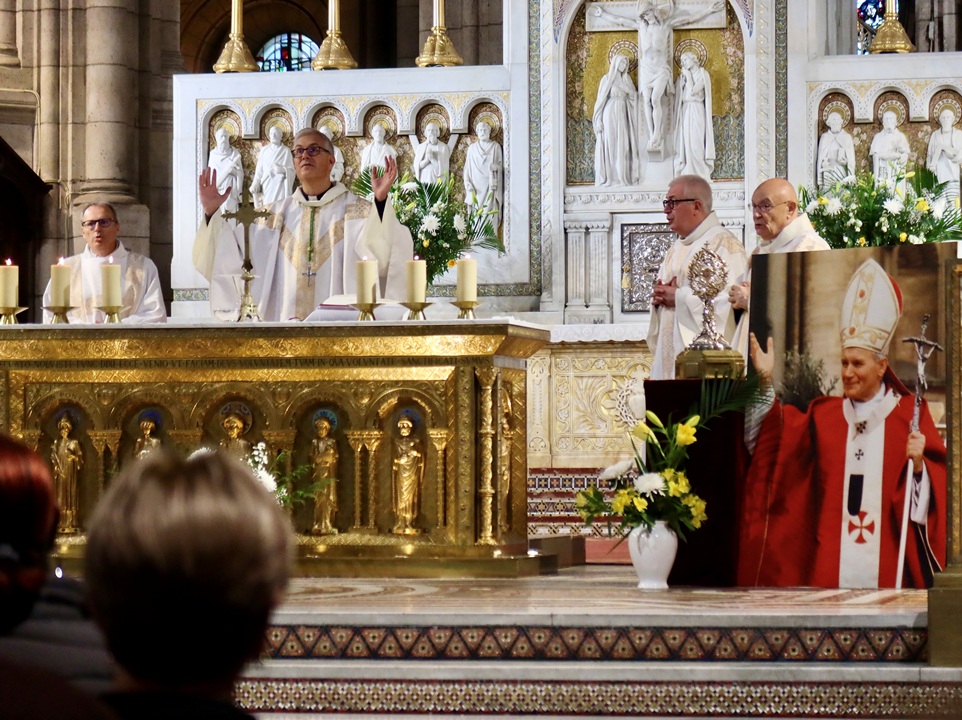 Nous avons eu la messe à 11 heures. Là encore, le père Patrice concélébrait, mais cette fois avec l’évêque de Valence, qui était de passage à Paris avec un groupe l’Enseignement Catholique de son diocèse. La messe était animée par les religieuses bénédictines de Montmartre. Voix cristallines ... et cerise sur le gâteau, nous fêtions liturgiquement notre cher Saint Jean-Paul II, qui était venu à Sainte Anne d’Auray le 16 septembre 2016. Beaucoup parmi nous s’en souvenaient encore.