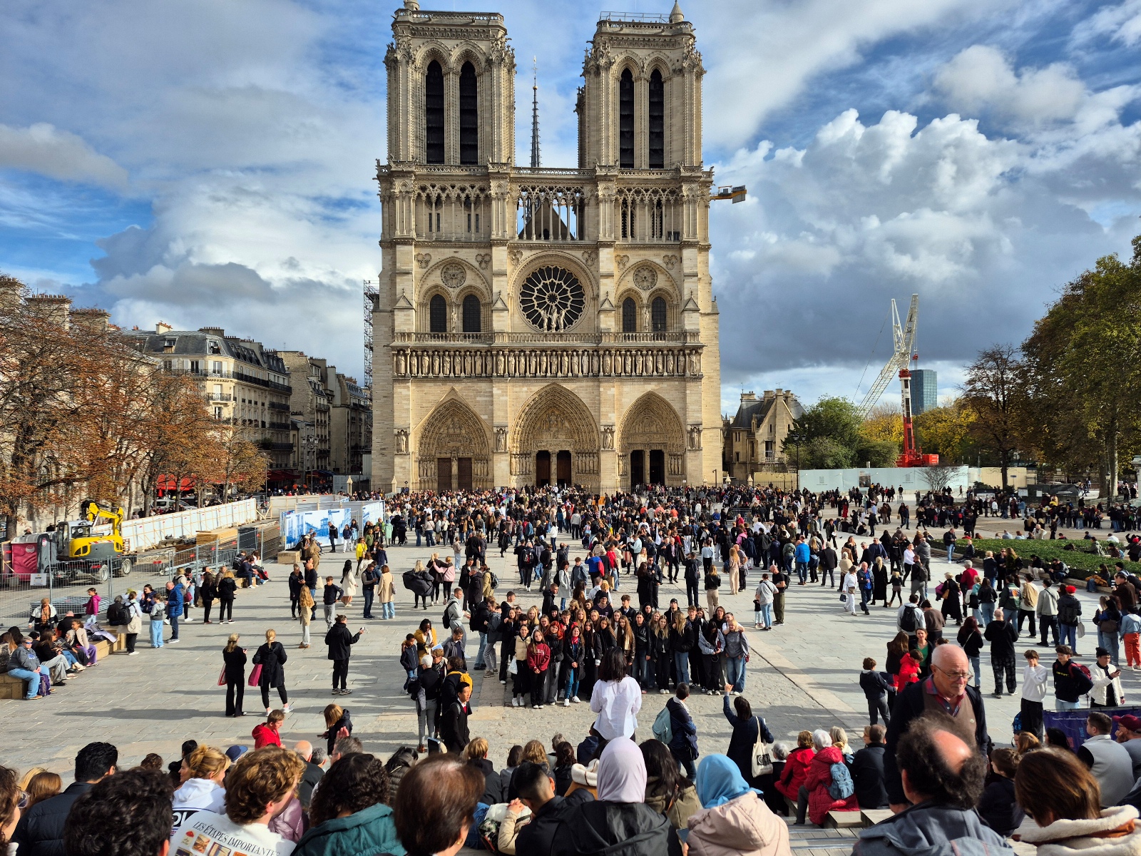 Lorsque nous sommes arrivés à pied, depuis le quartier de l’Odéon, quelle n’a pas été notre surprise de voir une foule de gens, les uns visiteurs contemplatifs perchés et assis sur les marches d'une estrade dressée face à la cathédrale, les autres disposés en longue file d’attente de plus de 100 m qui attendaient leur tour pour pouvoir entrer dans l’édifice !
