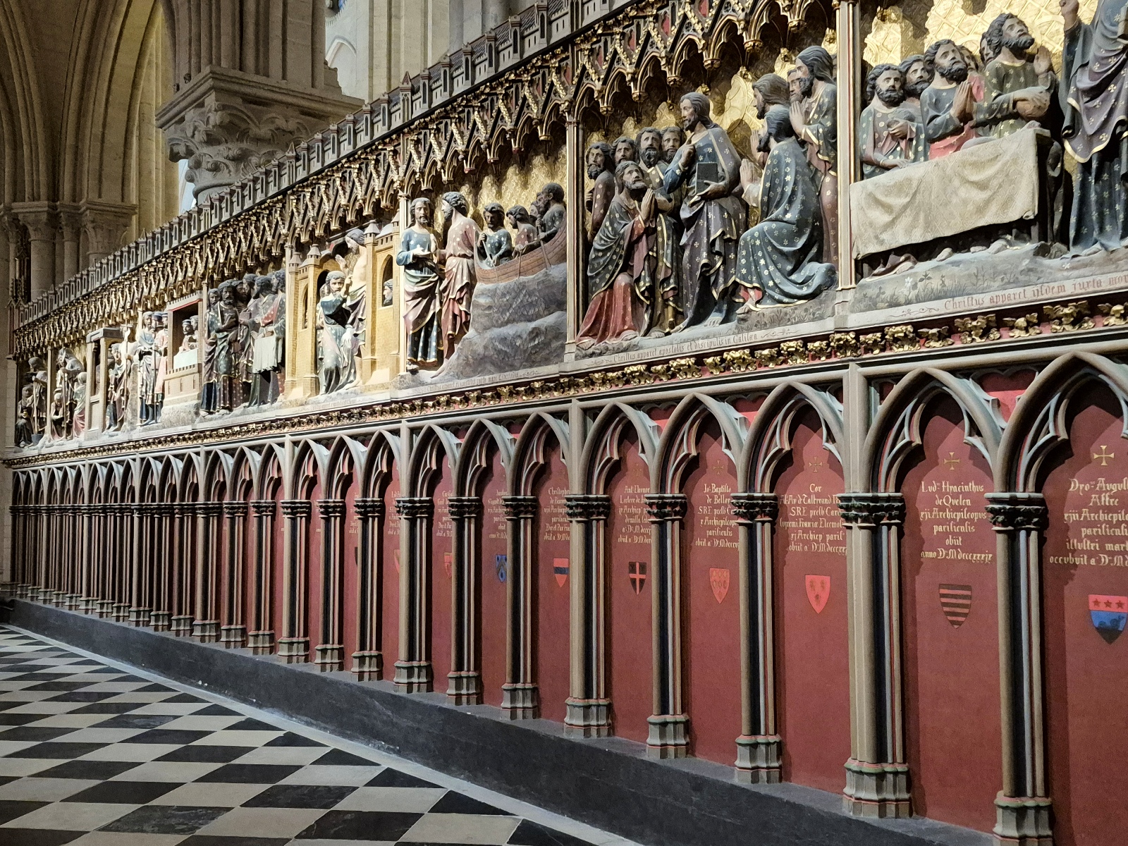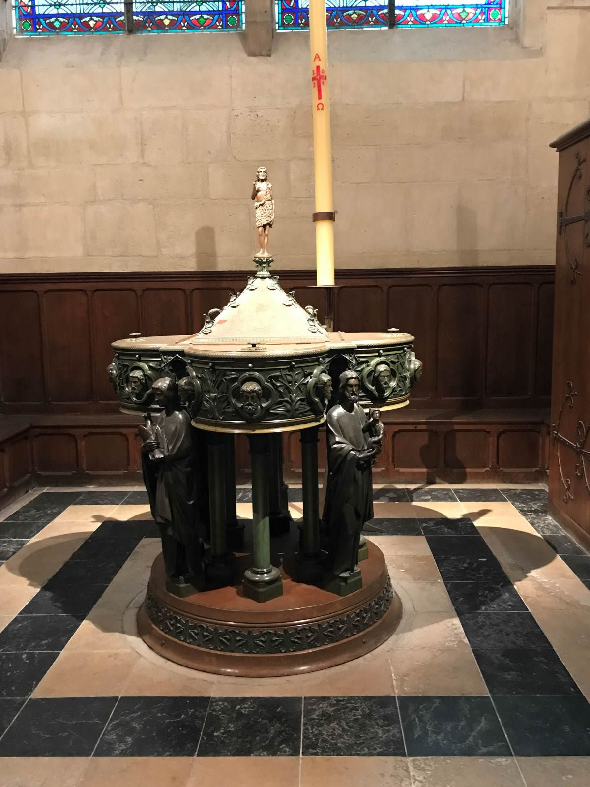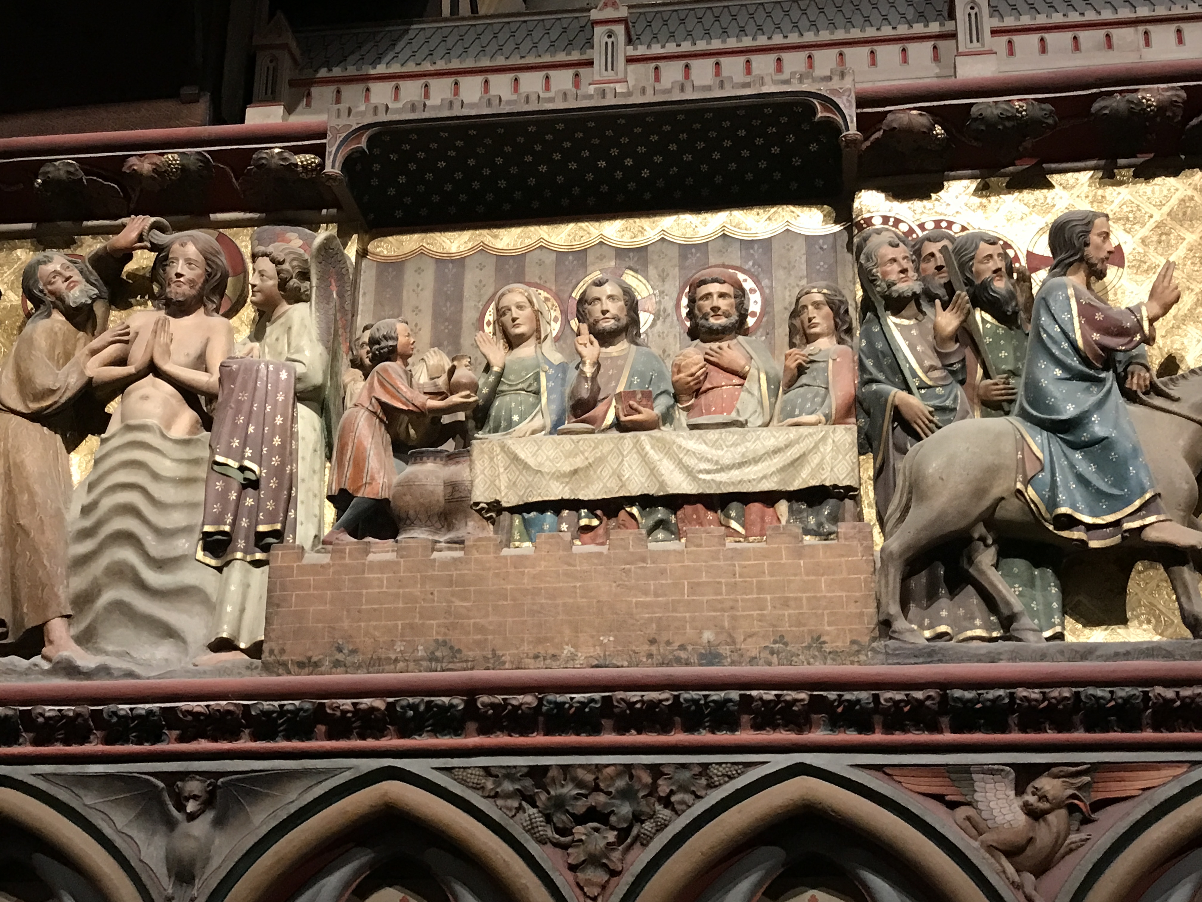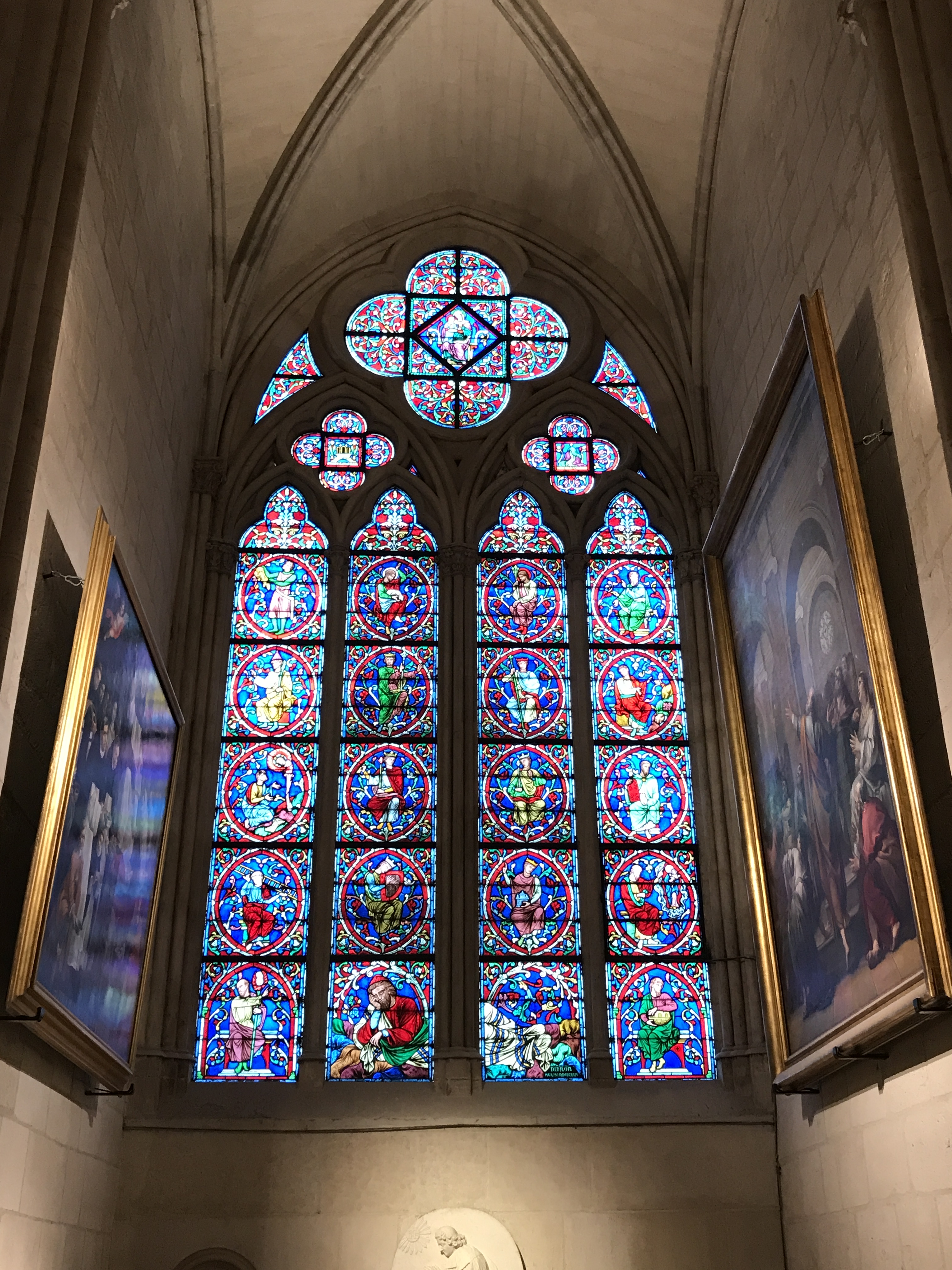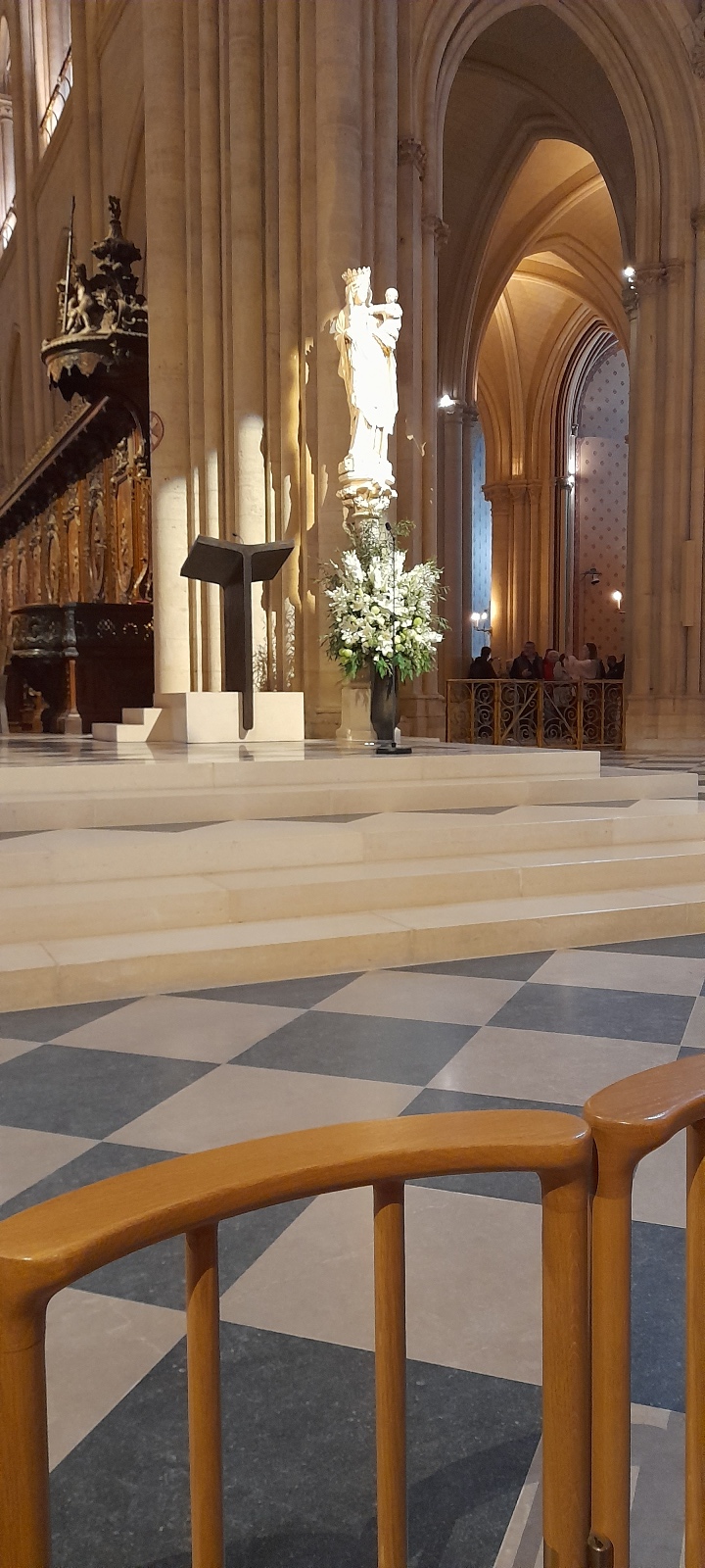 En fin d’après-midi, toujours à Notre-Dame, chacun a pu visiter, seul et à sa façon, l’intérieur de la cathédrale. Mais il y avait tellement de monde que la déambulation n’était pas aisée. Ce qui nous a frappés, c’est bien sûr la luminosité de la nef, le nouveau chœur liturgique … (certains aiment, d’autres moins ….), et les vitraux dont les grandes rosaces donnant sur les transepts. Contrairement à Chartres, à la cathédrale de Paris, 44% seulement des vitraux sont d’origine. Chacun a pu aussi déchiffrer le tour extérieur de l’arrière-chœur, qui comme à Chartres est une frise sculptée, en bois polychrome qui retrace les scènes de la vie du Christ. Voir sur le site de la cathédrale de Paris