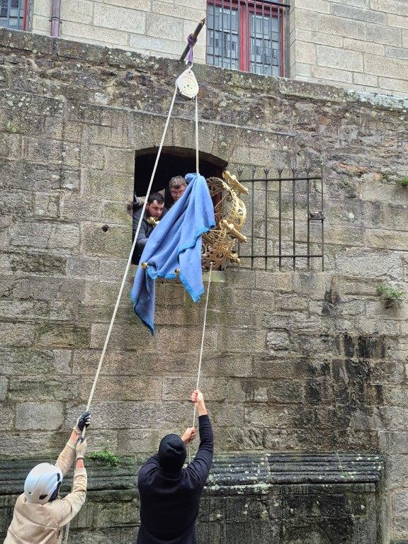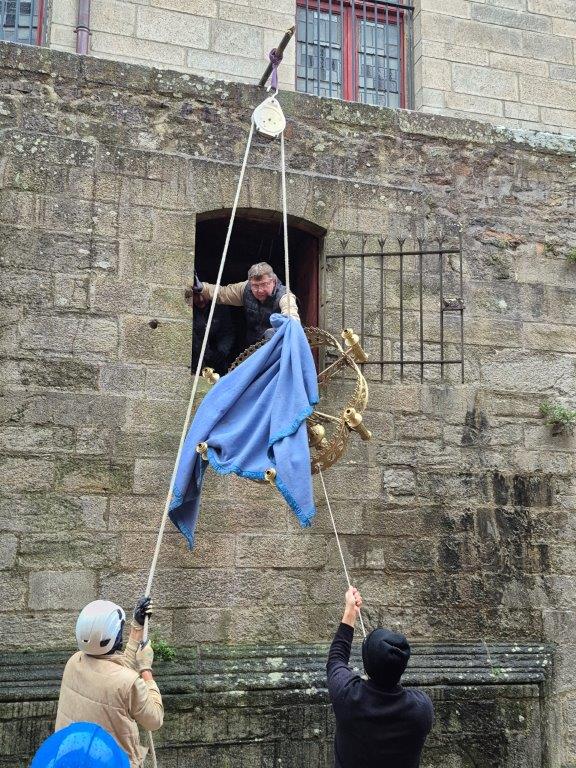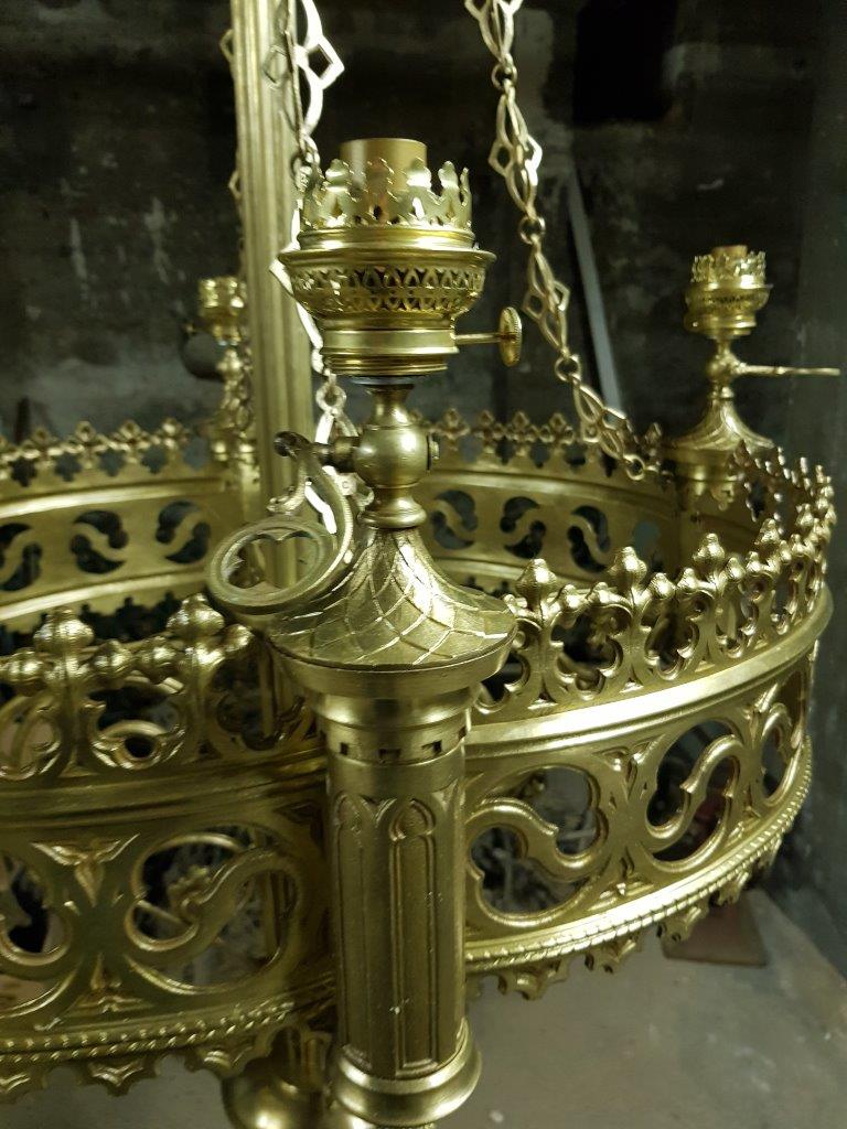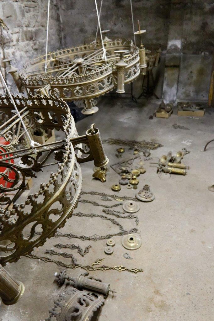 - Les lustres d'autrefois, en bronze doré, ont été restaurés et sont revenus discrètement dans la cathédrale par les ouvertures donnant sur la rue Saint Guénael. Ils restent pour l'instant entreposés.