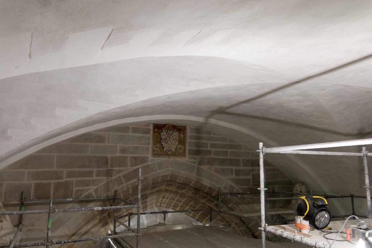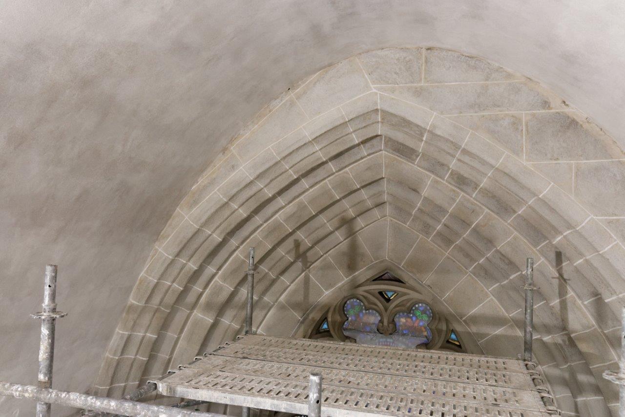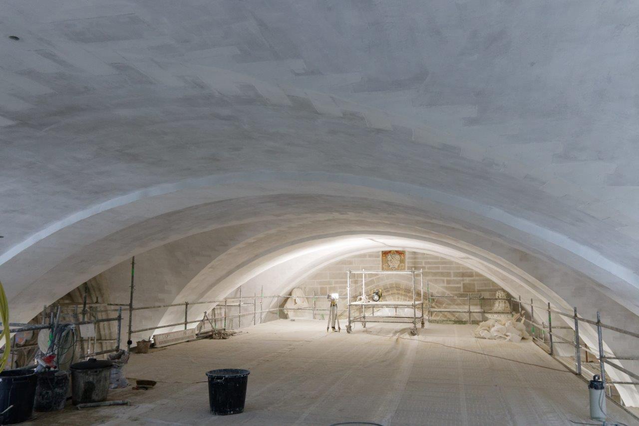 - Les voûtes de la nef centrale sont en partie restaurées. Comme on le voit, certaines arêtes ogivales ont nécessité le remplacement délicat de quelques pierres.