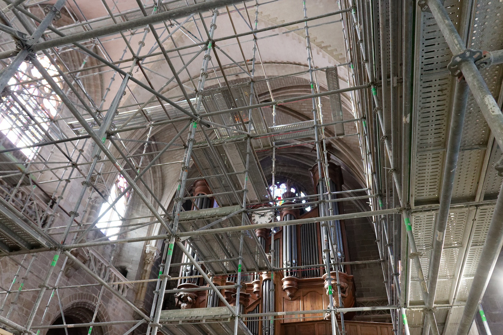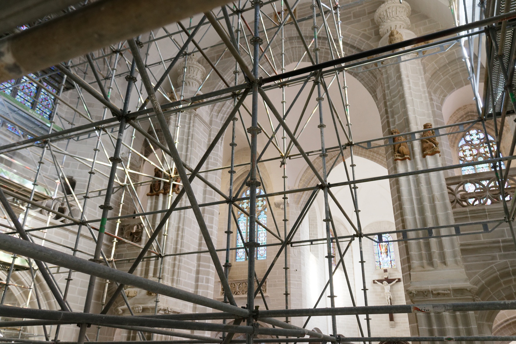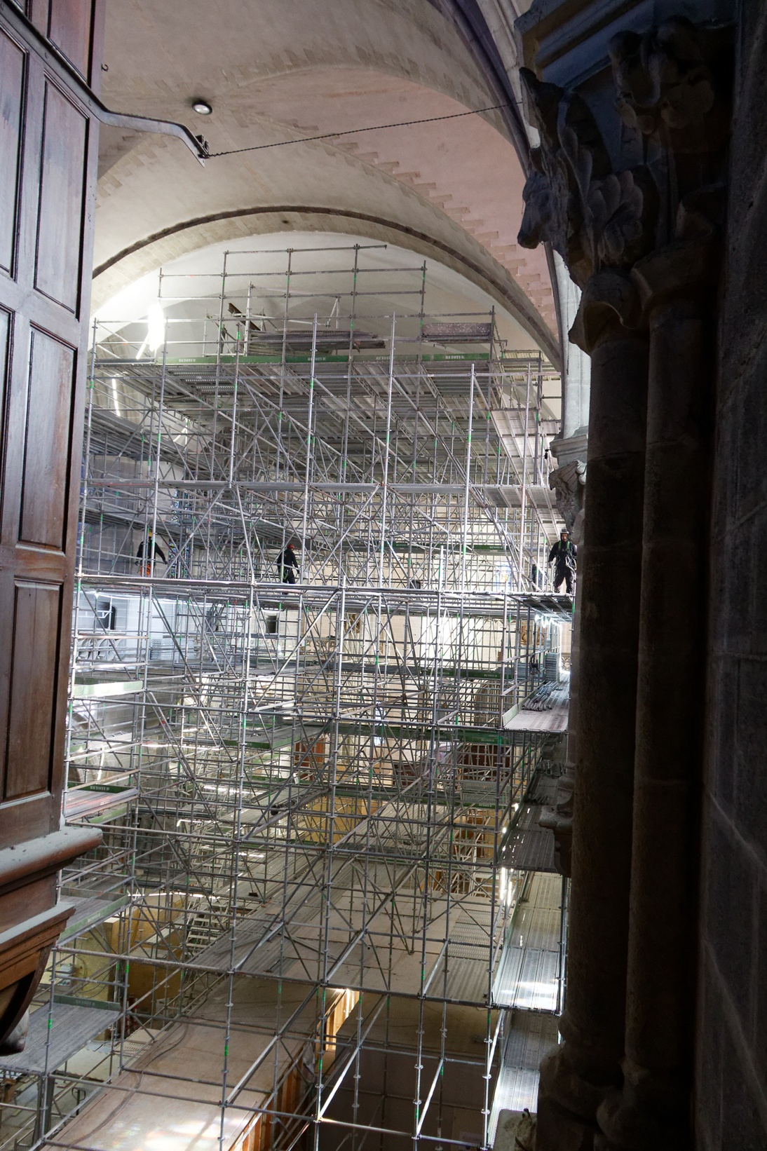 Malgré le démontage de la moitié des échafaudages, ceux qui restent afin de poursuivre les travaux vers la tribune de l'orgue, sont vraiment impressionnants ! Une vraie forêt de tubes métalliques.