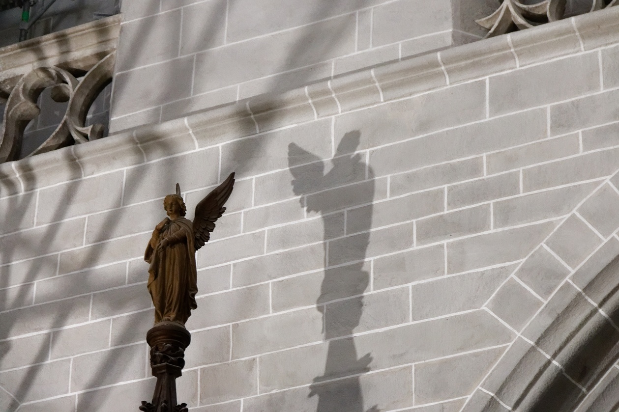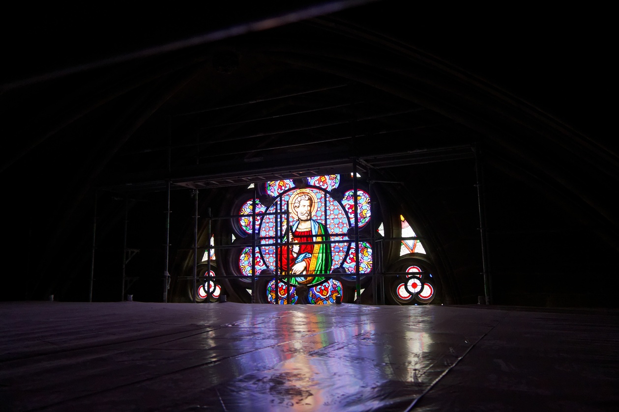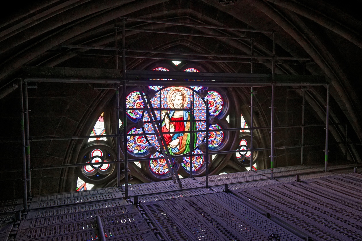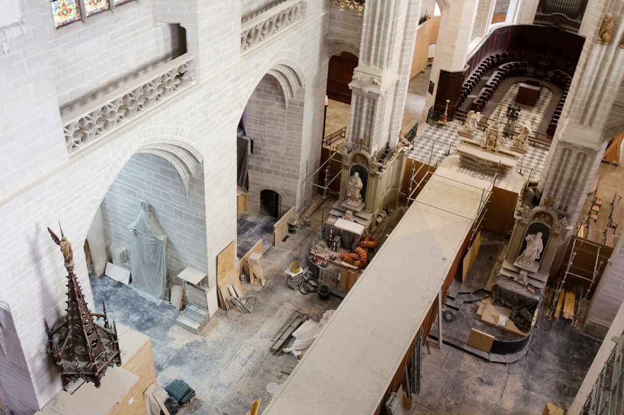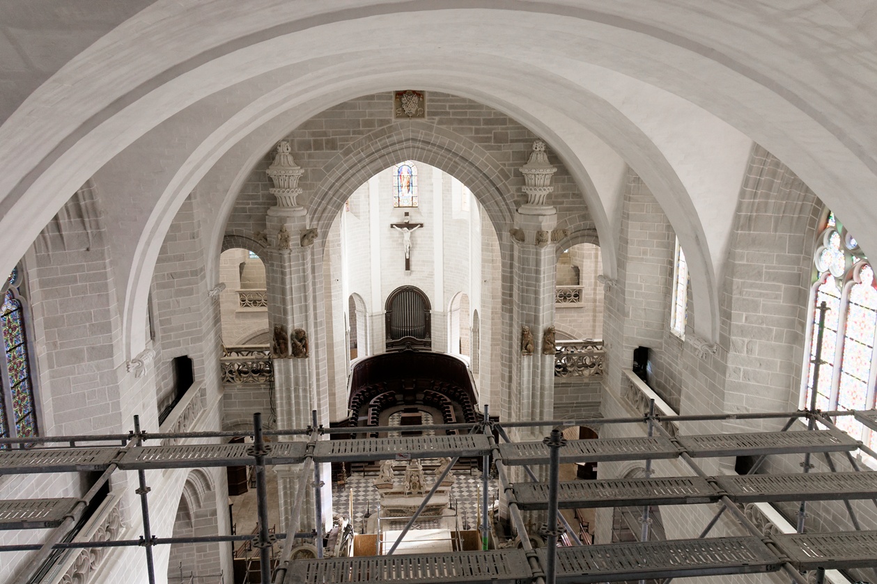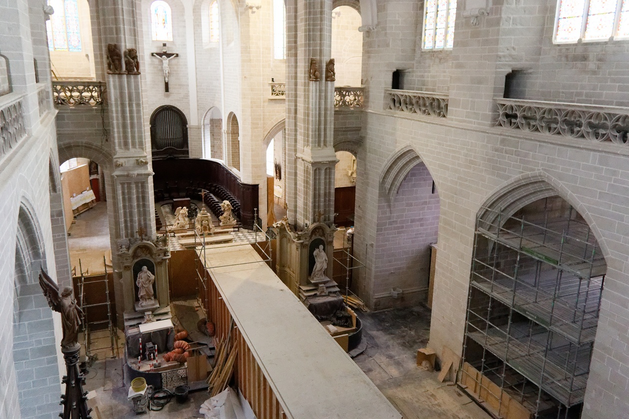 Les échafaudages se retirent progressivement de la nef et laissent entrevoir le magnifique travail réalisé sur les pans de murs dont la blancheur retrouvée s'harmonise maintenant avec l'arrière-choeur que l'on aperçoit tout au fond.