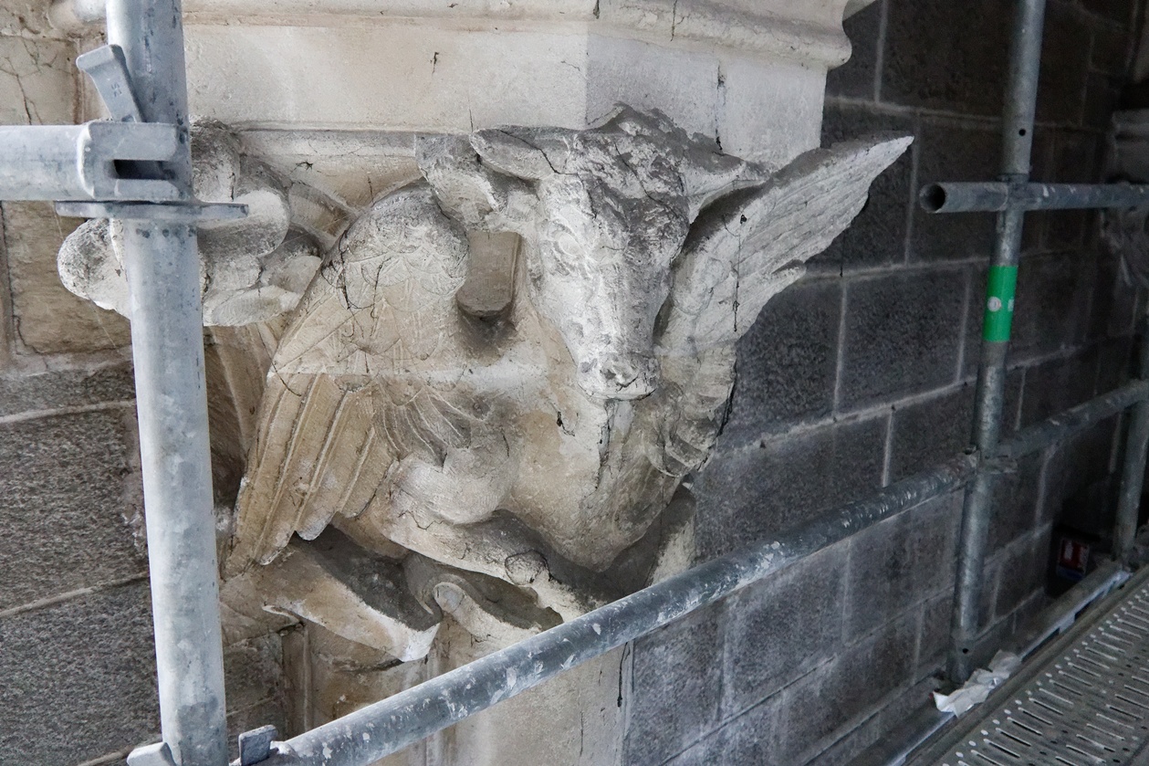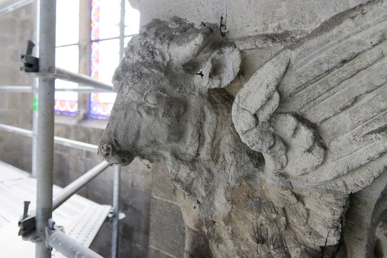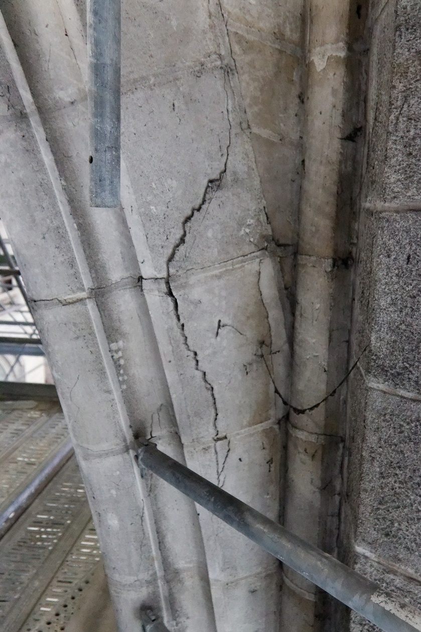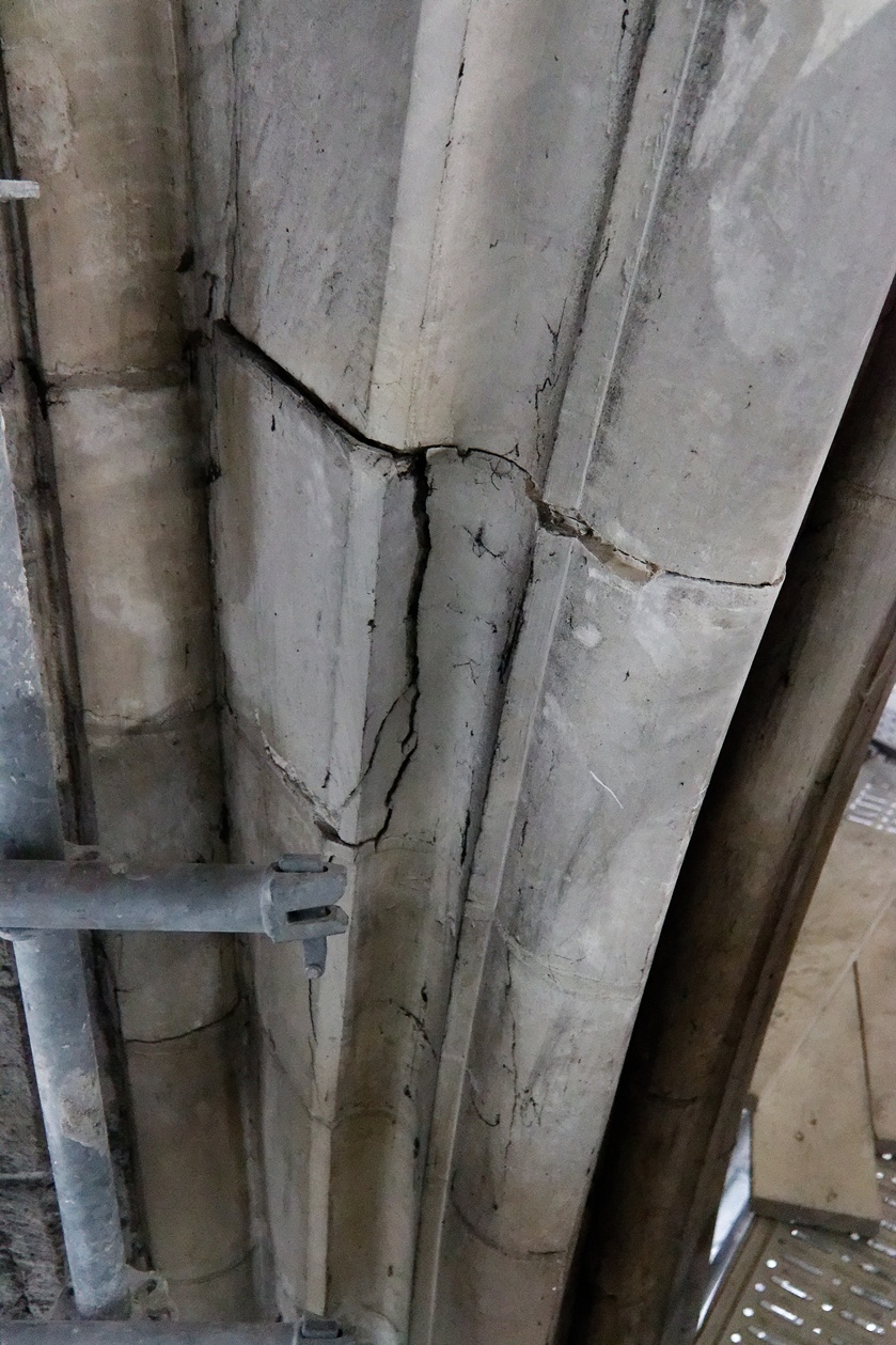 Il reste encore des fissures à reprendre sur quelques montants des voûtes et plusieurs scupltures bien abimées au sommet des piliers.