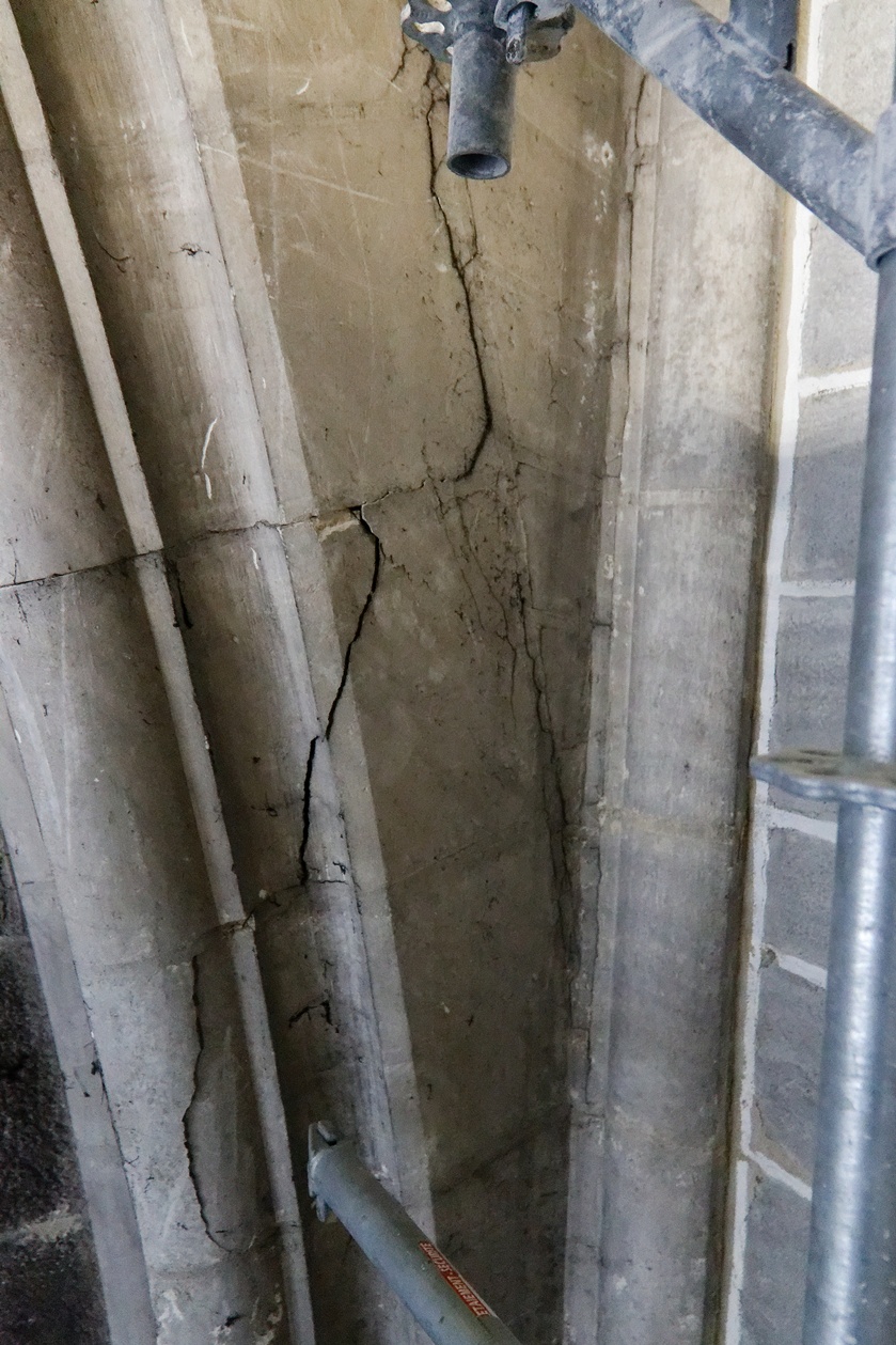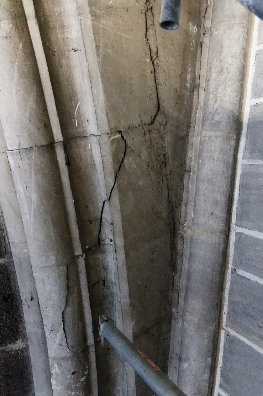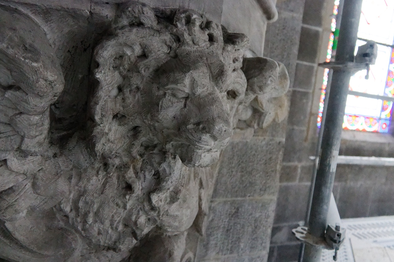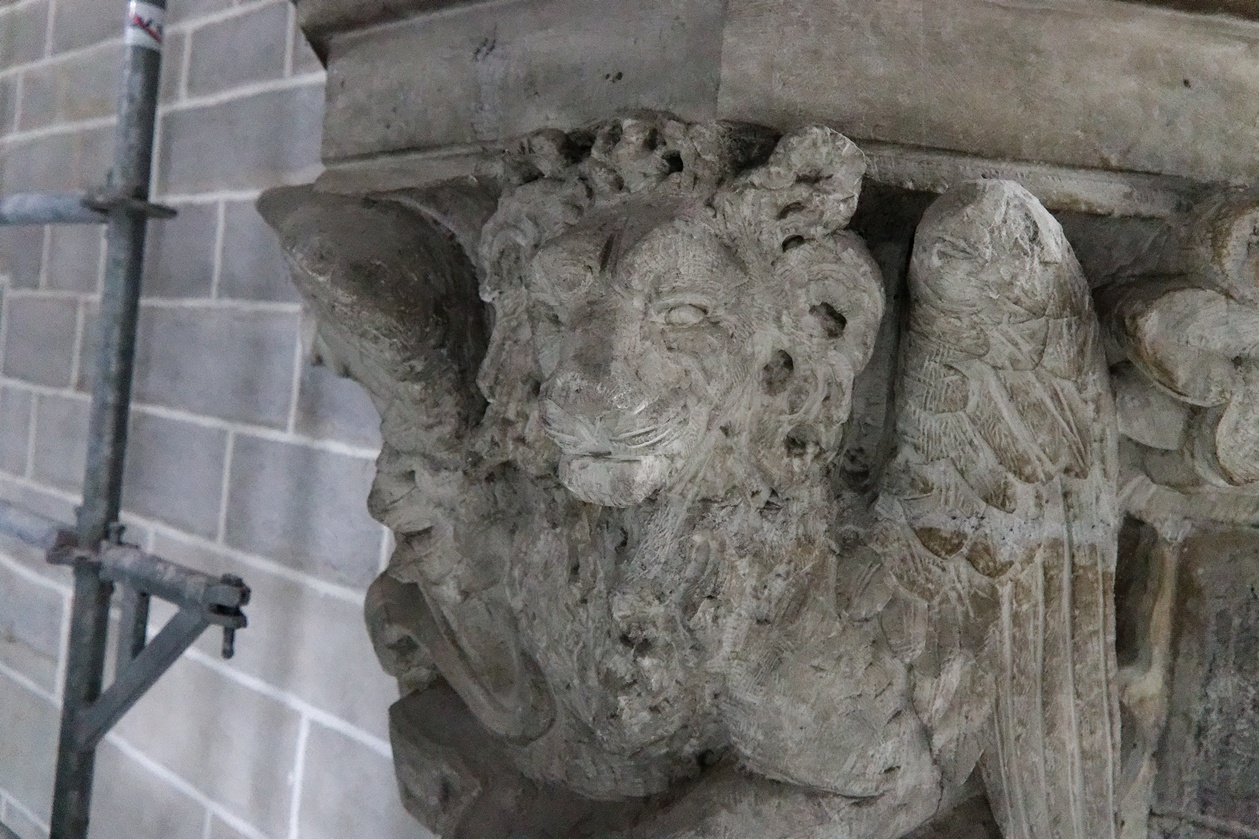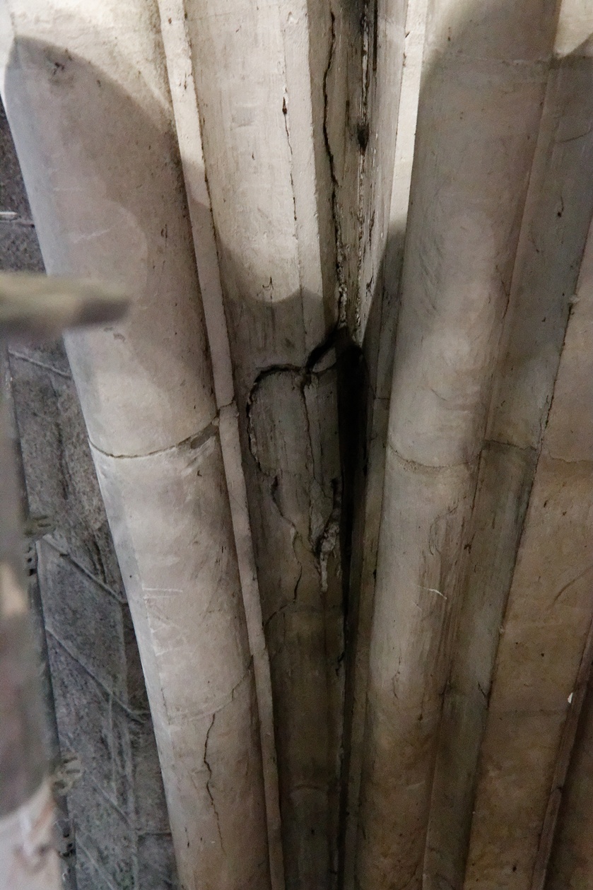 Il reste encore des fissures à reprendre sur quelques montants des voûtes et plusieurs scupltures bien abimées au sommet des piliers.