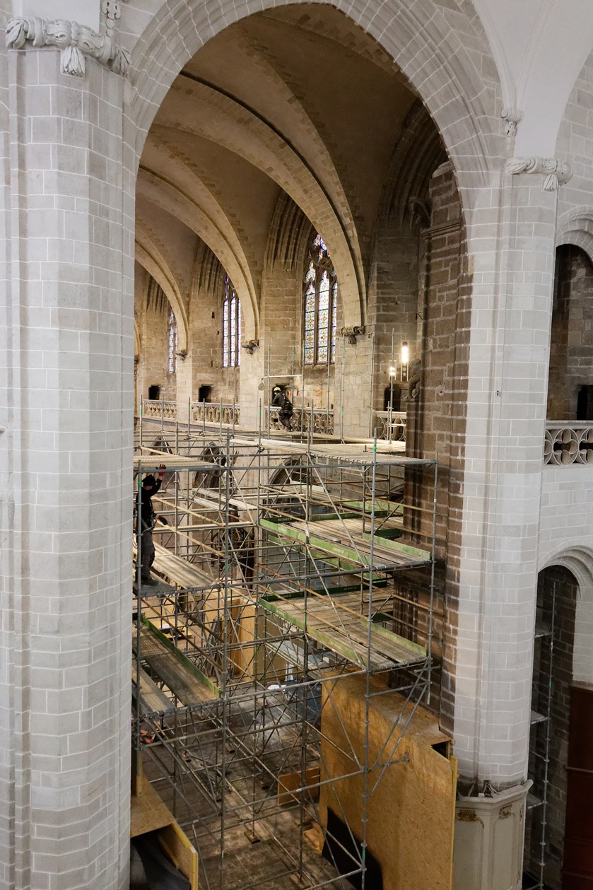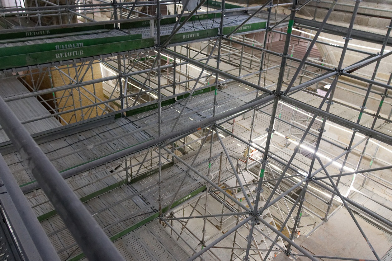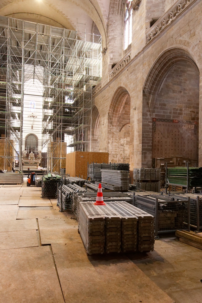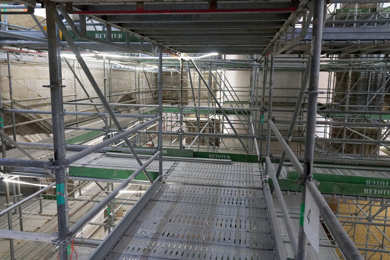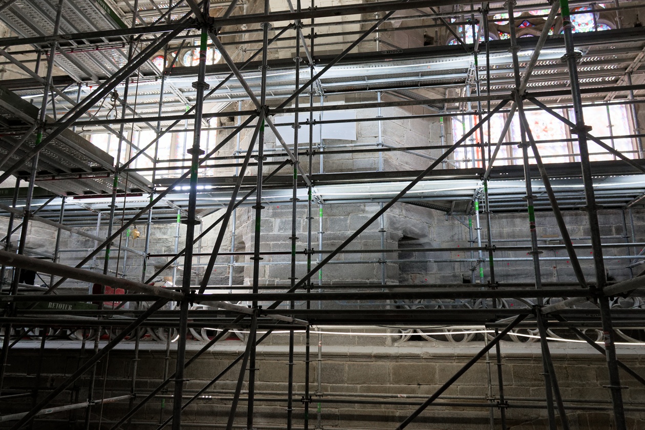 Tout d'abord, voici un aperçu des impressionnants échafaudages qui occupent toute la nef et au dessus du tunnel en contreplaqué installé en juin, permettant ainsi la déambulation des visiteurs et des priants, vers les transepts rénovés et l'abside.