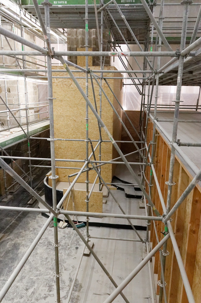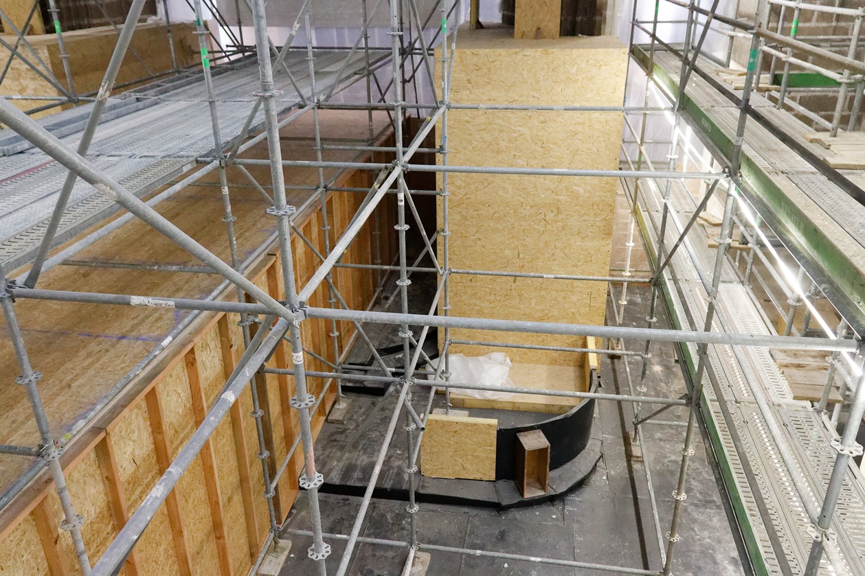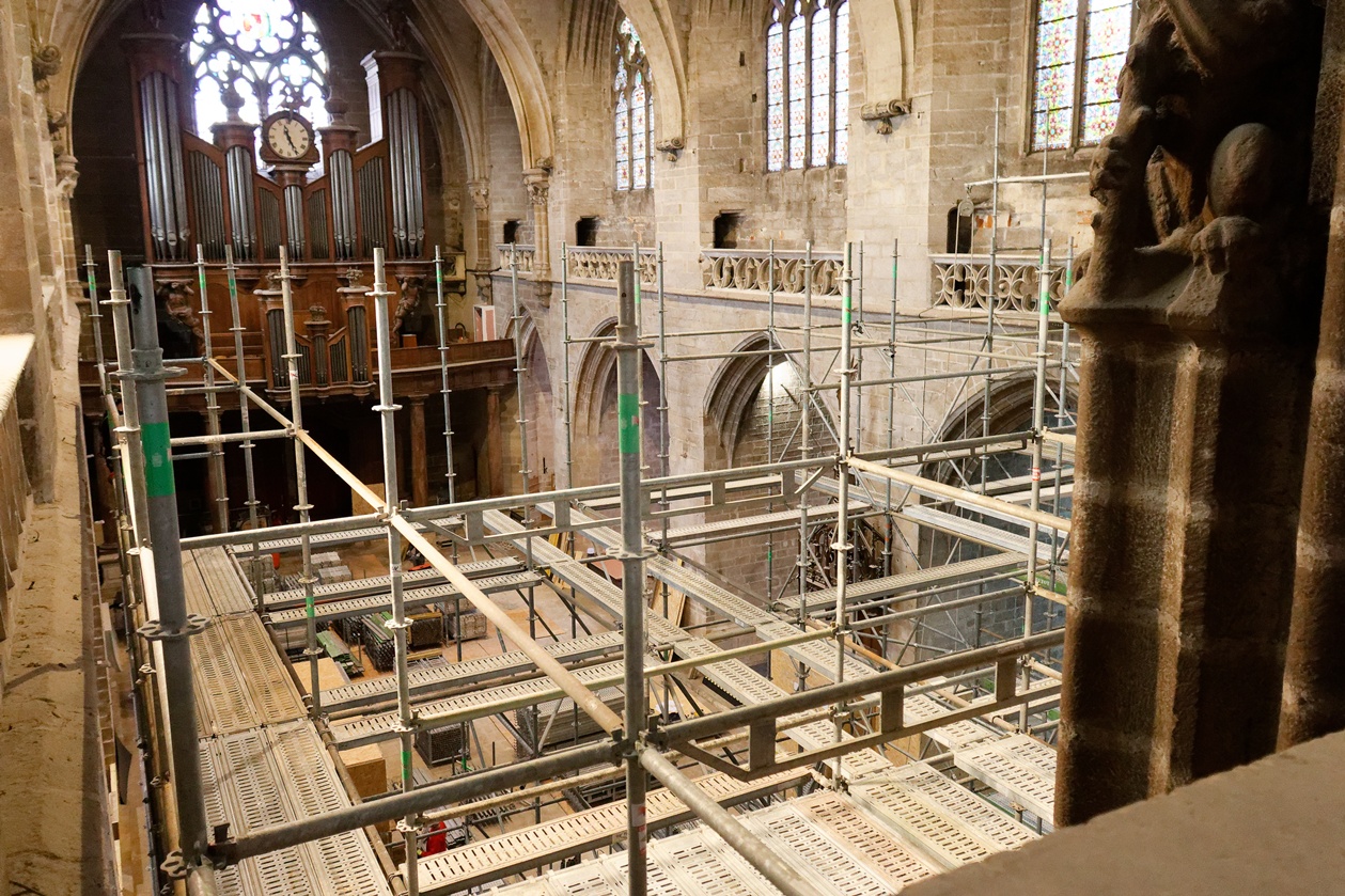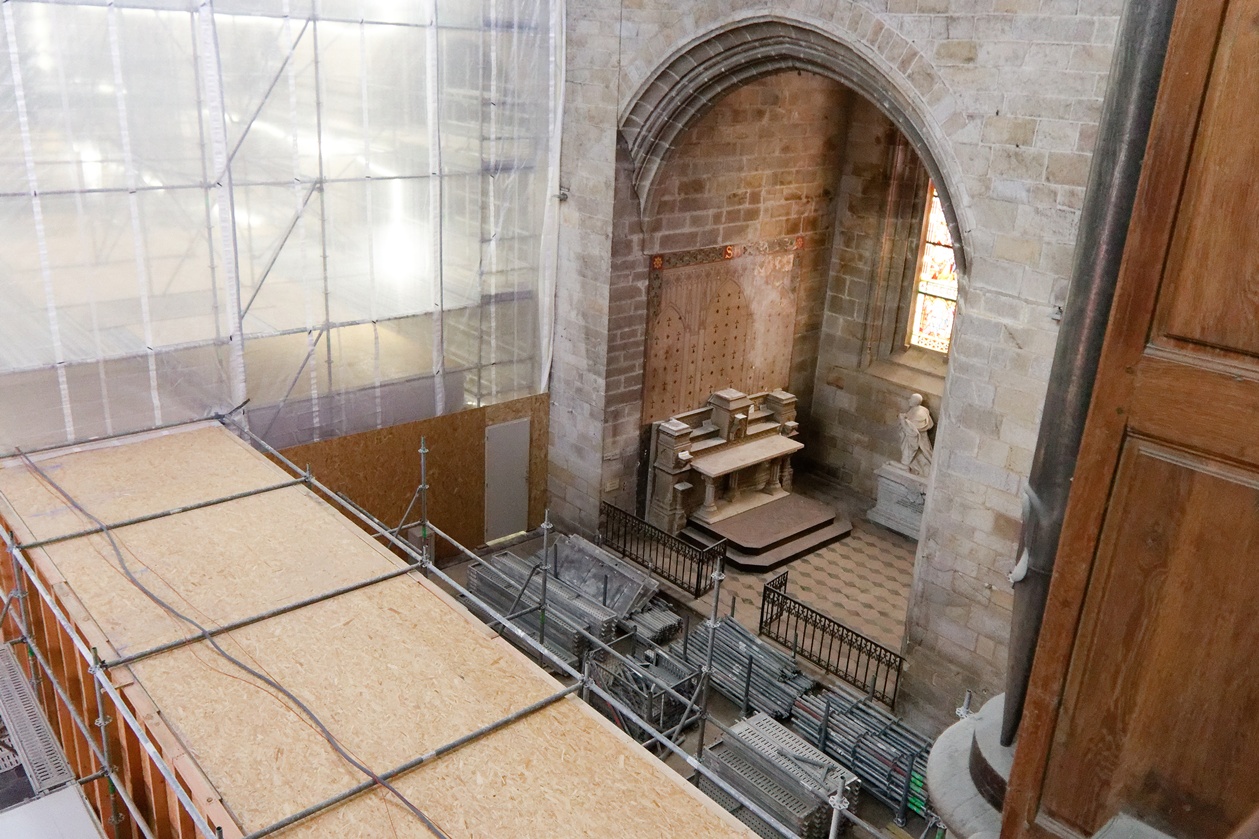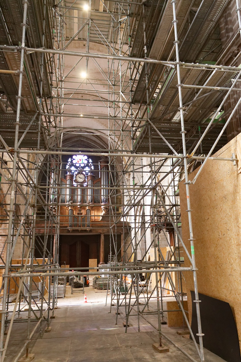 Tout d'abord, voici un aperçu des impressionnants échafaudages qui occupent toute la nef et au dessus du tunnel en contreplaqué installé en juin, permettant ainsi la déambulation des visiteurs et des priants, vers les transepts rénovés et l'abside.