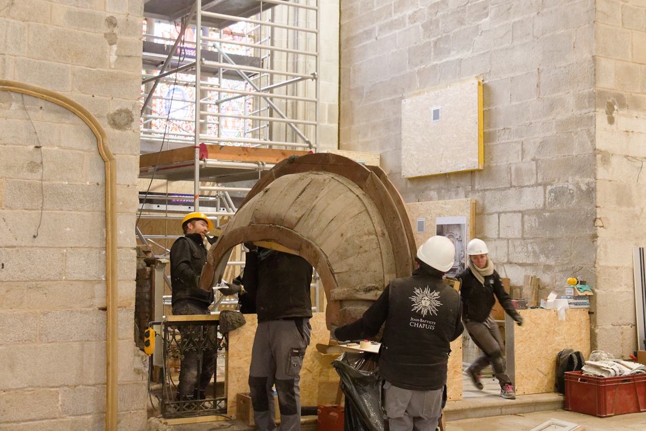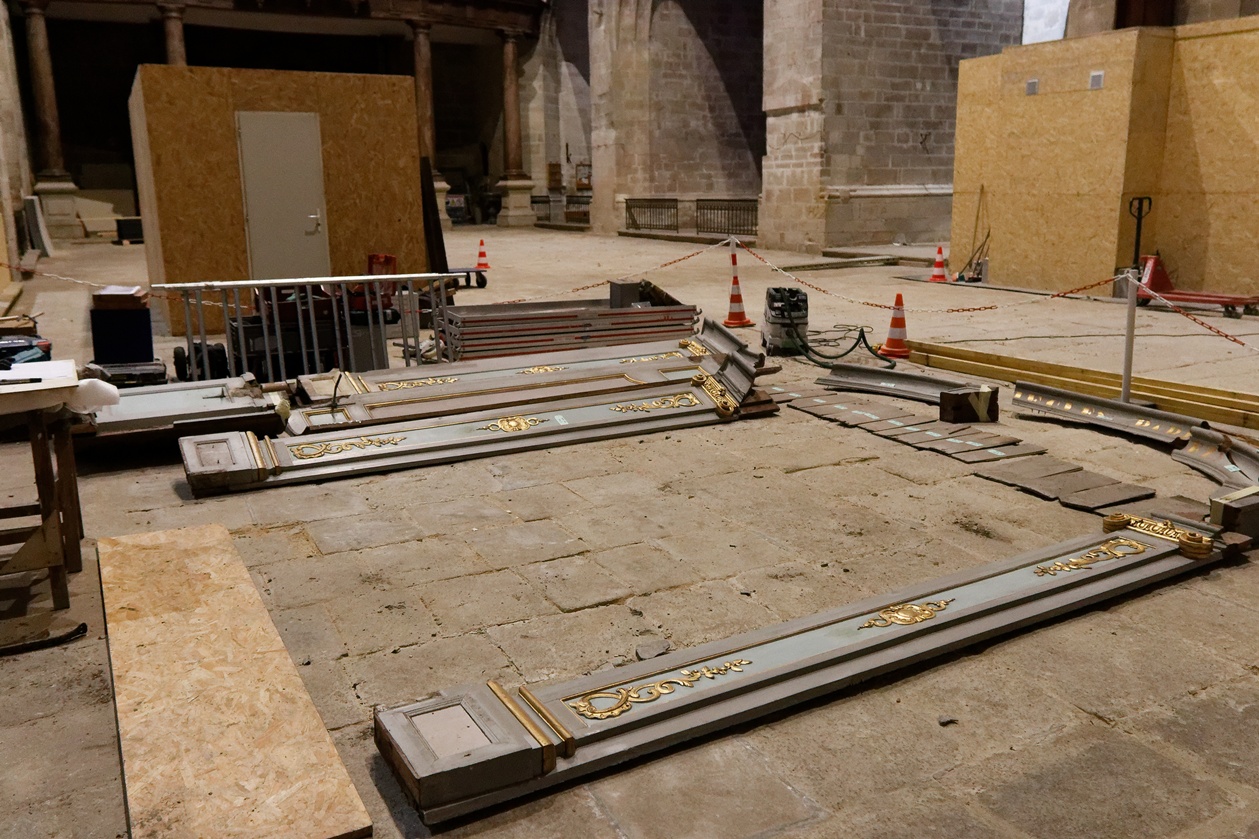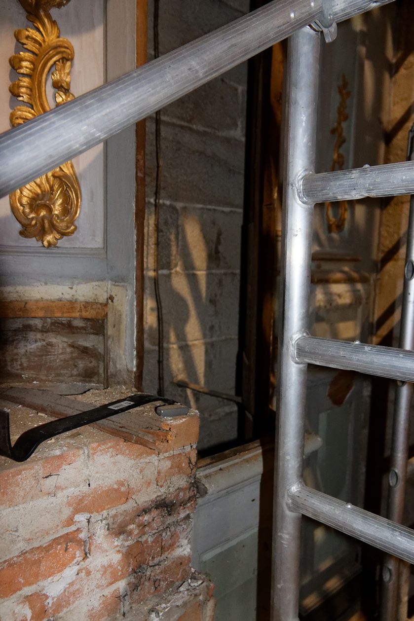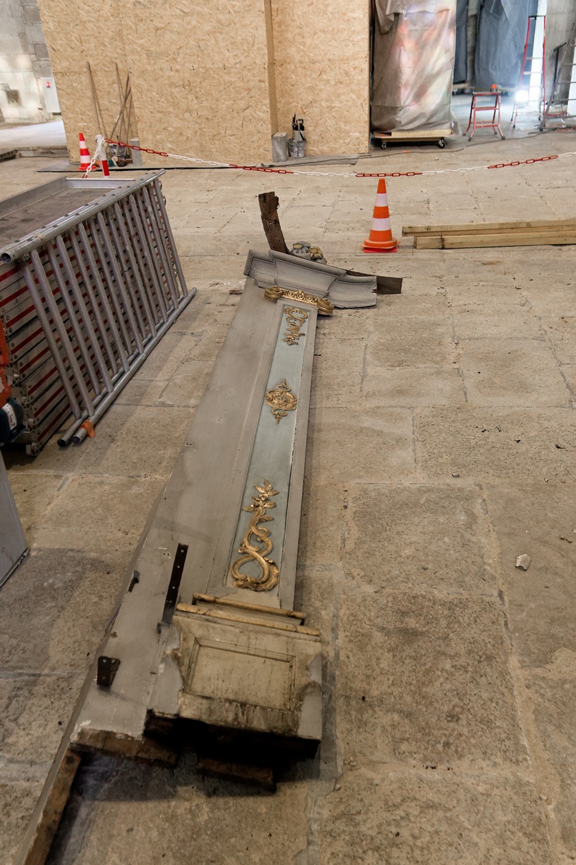 On n'imagine pas les allées et venues que nécessitent un tel chantier de restauration, pour déposer les boisieries, dans l'ordre afin de n'en perdre aucune, et pour le faire avec précaution ! Monter, descendre ... manoeuvrer, et recommencer.