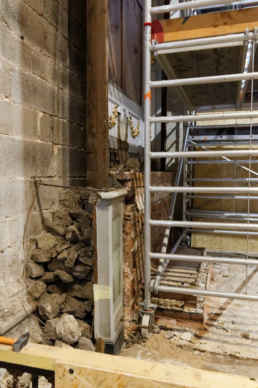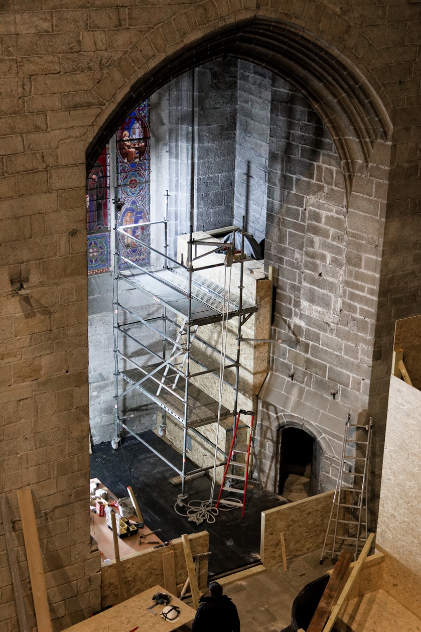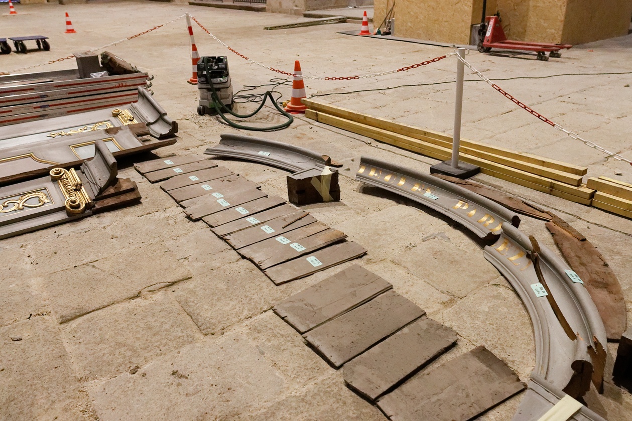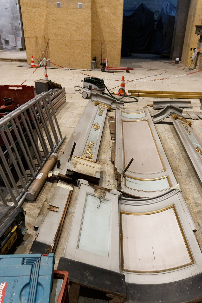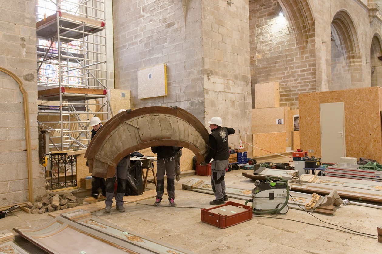 On n'imagine pas les allées et venues que nécessitent un tel chantier de restauration, pour déposer les boisieries, dans l'ordre afin de n'en perdre aucune, et pour le faire avec précaution ! Monter, descendre ... manoeuvrer, et recommencer.