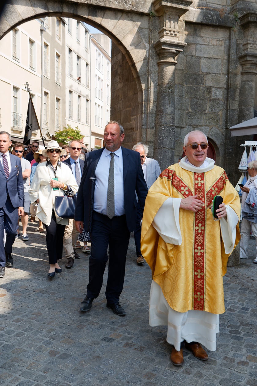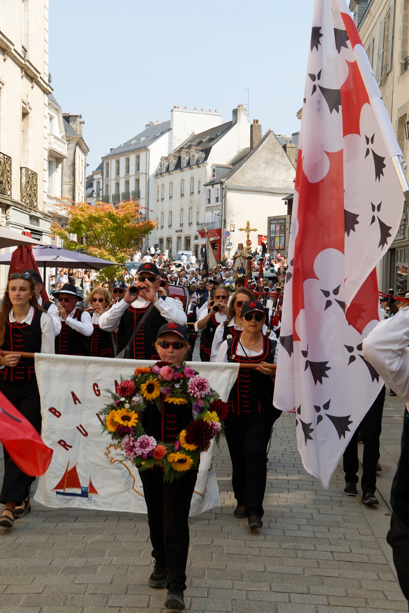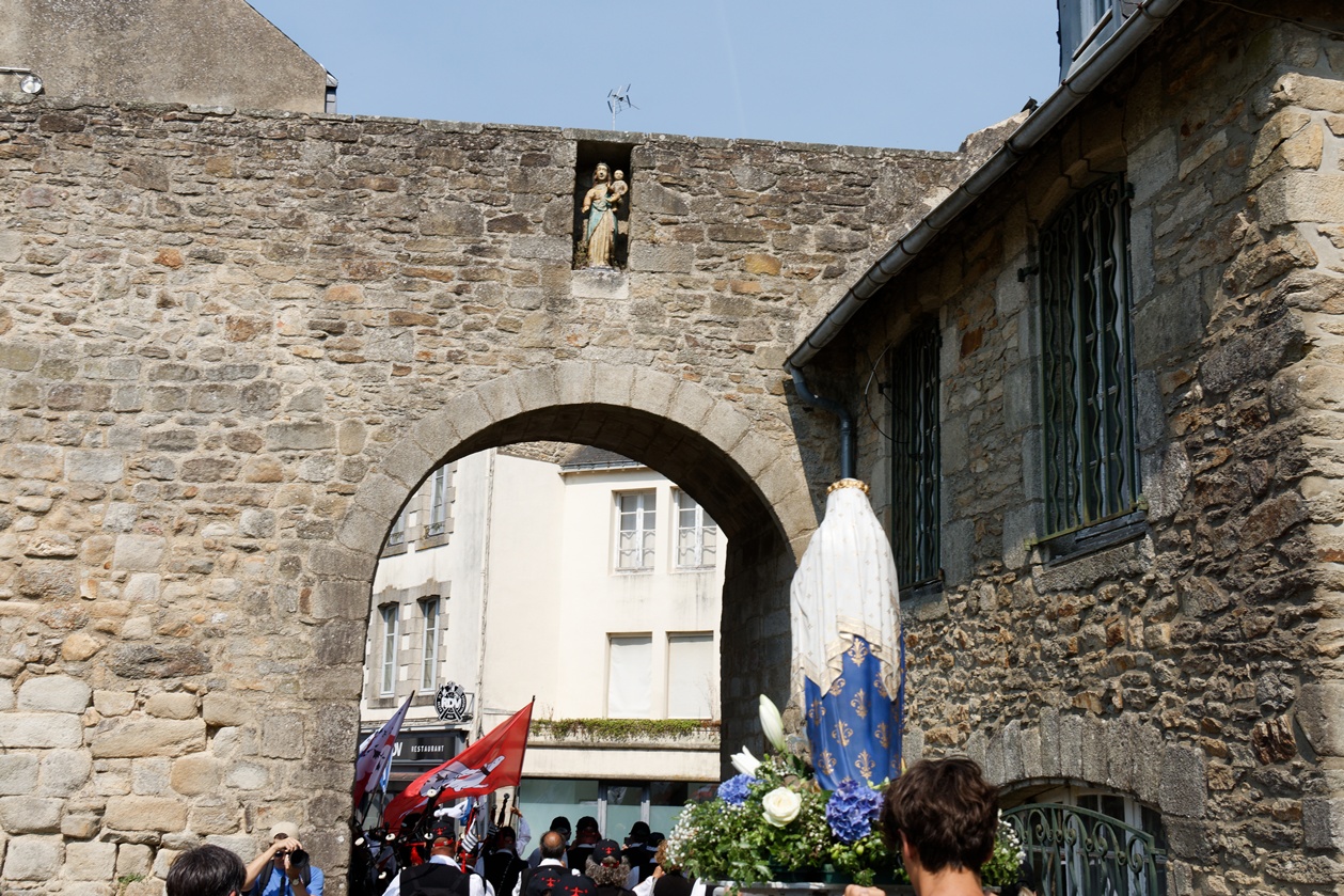 La mission s'est faite toute seule avec la liturgie !!! Puis, comme chaque année la procession s'est mise en marche vers le port, en passant par la places des Lices, puis la Porte Saint-Vincent. Drapeaux et bannières au vent, précédant la statue de Marie, Reine de l'Arvor, la foule derrière les prêtres et les servants d'autel, se sont regroupés pour la bénédiction de la mer et notre maire a lancé la couronne de fleurs dans les eaux du port.