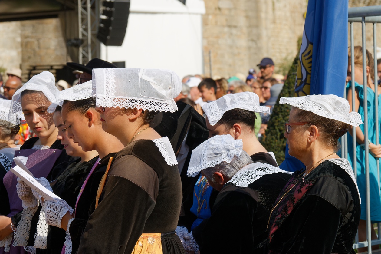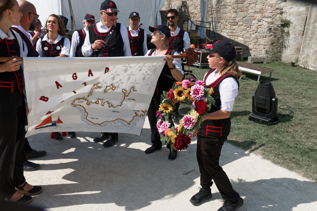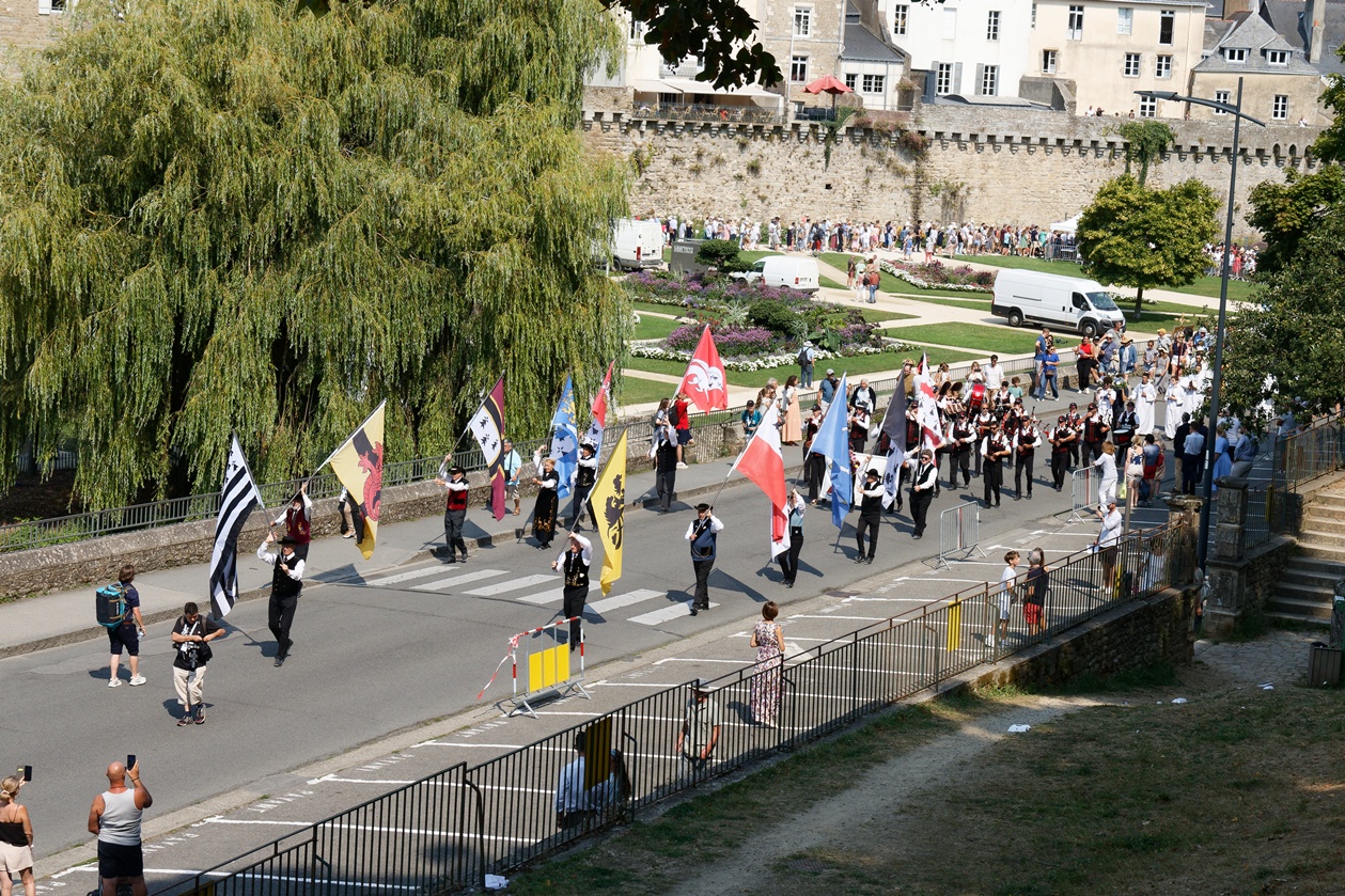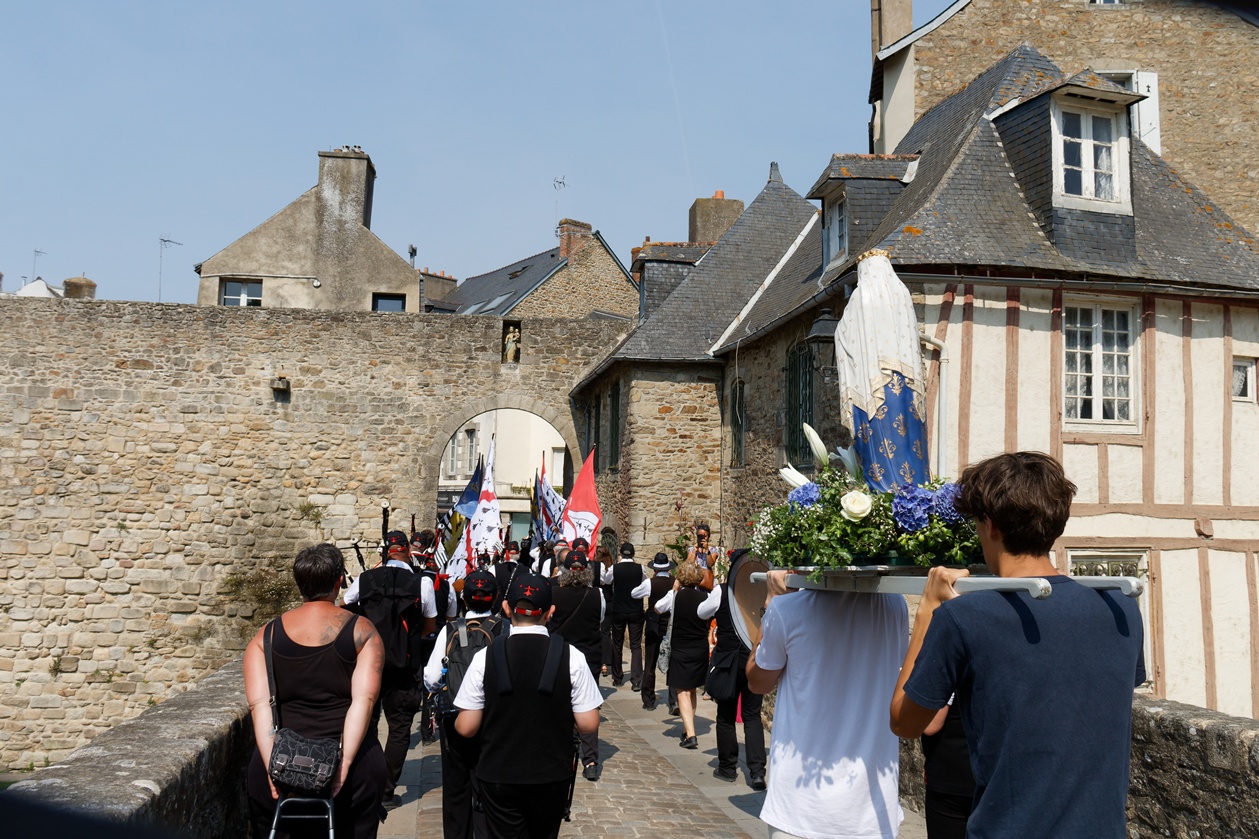La mission s'est faite toute seule avec la liturgie !!! Puis, comme chaque année la procession s'est mise en marche vers le port, en passant par la places des Lices, puis la Porte Saint-Vincent. Drapeaux et bannières au vent, précédant la statue de Marie, Reine de l'Arvor, la foule derrière les prêtres et les servants d'autel, se sont regroupés pour la bénédiction de la mer et notre maire a lancé la couronne de fleurs dans les eaux du port.