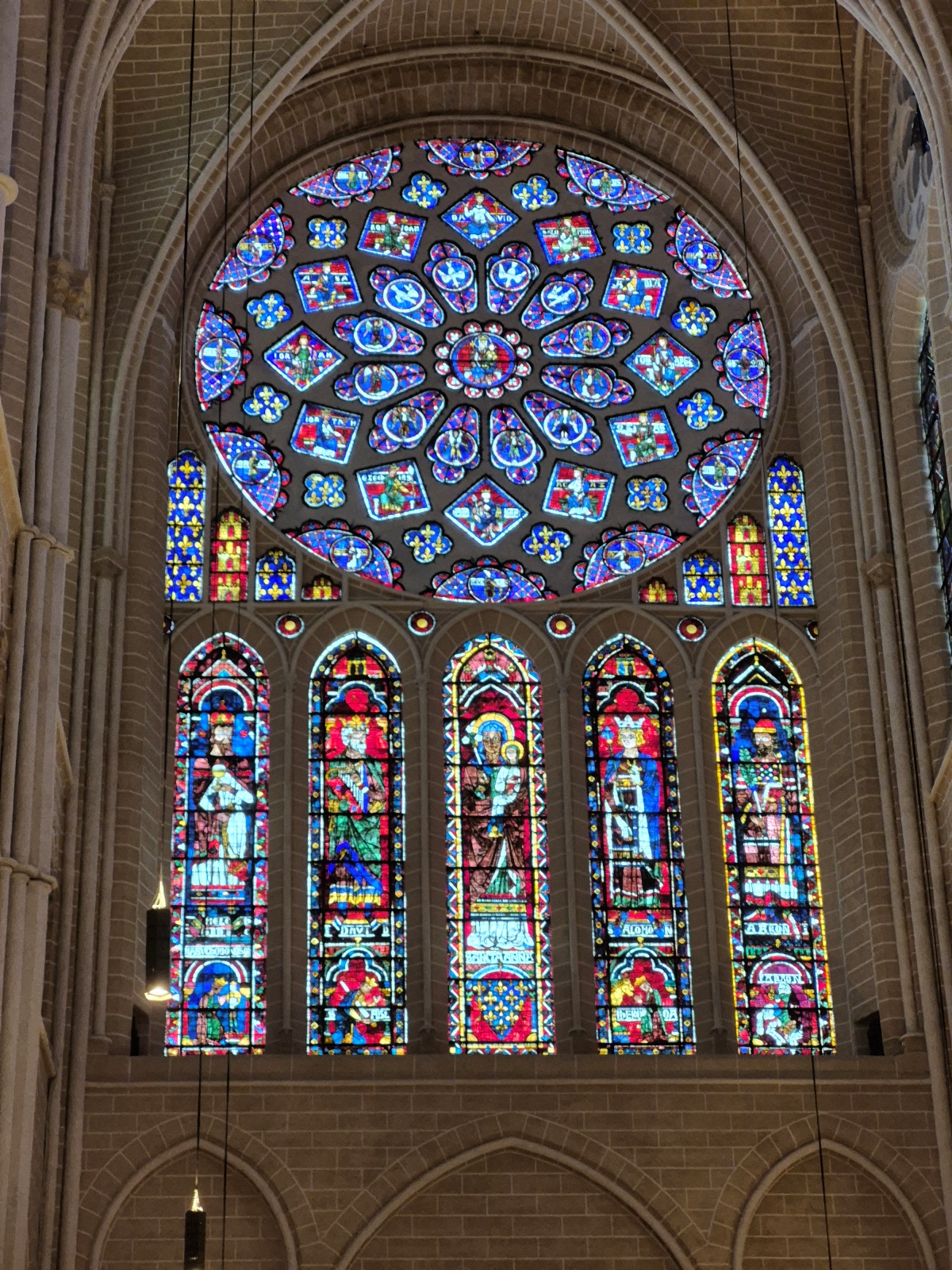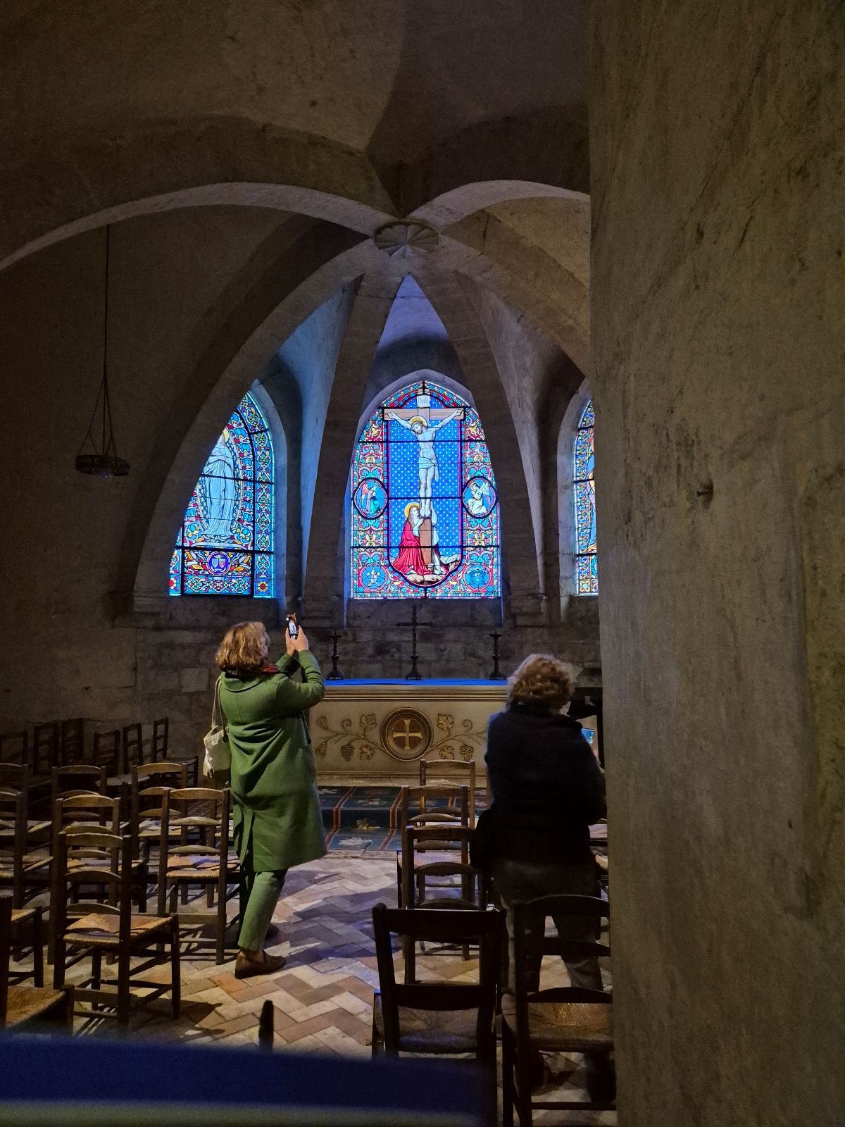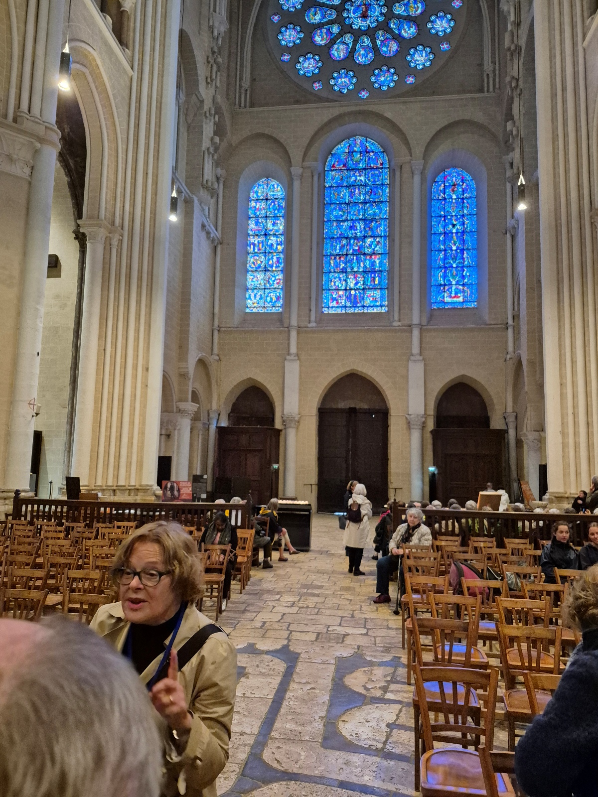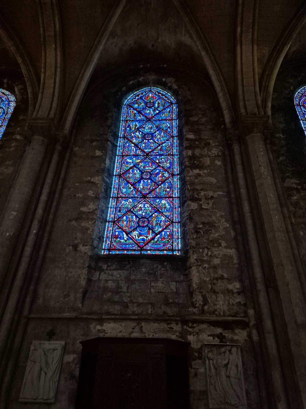 Nous avons été frappés par le bleuté des vitraux, qui, nous a-t-on dit, sont d’origine, à 90% ! Un bleu dit de Chartres.