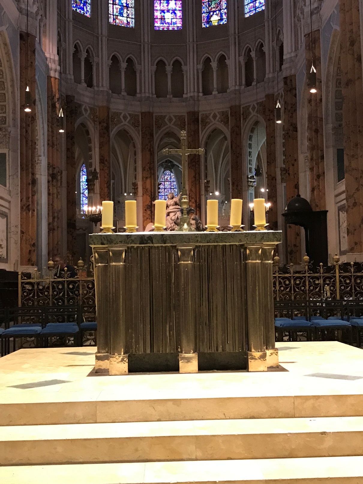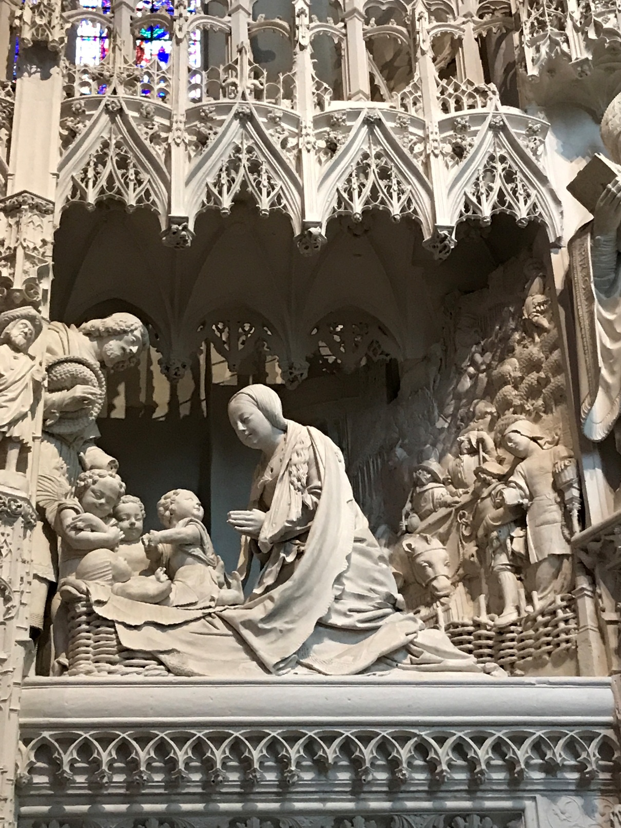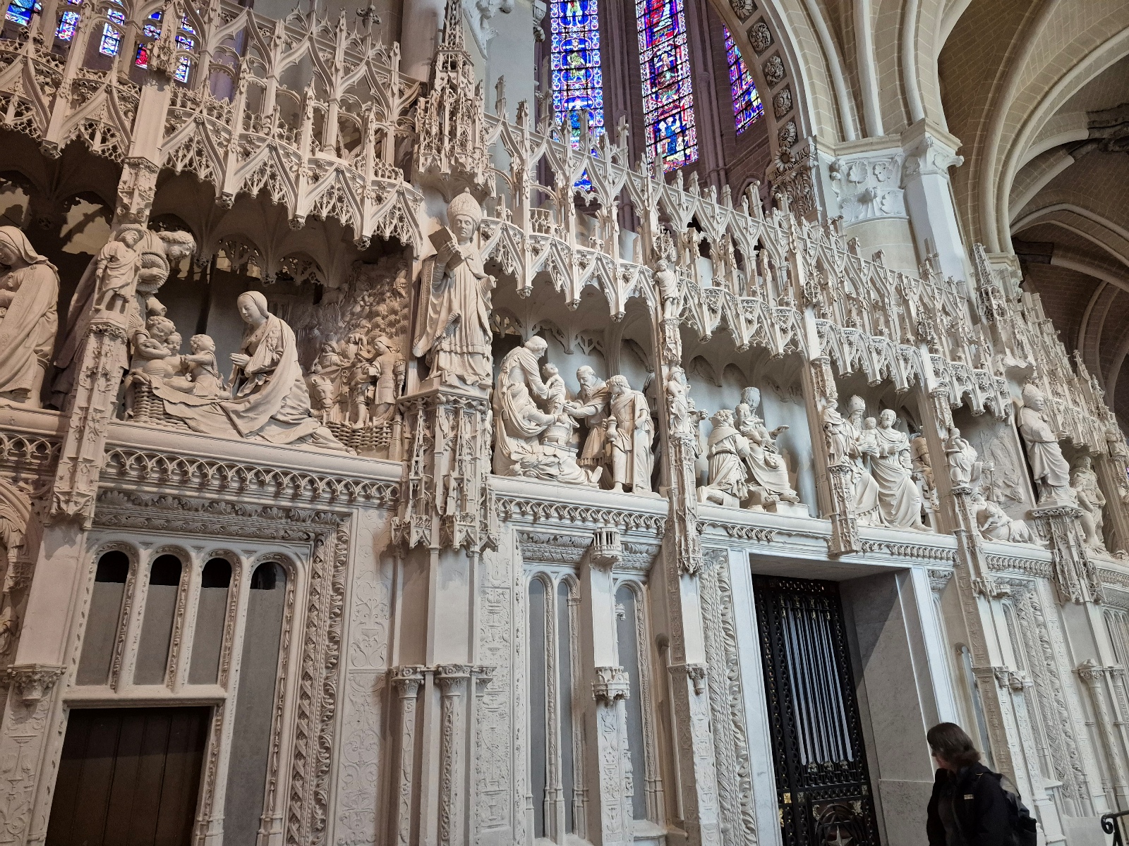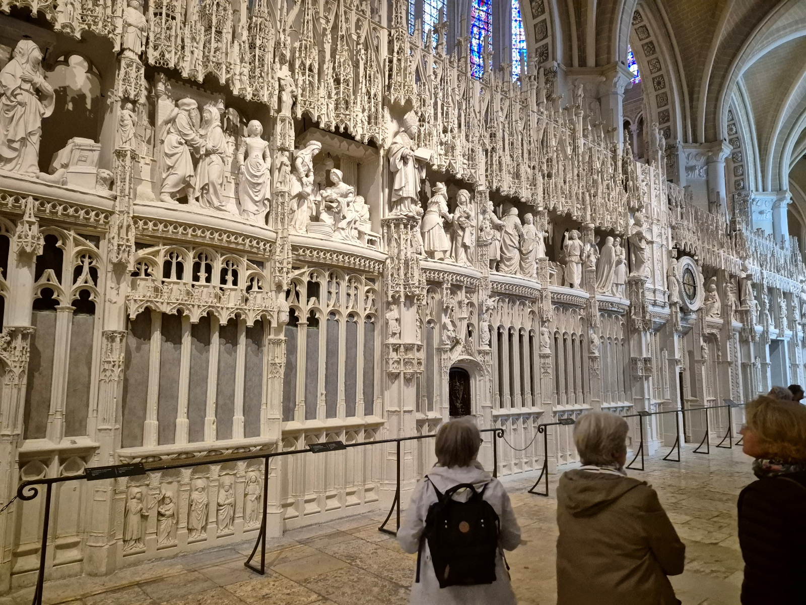 Aujourd'hui, la cathédrale a été presqu’entièrement rénovée, puisque seuls les murs intérieurs des bas-côtés n’ont pas été nettoyés puis blanchis au lait de chaux. Nous avons pu voir le nouveau mobilier liturgique, mais surtout nous avons été saisis par la beauté du tour extérieur du chœur, qui se présente comme une étonnante frise sculptée datant des années 1520-1530. Chapeau les artistes ! On pourrait comparer cette frise à une longue BD retraçant toutes les scènes de l’évangile. Une pure merveille !