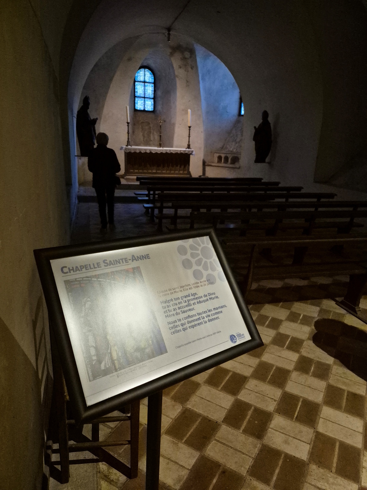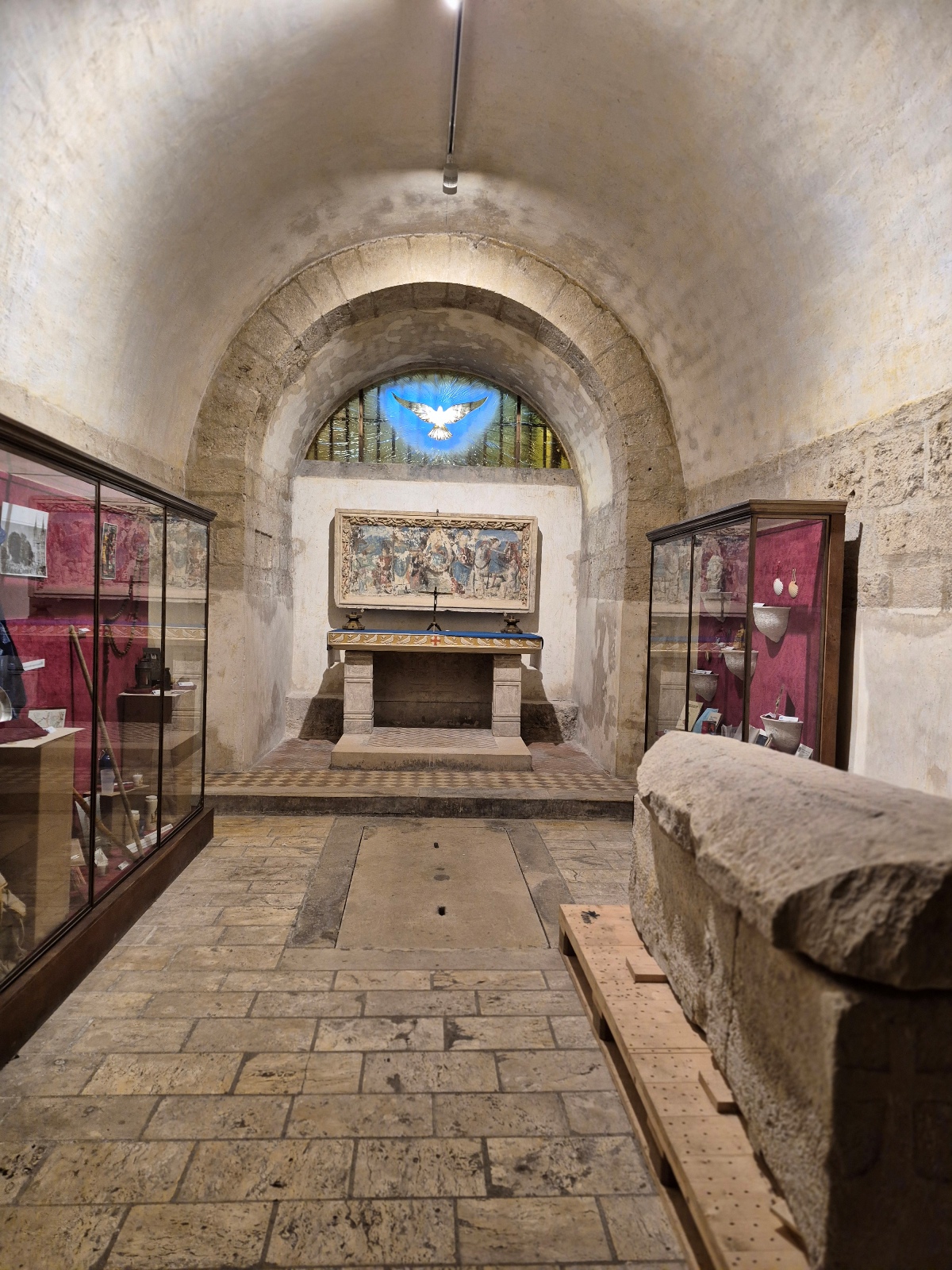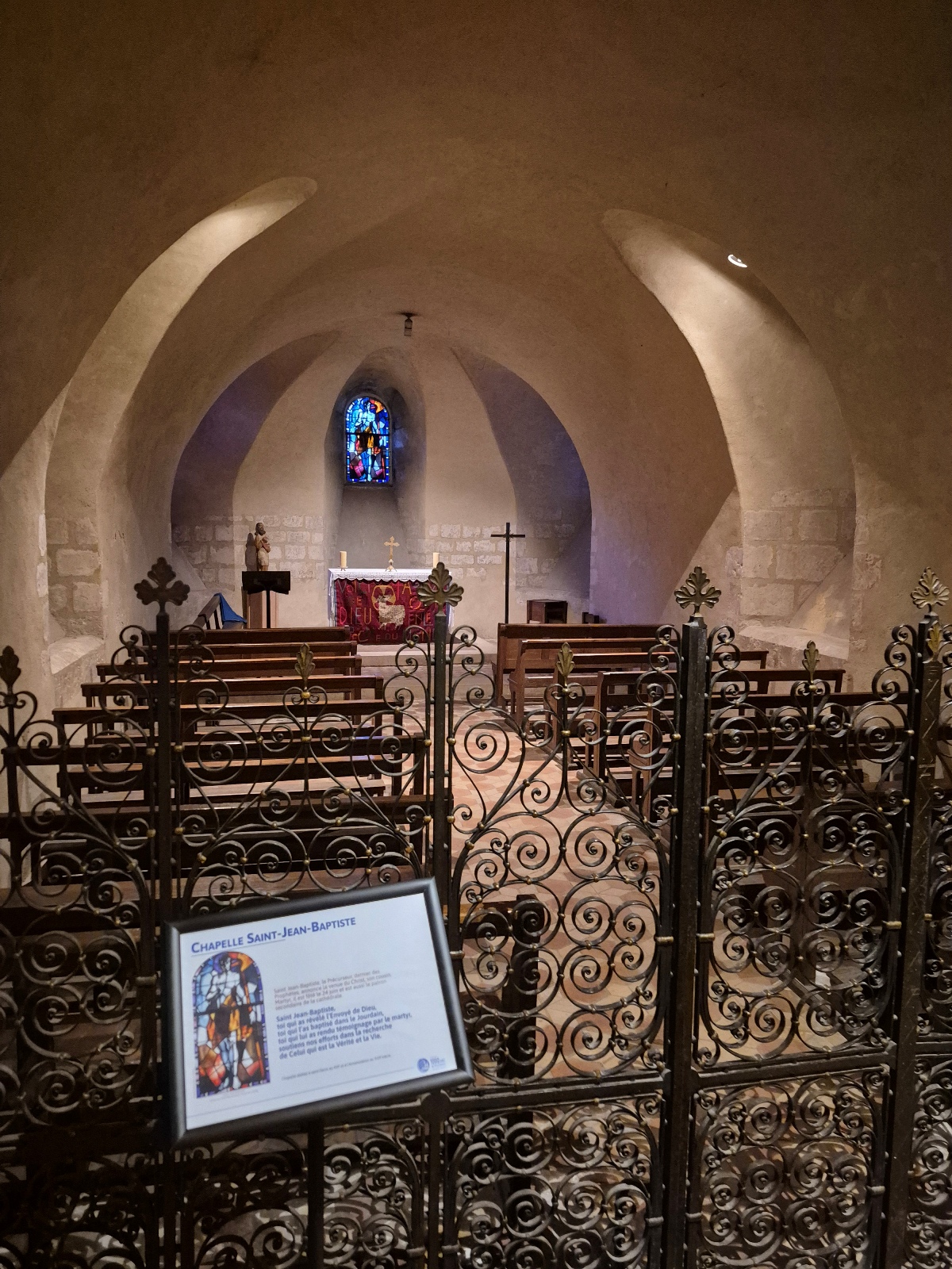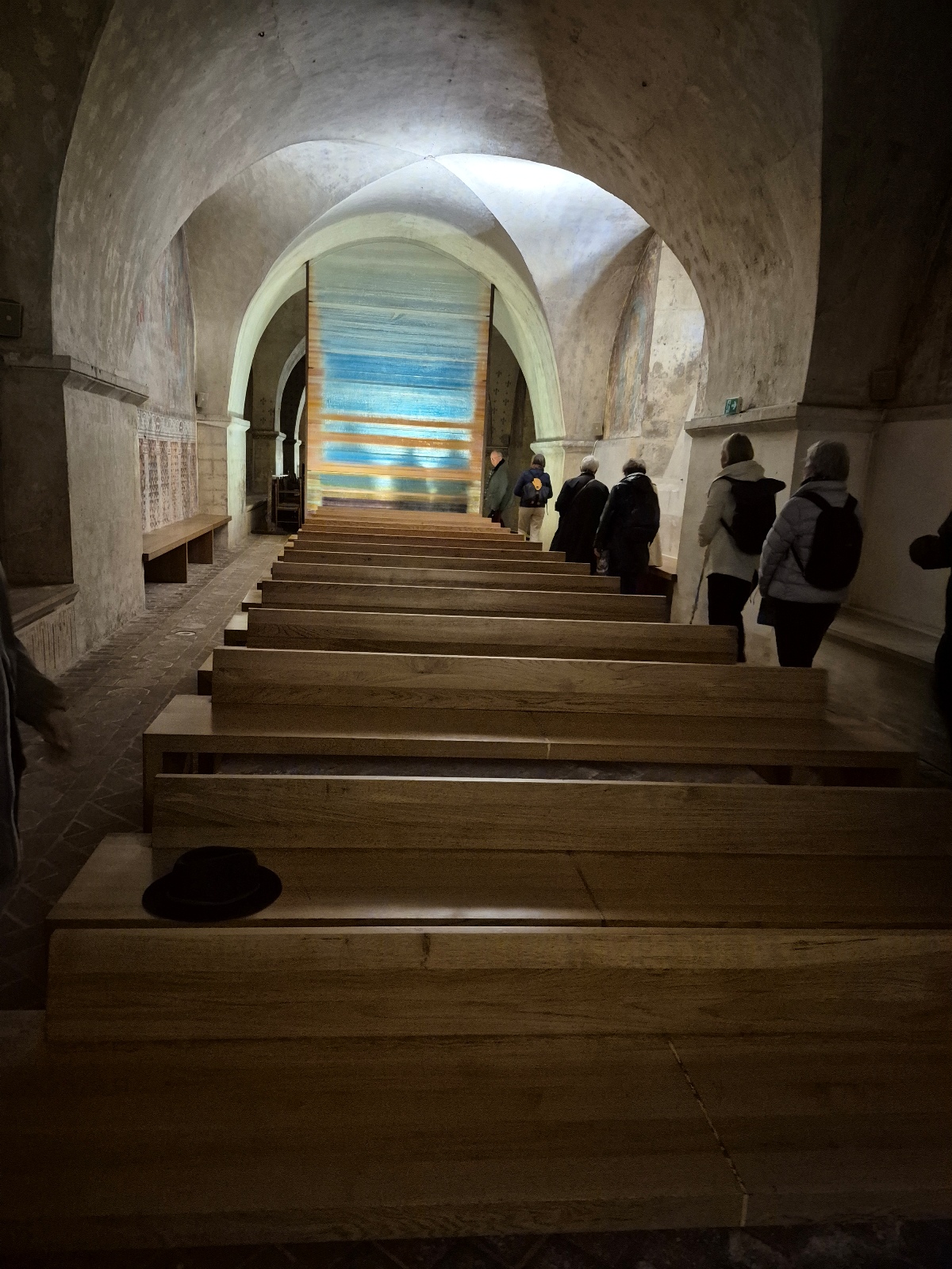 Il faut dire un mot de cette crypte qui fait 200 m de longueur et qui est aménagée comme une église souterraine : nef étroite, partitionnée en 2, l’une pour le côté cultuel, et l’autre pour le côté culturel. Cette église souterraine date de 1020.