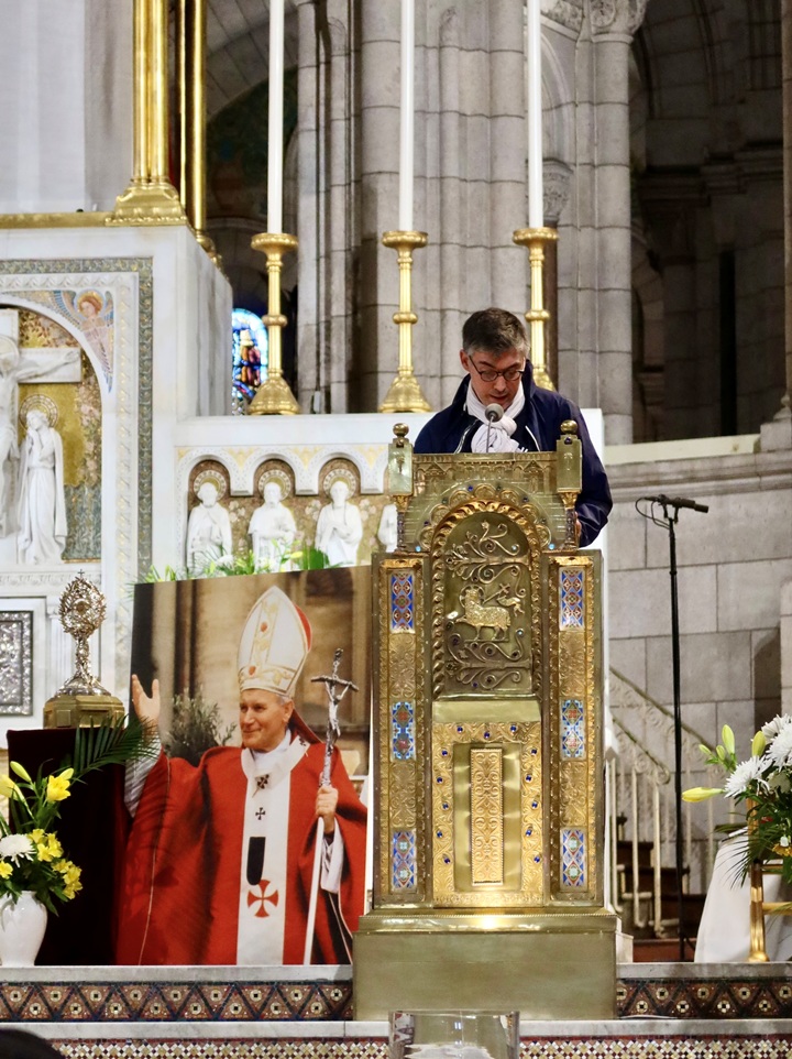 Nous avons eu la messe à 11 heures. Là encore, le père Patrice concélébrait, mais cette fois avec l’évêque de Valence, qui était de passage à Paris avec un groupe l’Enseignement Catholique de son diocèse. La messe était animée par les religieuses bénédictines de Montmartre. Voix cristallines ... et cerise sur le gâteau, nous fêtions liturgiquement notre cher Saint Jean-Paul II, qui était venu à Sainte Anne d’Auray le 16 septembre 2016. Beaucoup parmi nous s’en souvenaient encore.