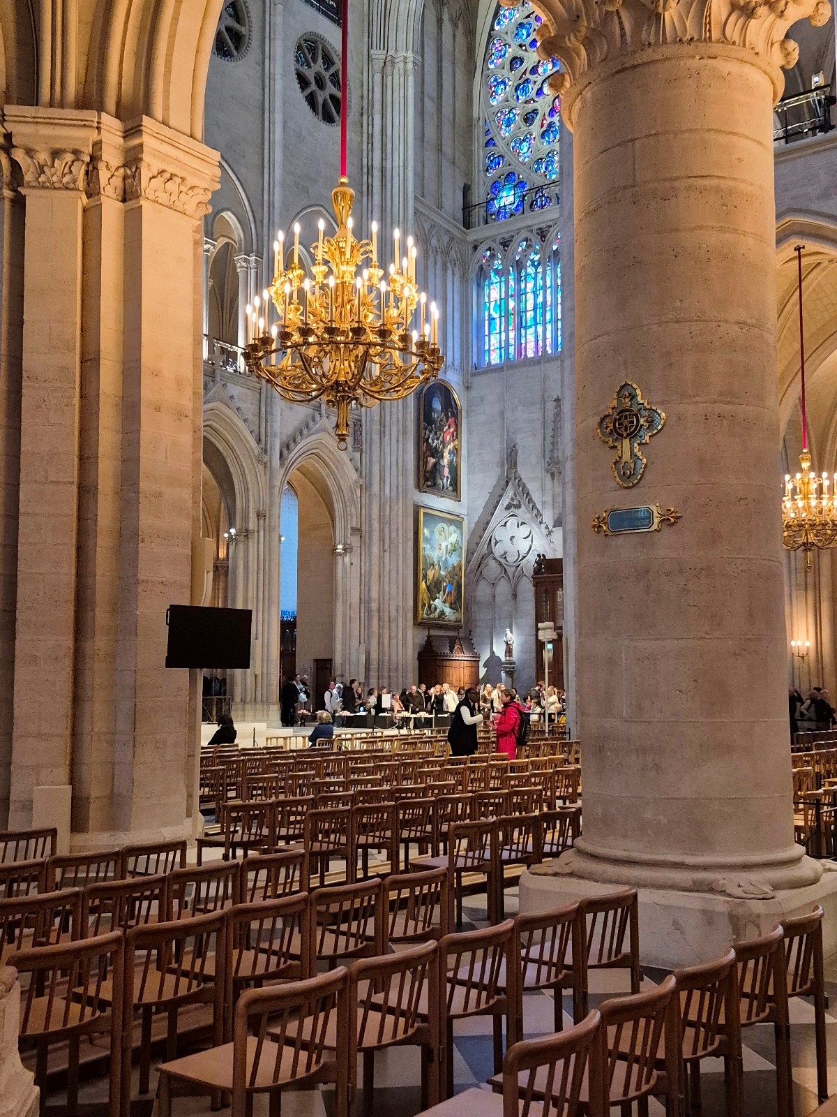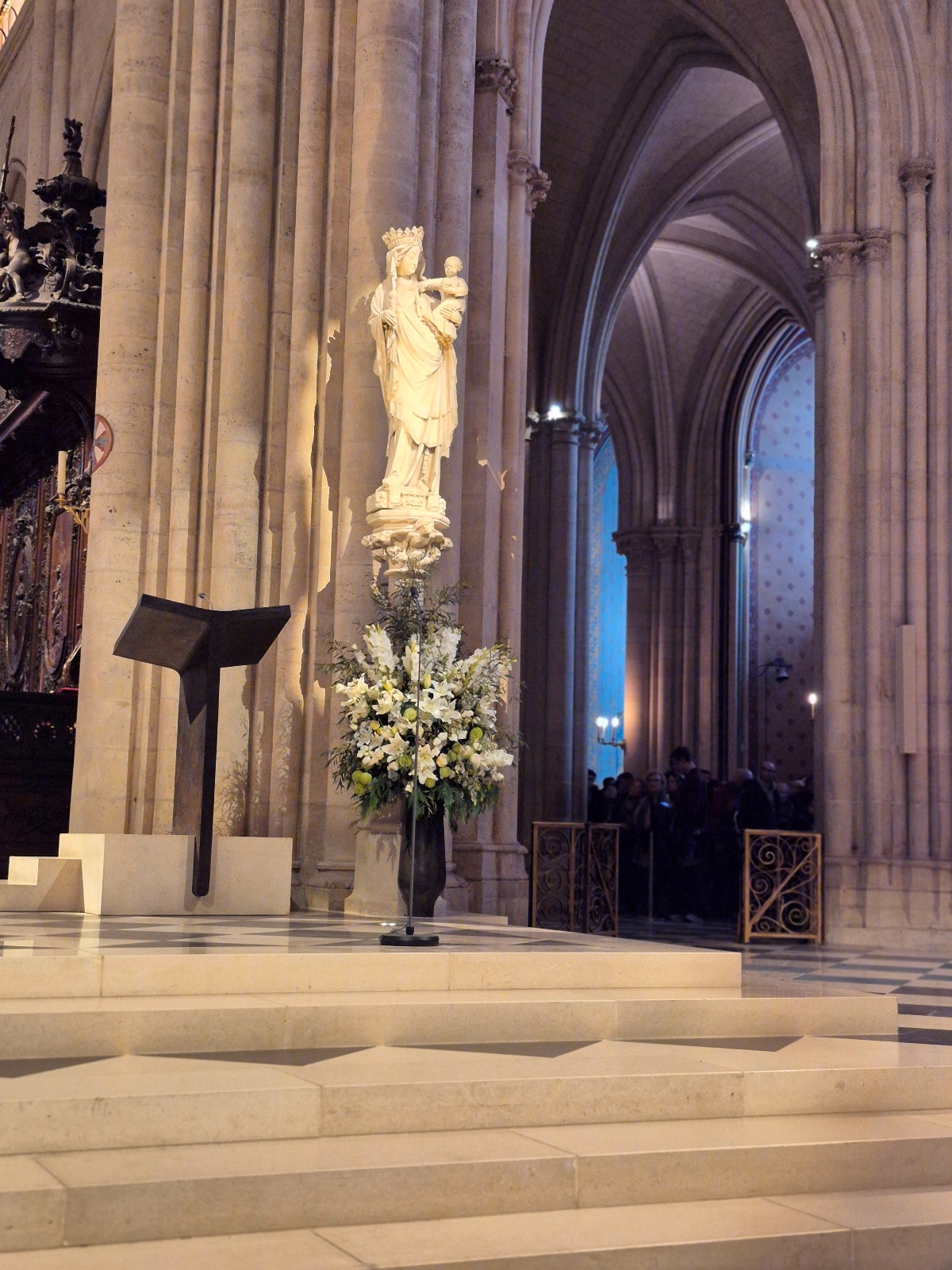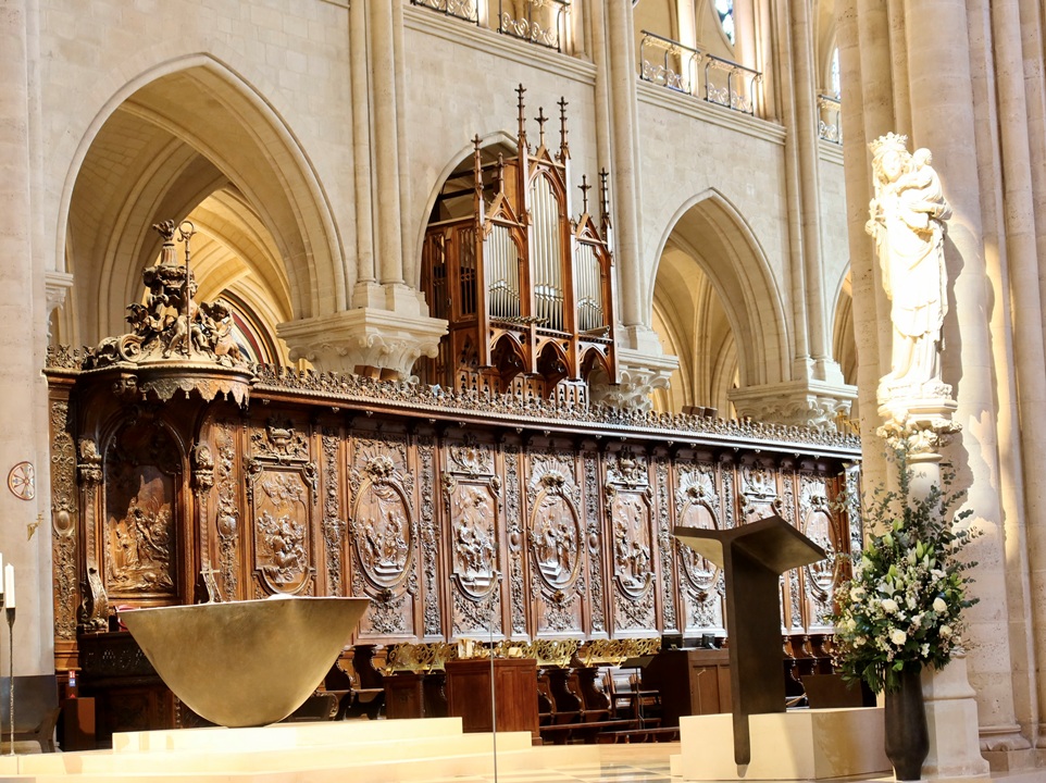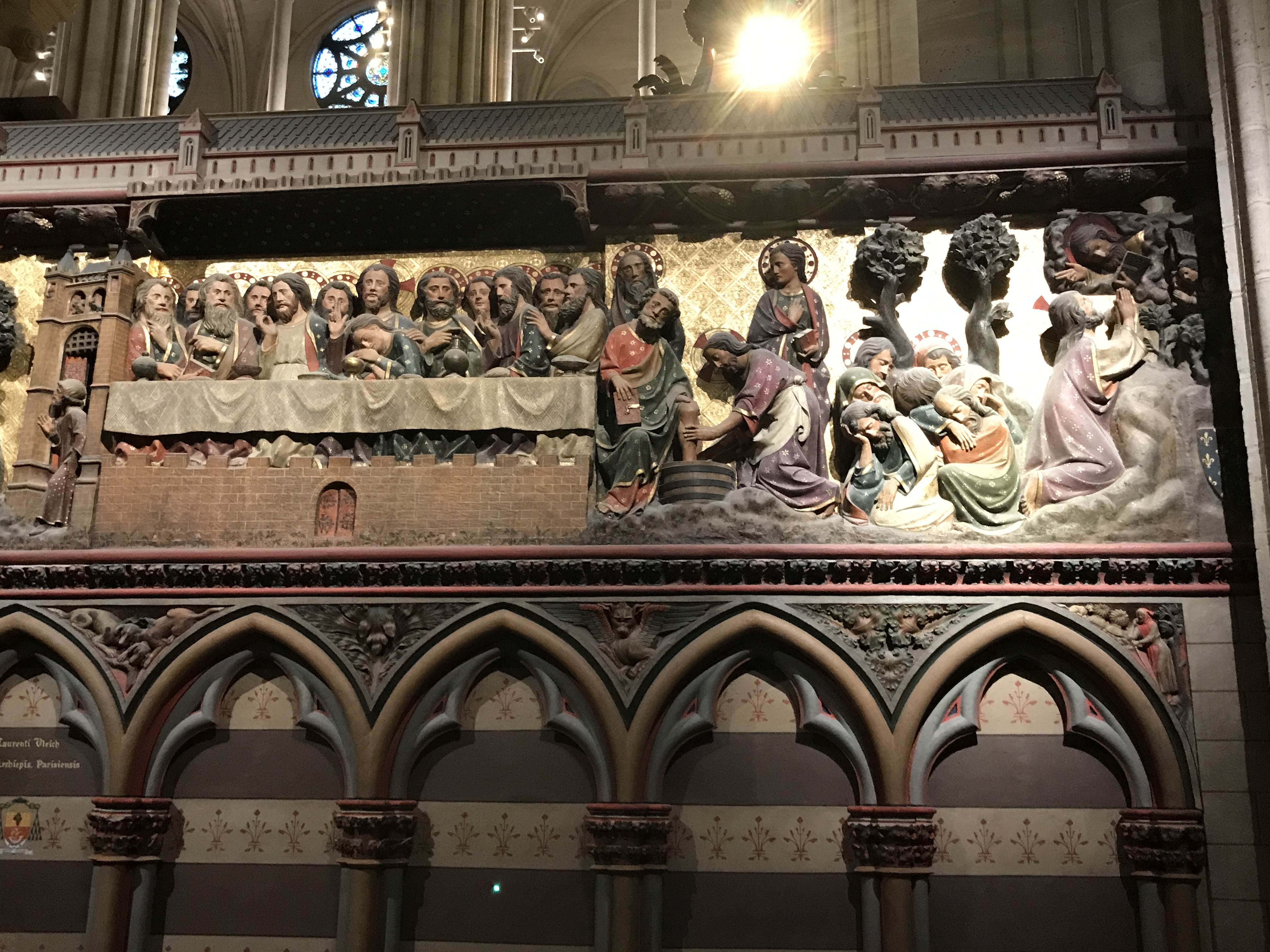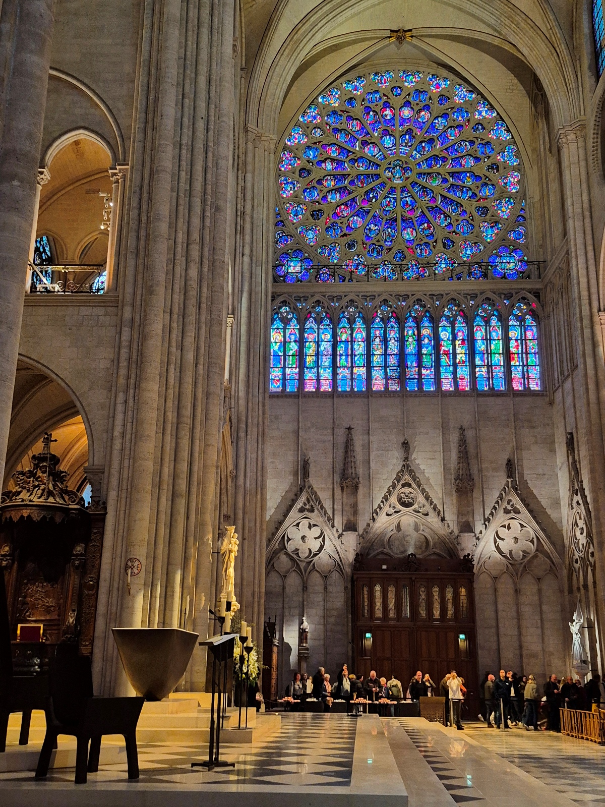 En fin d’après-midi, toujours à Notre-Dame, chacun a pu visiter, seul et à sa façon, l’intérieur de la cathédrale. Mais il y avait tellement de monde que la déambulation n’était pas aisée. Ce qui nous a frappés, c’est bien sûr la luminosité de la nef, le nouveau chœur liturgique … (certains aiment, d’autres moins ….), et les vitraux dont les grandes rosaces donnant sur les transepts. Contrairement à Chartres, à la cathédrale de Paris, 44% seulement des vitraux sont d’origine. Chacun a pu aussi déchiffrer le tour extérieur de l’arrière-chœur, qui comme à Chartres est une frise sculptée, en bois polychrome qui retrace les scènes de la vie du Christ. Voir sur le site de la cathédrale de Paris