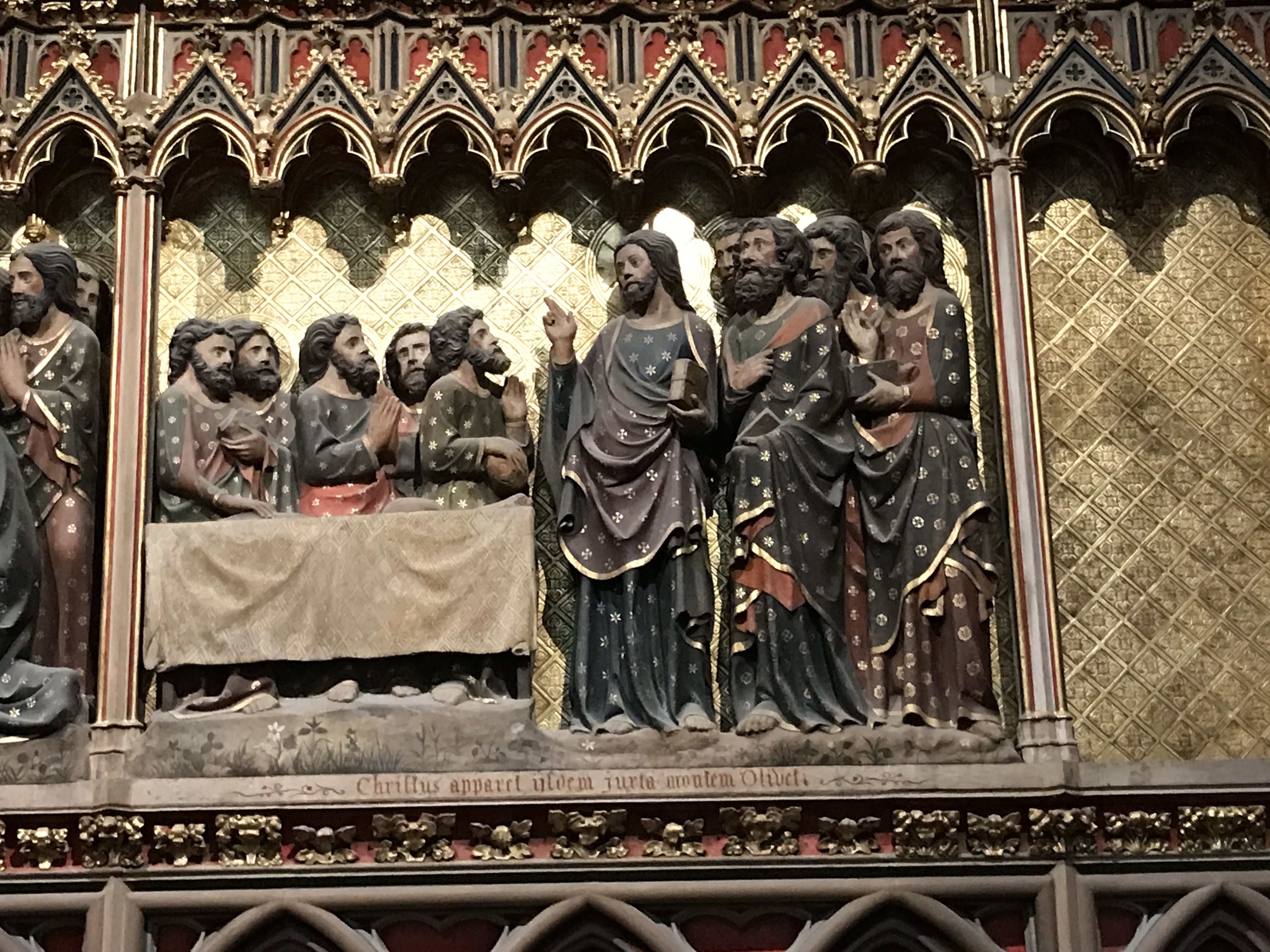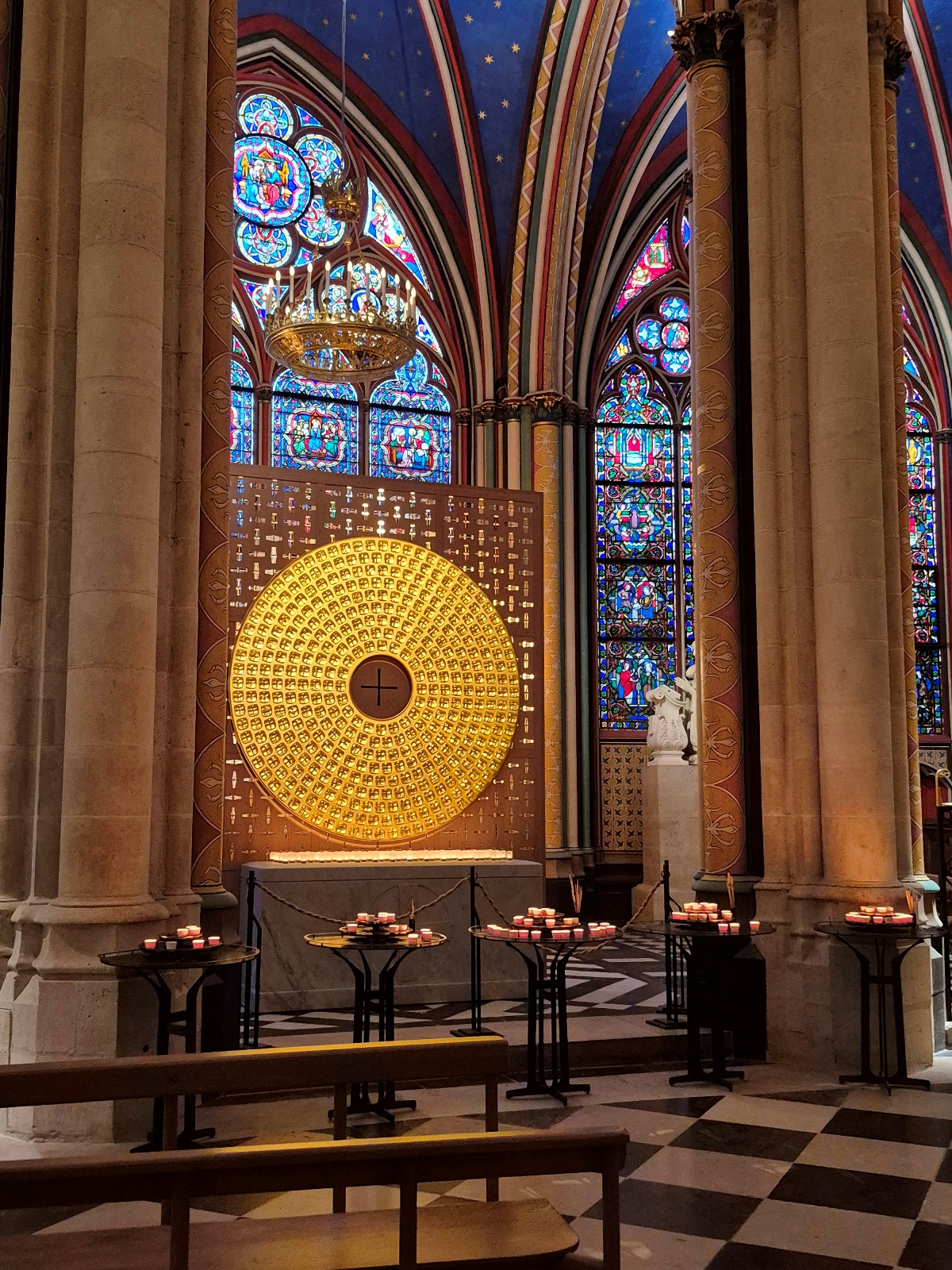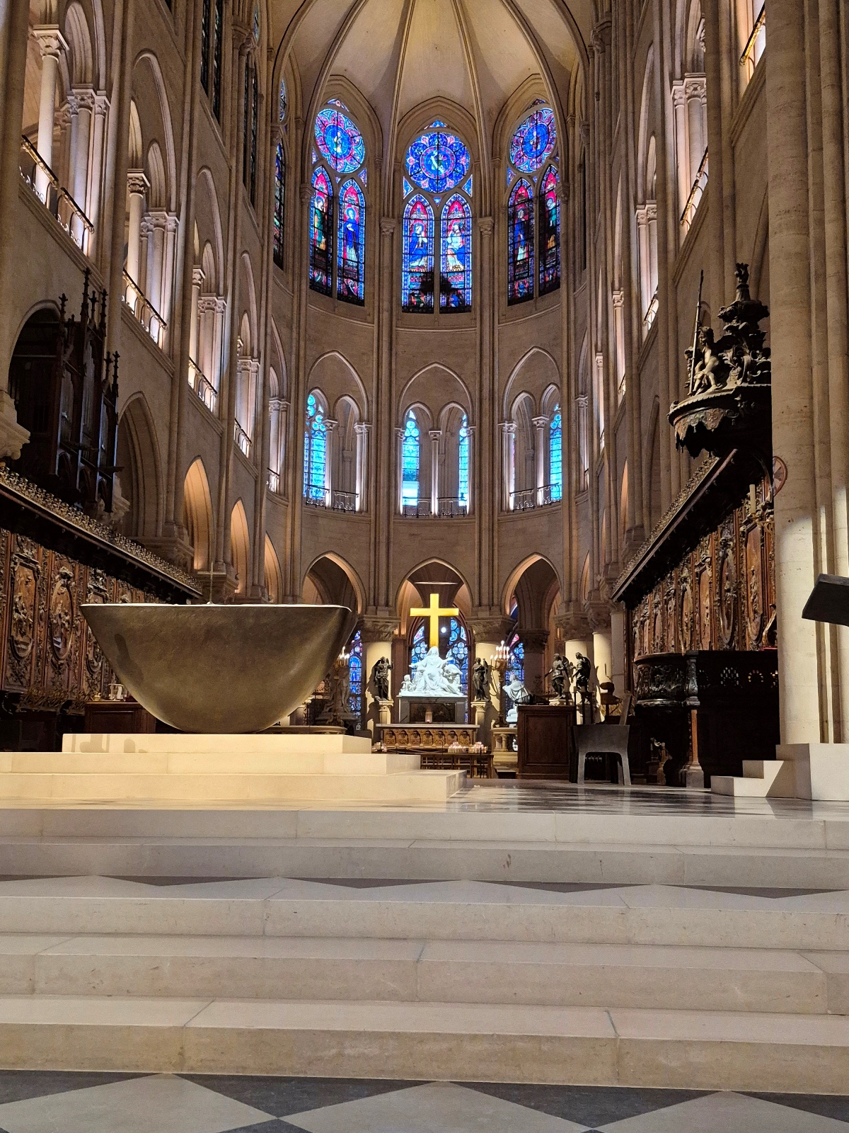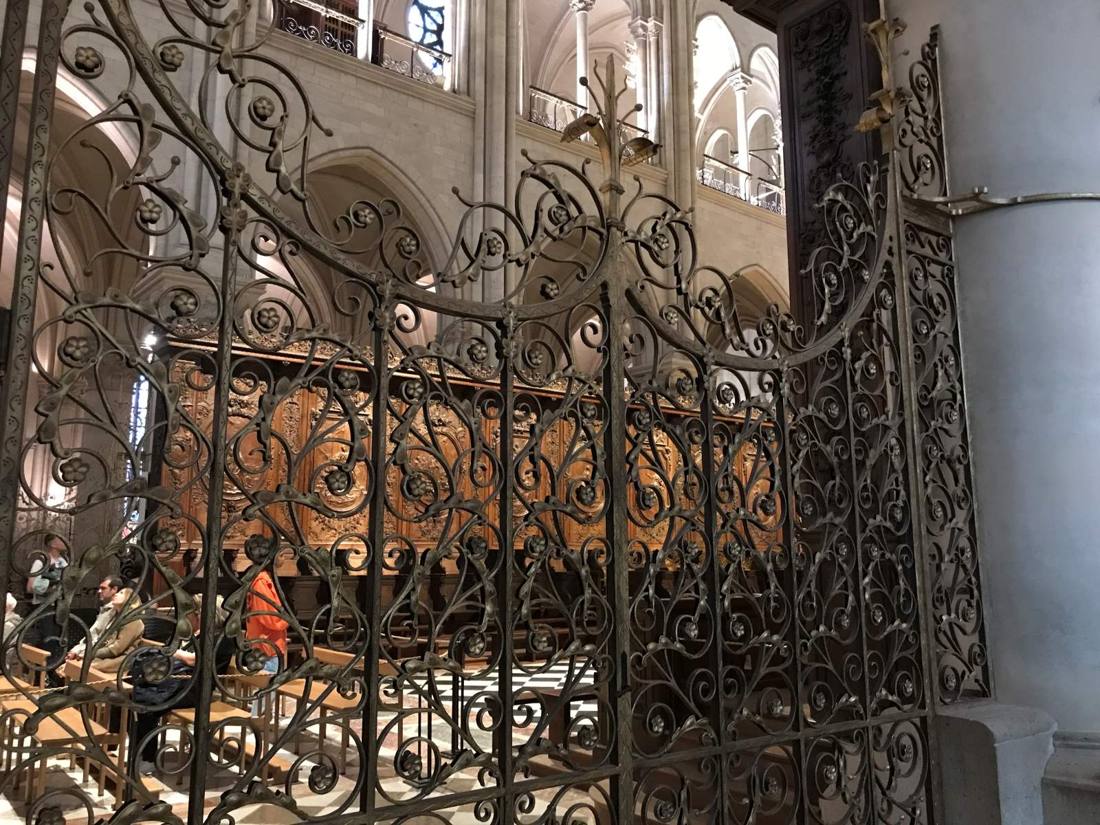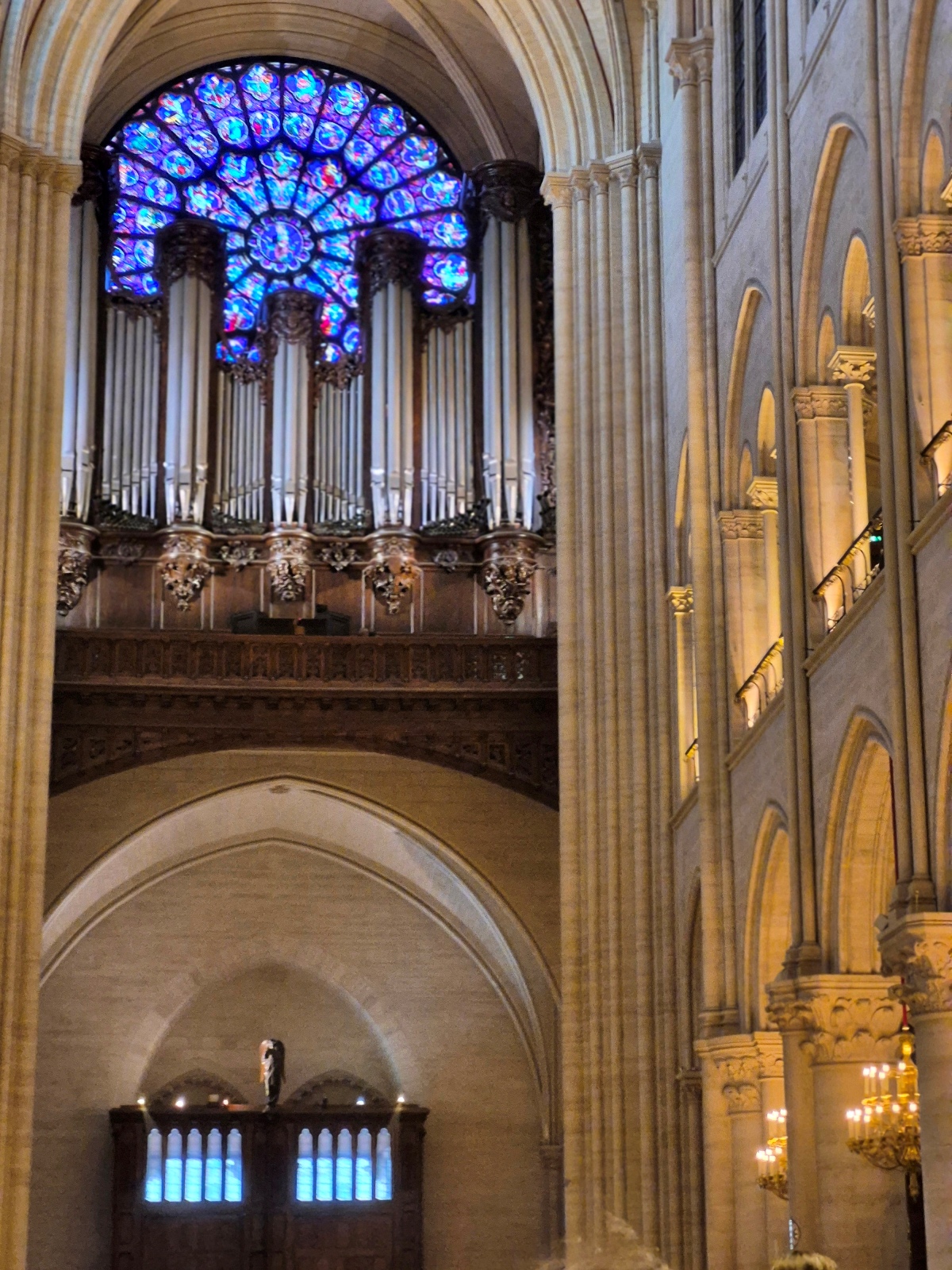 En fin d’après-midi, toujours à Notre-Dame, chacun a pu visiter, seul et à sa façon, l’intérieur de la cathédrale. Mais il y avait tellement de monde que la déambulation n’était pas aisée. Ce qui nous a frappés, c’est bien sûr la luminosité de la nef, le nouveau chœur liturgique … (certains aiment, d’autres moins ….), et les vitraux dont les grandes rosaces donnant sur les transepts. Contrairement à Chartres, à la cathédrale de Paris, 44% seulement des vitraux sont d’origine. Chacun a pu aussi déchiffrer le tour extérieur de l’arrière-chœur, qui comme à Chartres est une frise sculptée, en bois polychrome qui retrace les scènes de la vie du Christ. Voir sur le site de la cathédrale de Paris