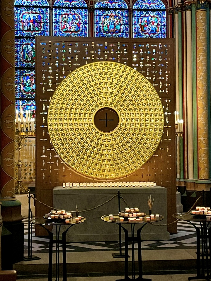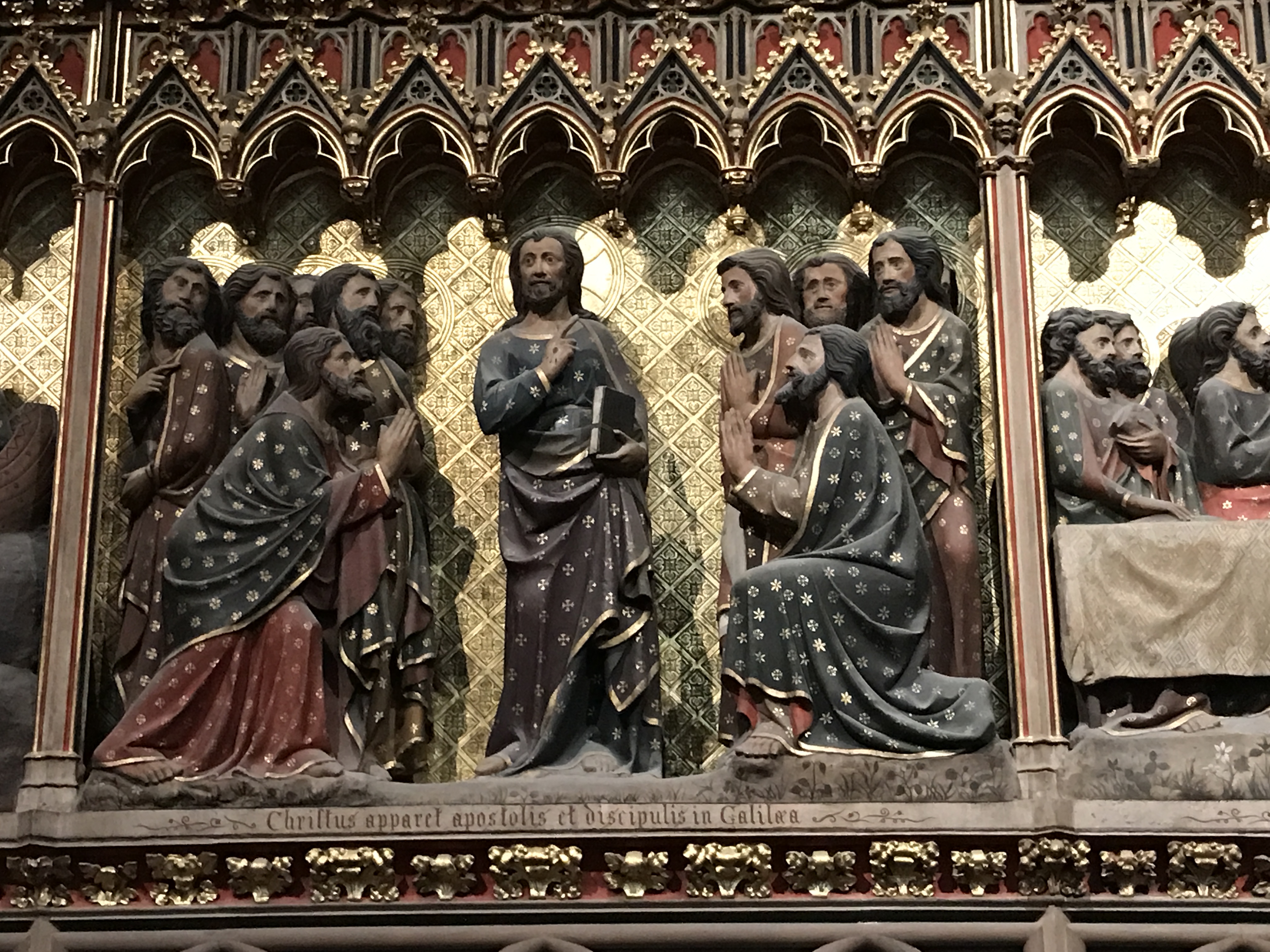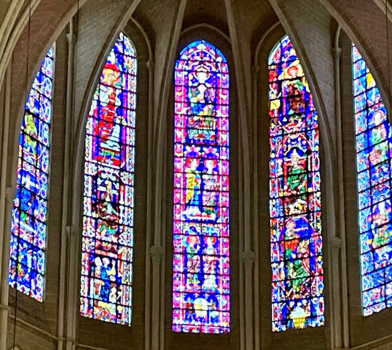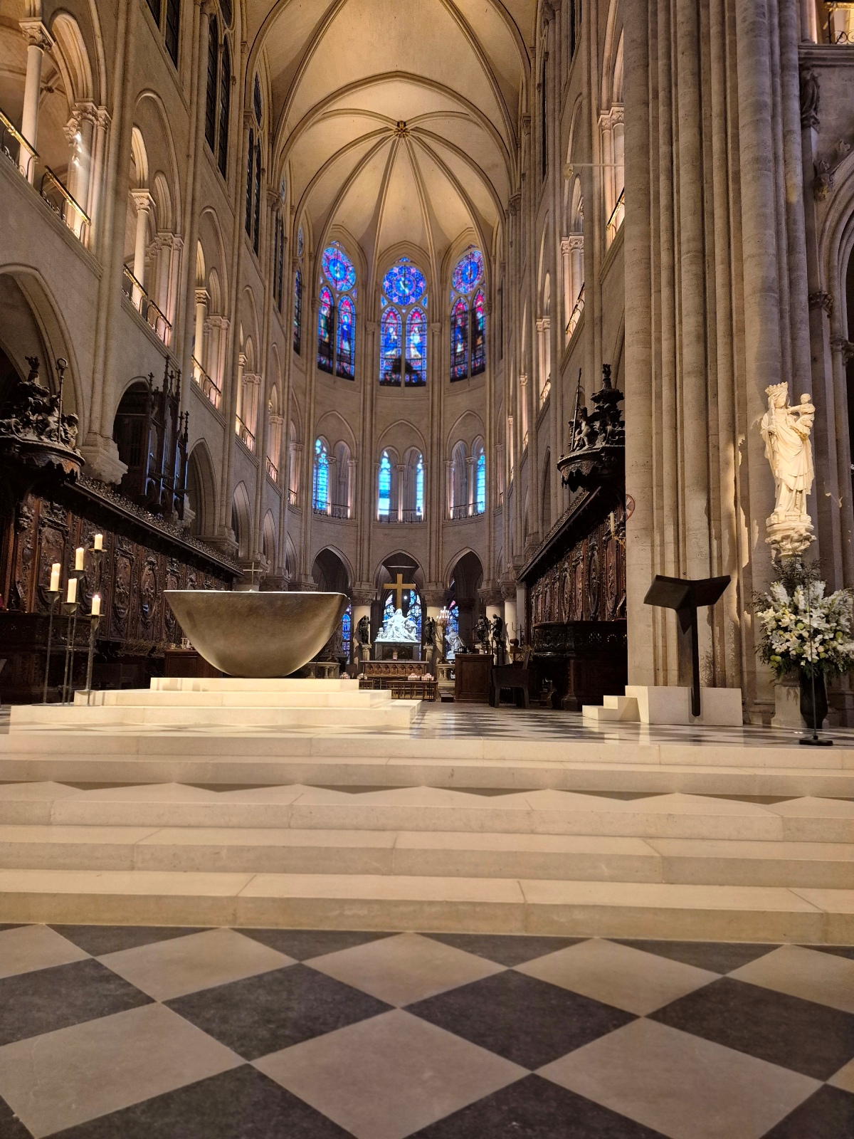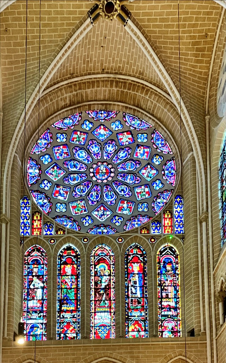 En fin d’après-midi, toujours à Notre-Dame, chacun a pu visiter, seul et à sa façon, l’intérieur de la cathédrale. Mais il y avait tellement de monde que la déambulation n’était pas aisée. Ce qui nous a frappés, c’est bien sûr la luminosité de la nef, le nouveau chœur liturgique … (certains aiment, d’autres moins ….), et les vitraux dont les grandes rosaces donnant sur les transepts. Contrairement à Chartres, à la cathédrale de Paris, 44% seulement des vitraux sont d’origine. Chacun a pu aussi déchiffrer le tour extérieur de l’arrière-chœur, qui comme à Chartres est une frise sculptée, en bois polychrome qui retrace les scènes de la vie du Christ. Voir sur le site de la cathédrale de Paris