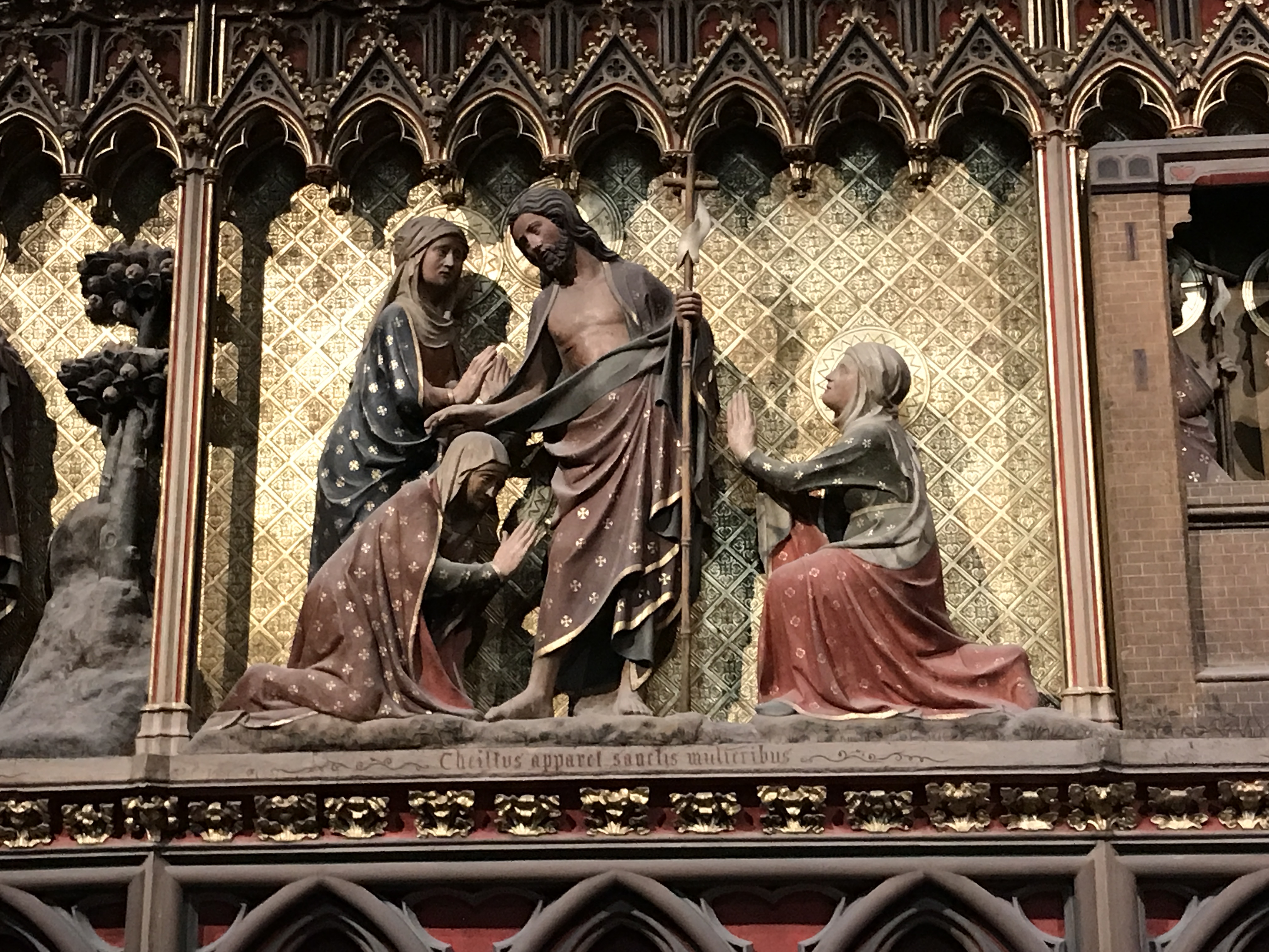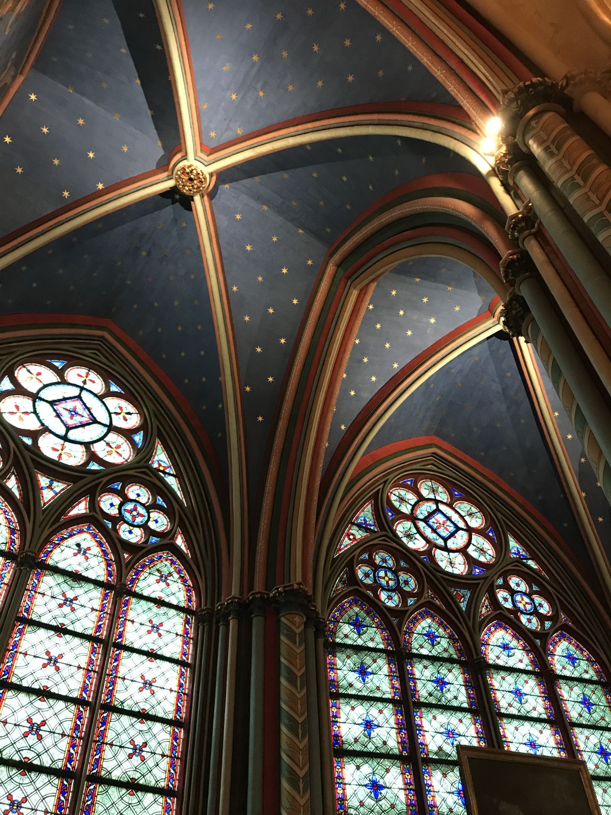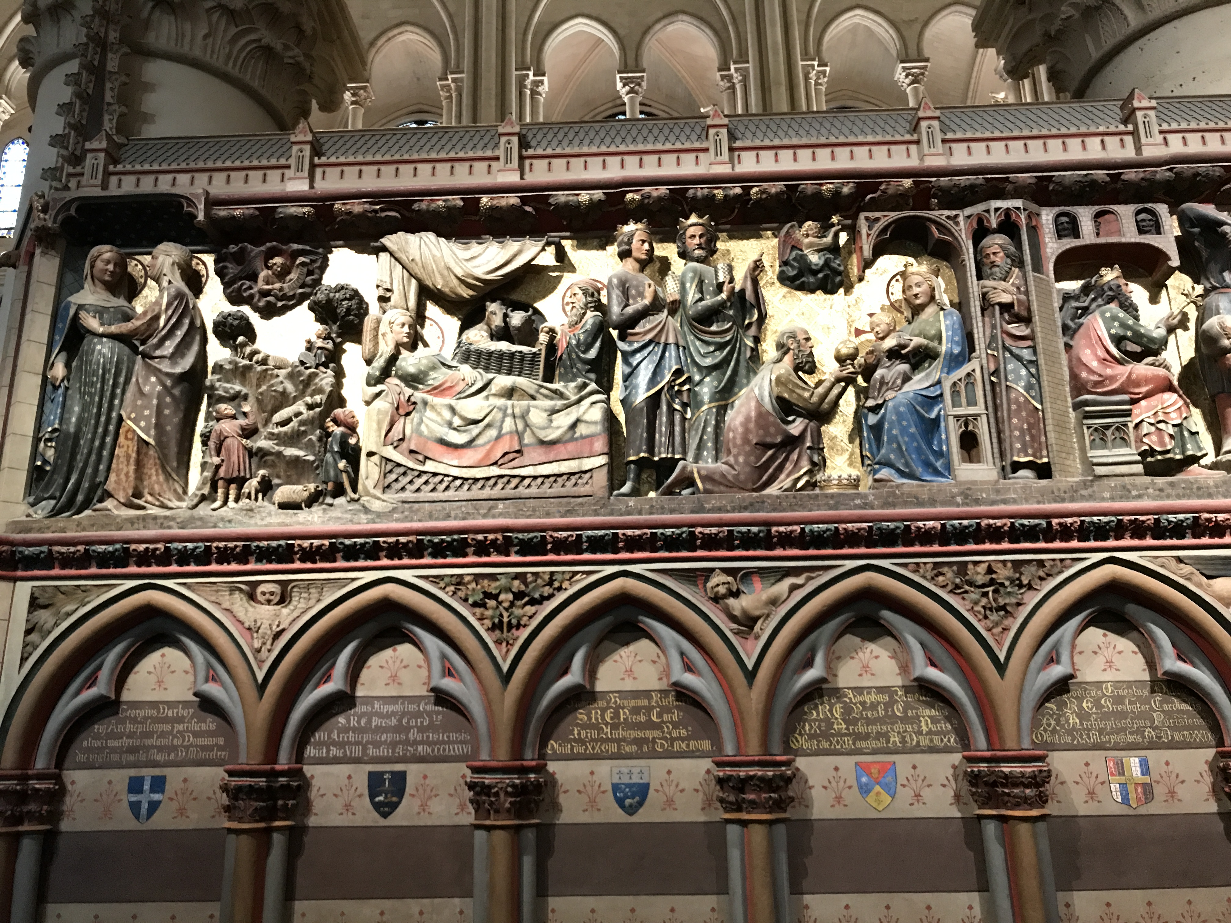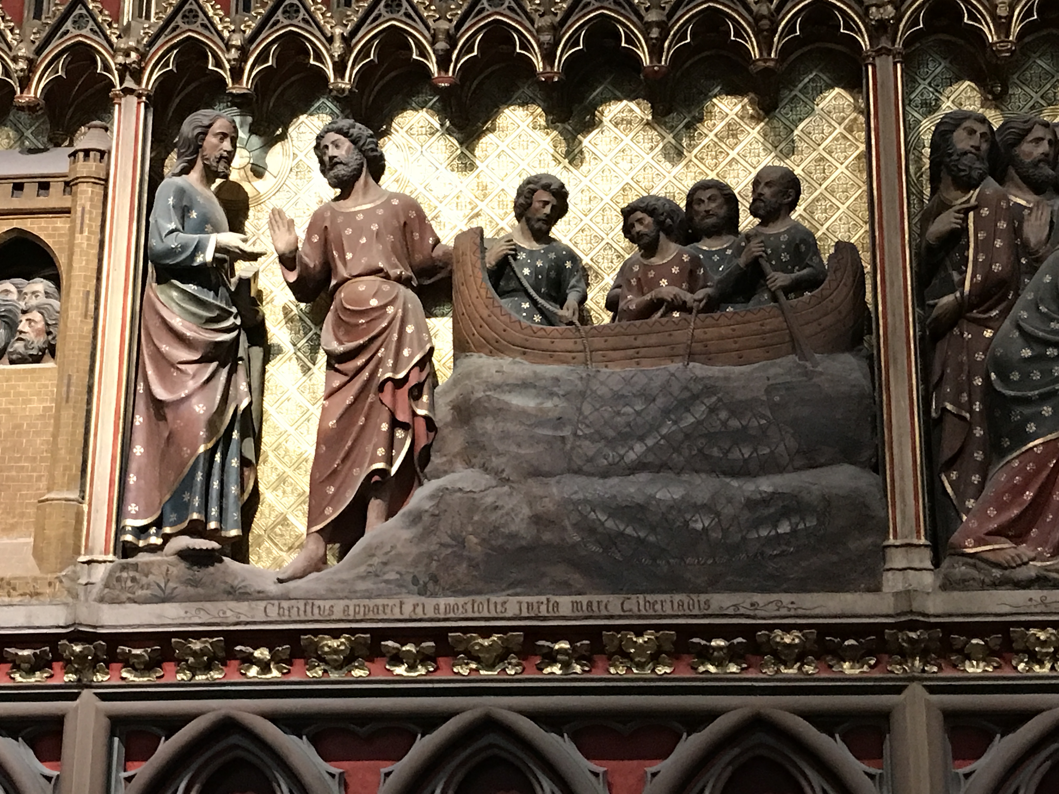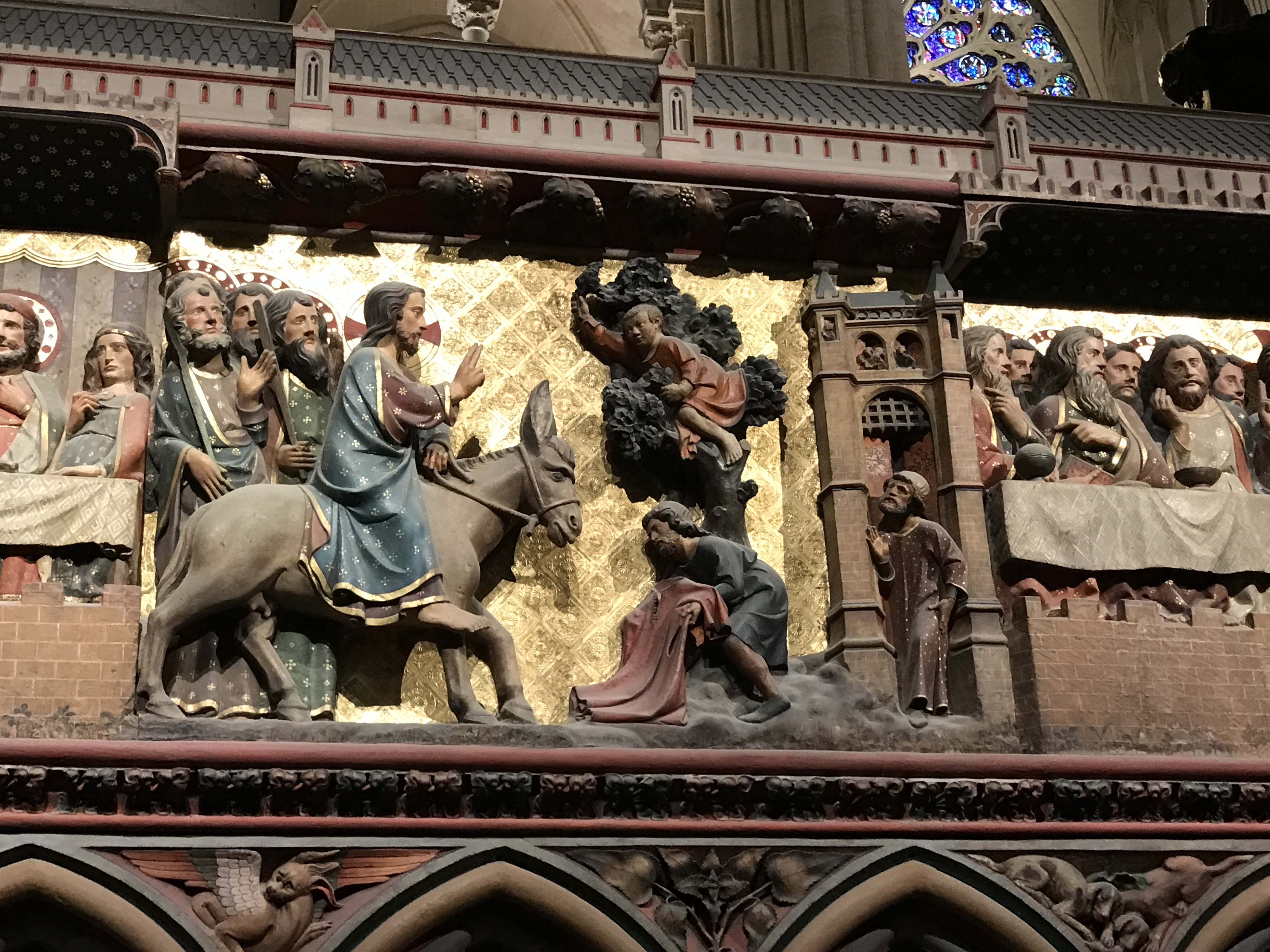En fin d’après-midi, toujours à Notre-Dame, chacun a pu visiter, seul et à sa façon, l’intérieur de la cathédrale. Mais il y avait tellement de monde que la déambulation n’était pas aisée. Ce qui nous a frappés, c’est bien sûr la luminosité de la nef, le nouveau chœur liturgique … (certains aiment, d’autres moins ….), et les vitraux dont les grandes rosaces donnant sur les transepts. Contrairement à Chartres, à la cathédrale de Paris, 44% seulement des vitraux sont d’origine. Chacun a pu aussi déchiffrer le tour extérieur de l’arrière-chœur, qui comme à Chartres est une frise sculptée, en bois polychrome qui retrace les scènes de la vie du Christ. Voir sur le site de la cathédrale de Paris