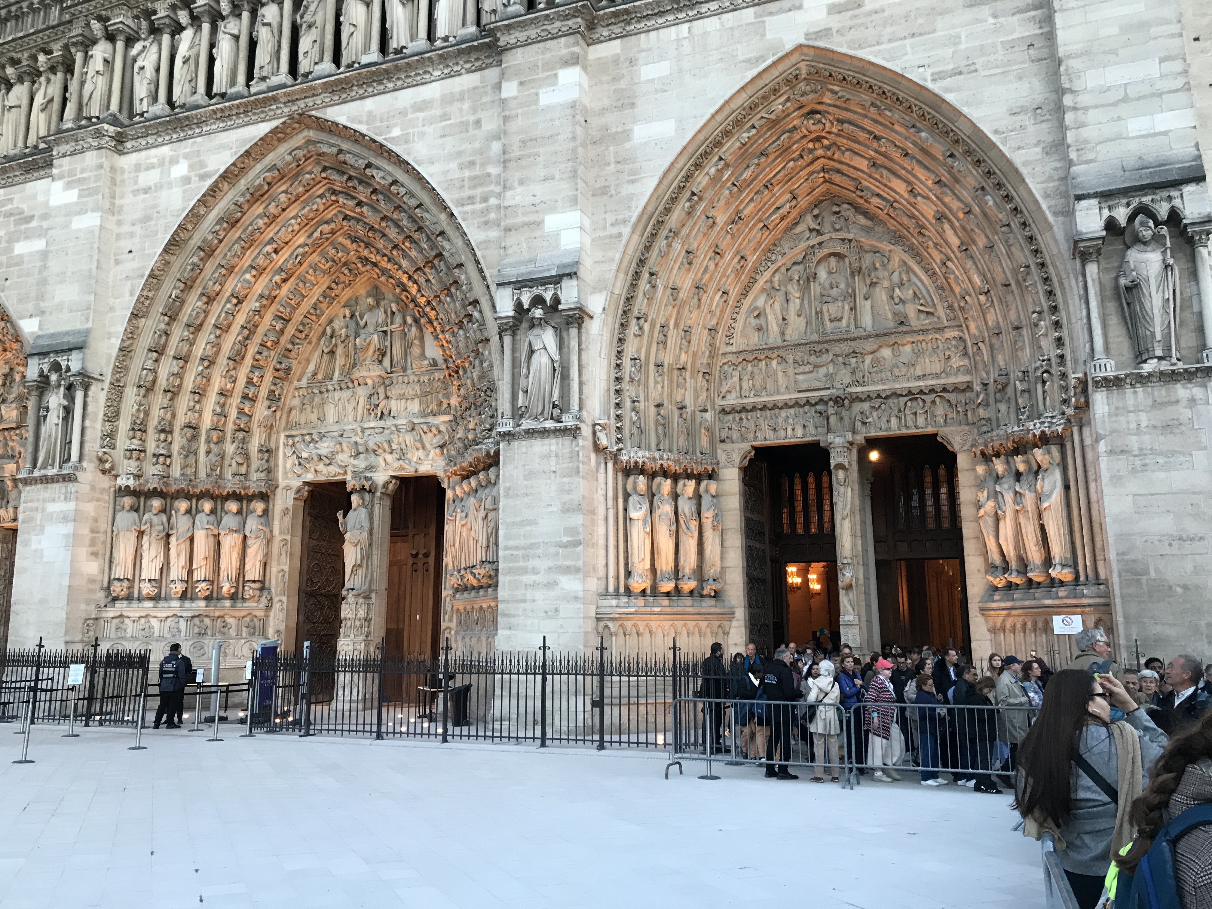 Lorsque nous sommes arrivés à pied, depuis le quartier de l’Odéon, quelle n’a pas été notre surprise de voir une foule de gens, les uns visiteurs contemplatifs perchés et assis sur les marches d'une estrade dressée face à la cathédrale, les autres disposés en longue file d’attente de plus de 100 m qui attendaient leur tour pour pouvoir entrer dans l’édifice !