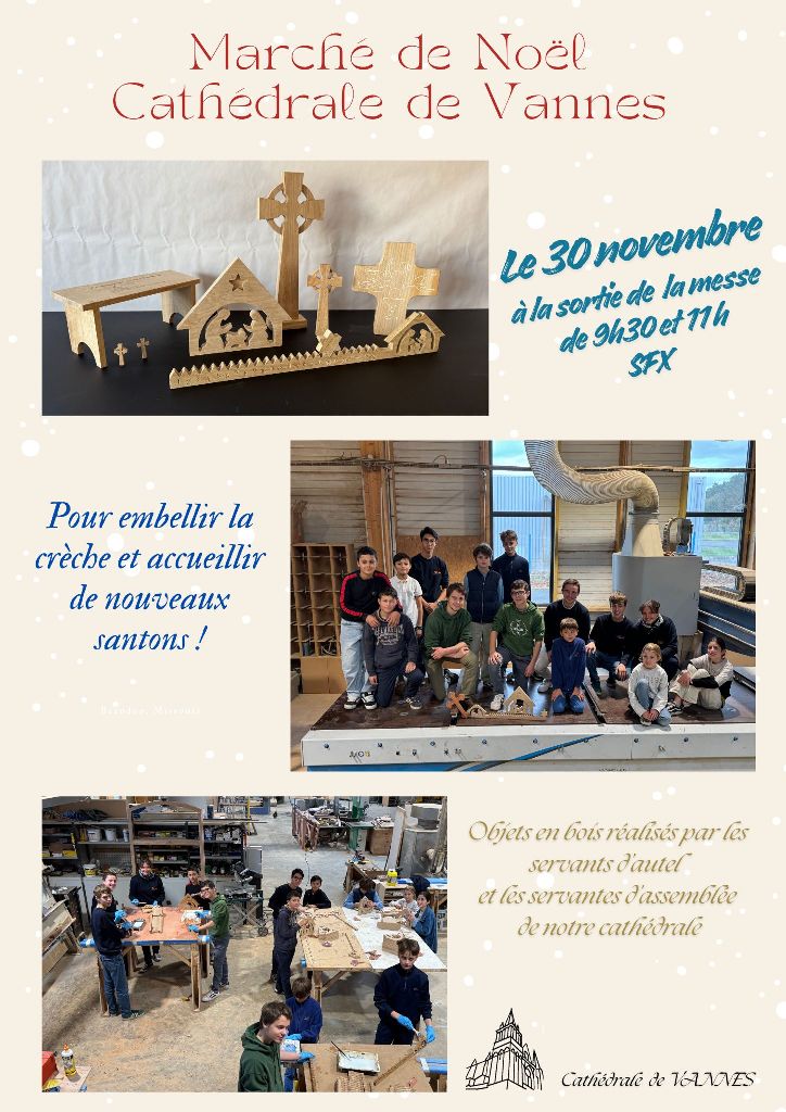 Dimanche 30 novembre, à la sortie des messes de 9h30 et 11h00, à la chapelle Saint-François-Xavier, les servants d'autels et servantes d'assemblée, vous proposeront des objets en bois qu'ils ont fabriqués, pour décorer vos crèches de Noël.