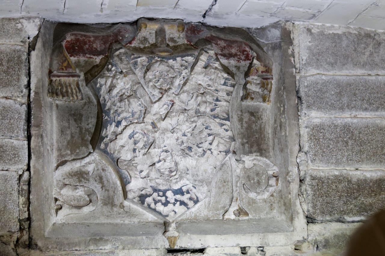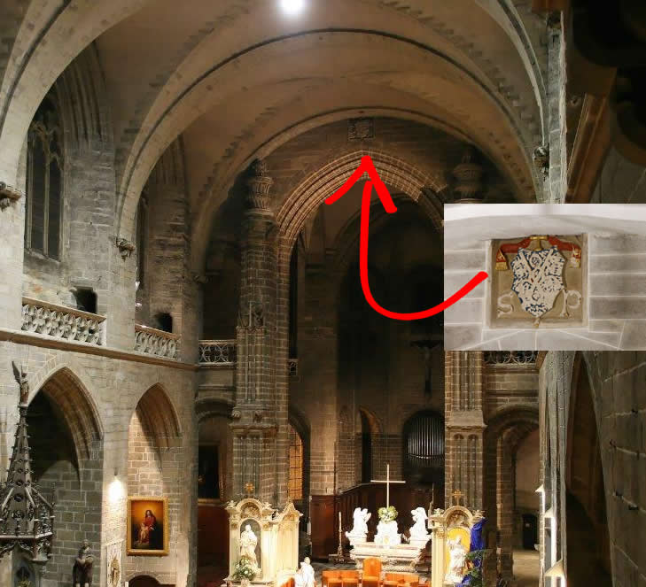 - Le blason "Pierre d'angle" de l'arche de l'entrée du choeur, a été restauré. On y discerne maintenant les 2 clés et, et de chaque coté du blason, les lettres S et P, signifiant Saint Pierre