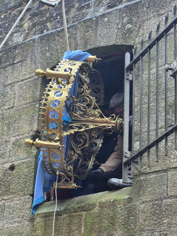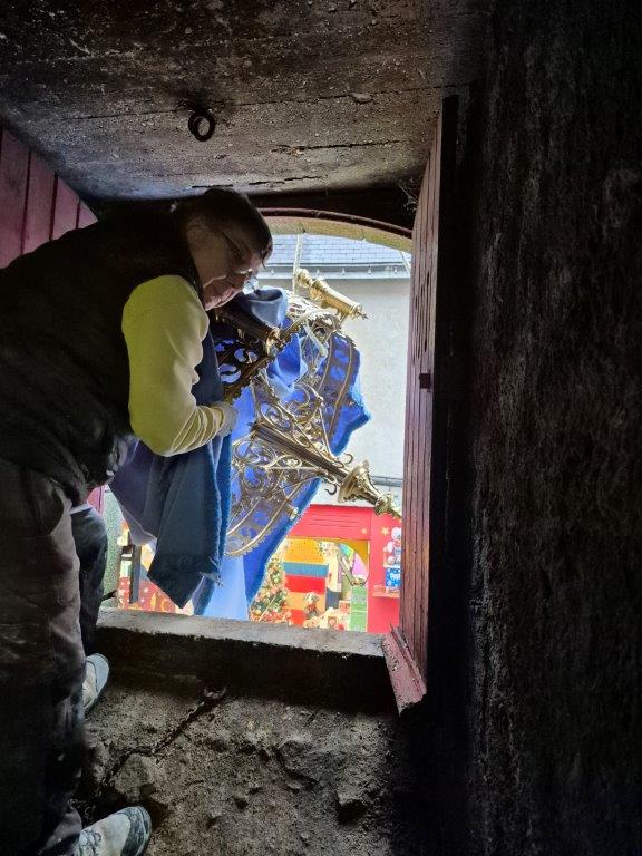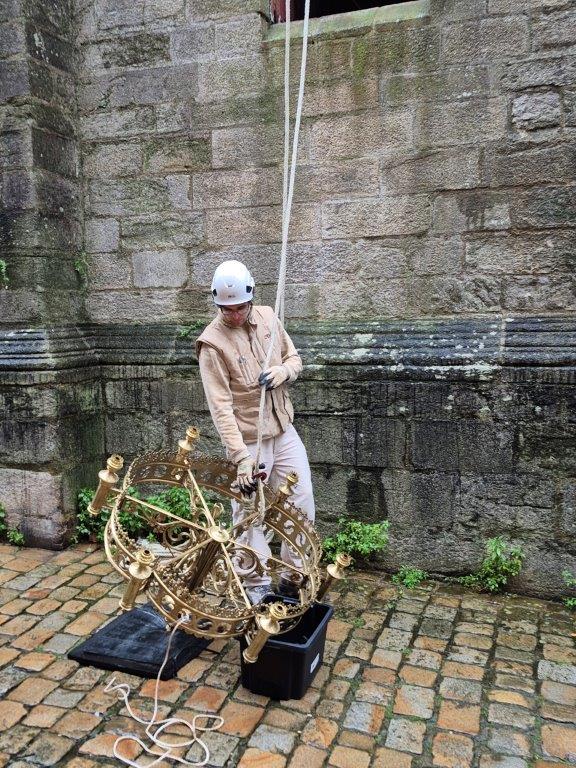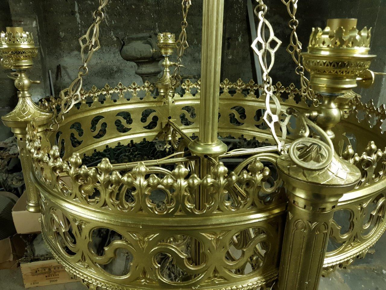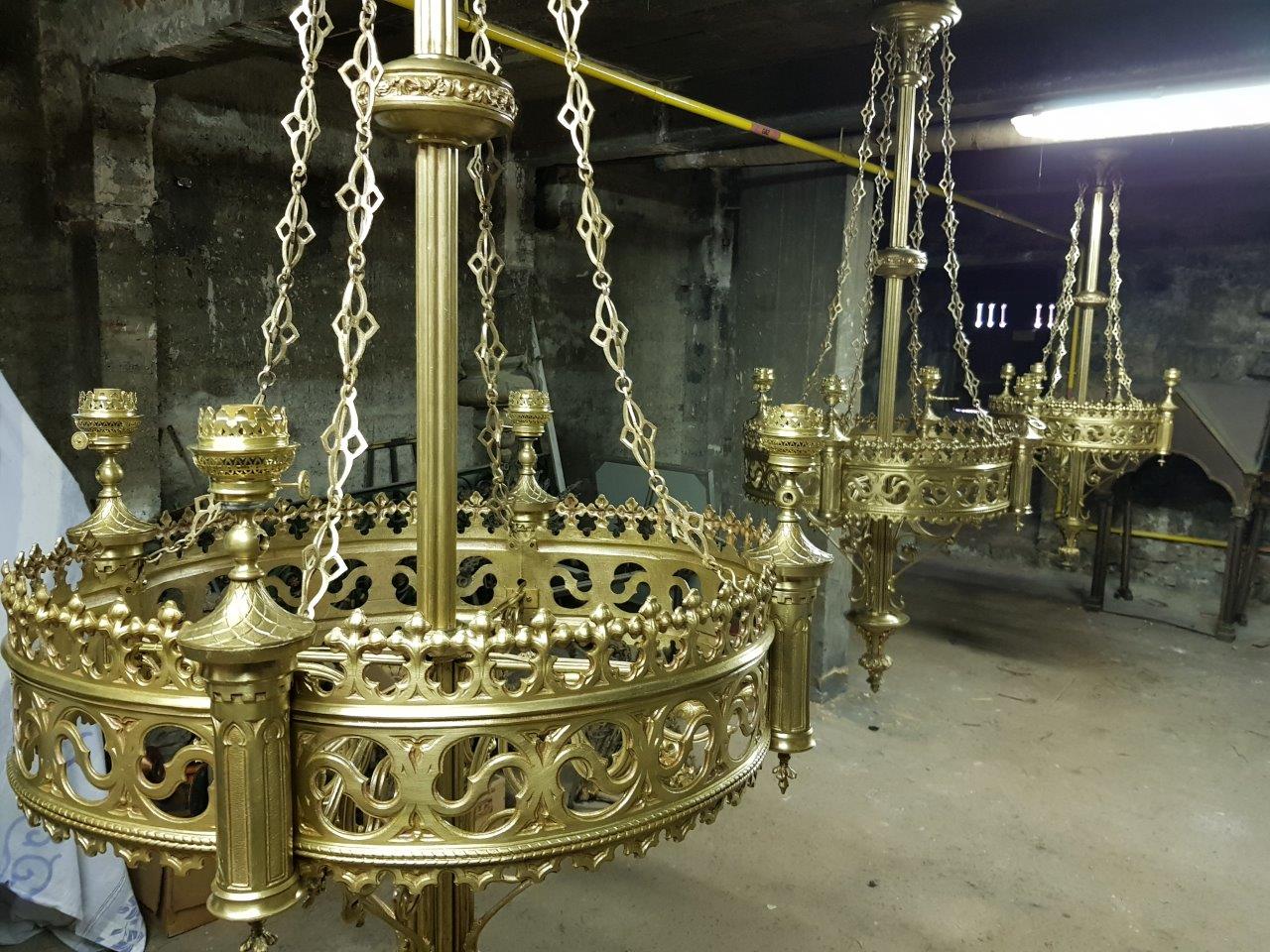 - Les lustres d'autrefois, en bronze doré, ont été restaurés et sont revenus discrètement dans la cathédrale par les ouvertures donnant sur la rue Saint Guénael. Ils restent pour l'instant entreposés.