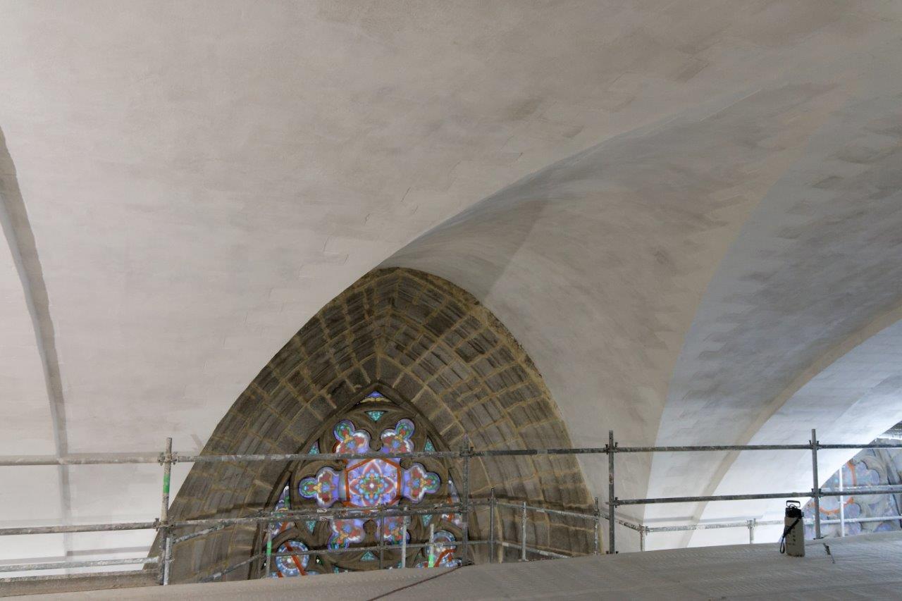- Les voûtes de la nef centrale sont en partie restaurées. Comme on le voit, certaines arêtes ogivales ont nécessité le remplacement délicat de quelques pierres.