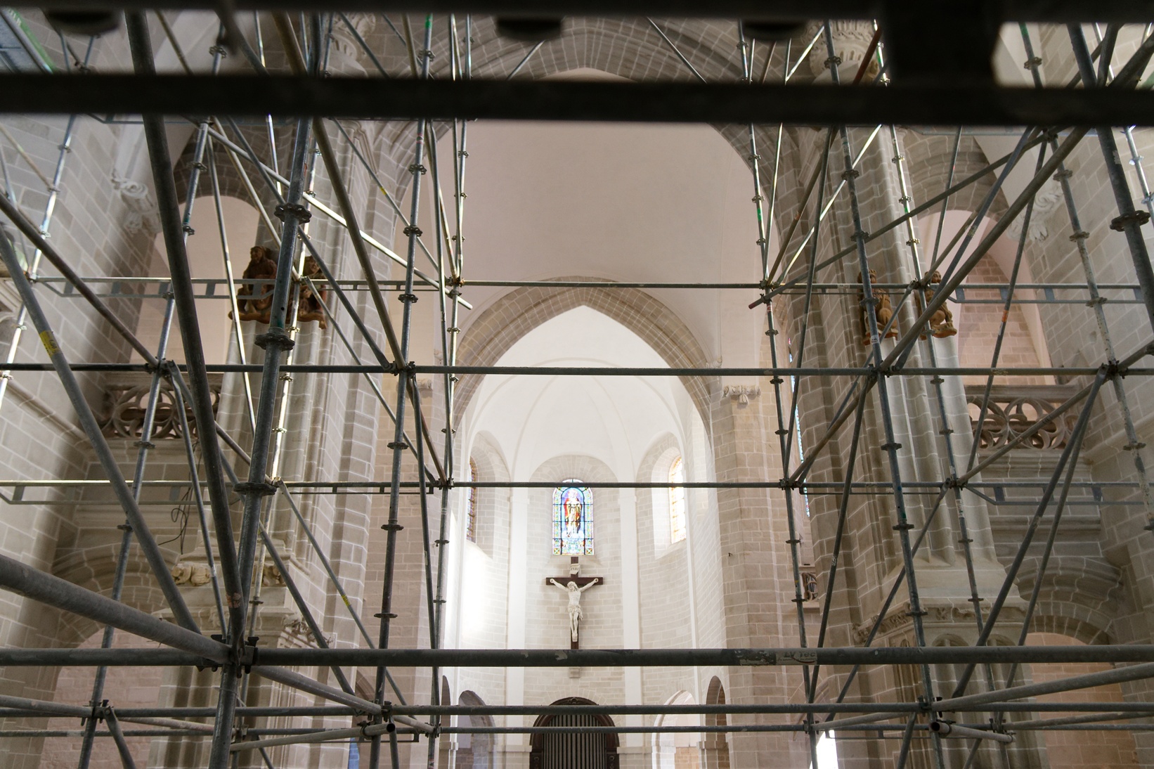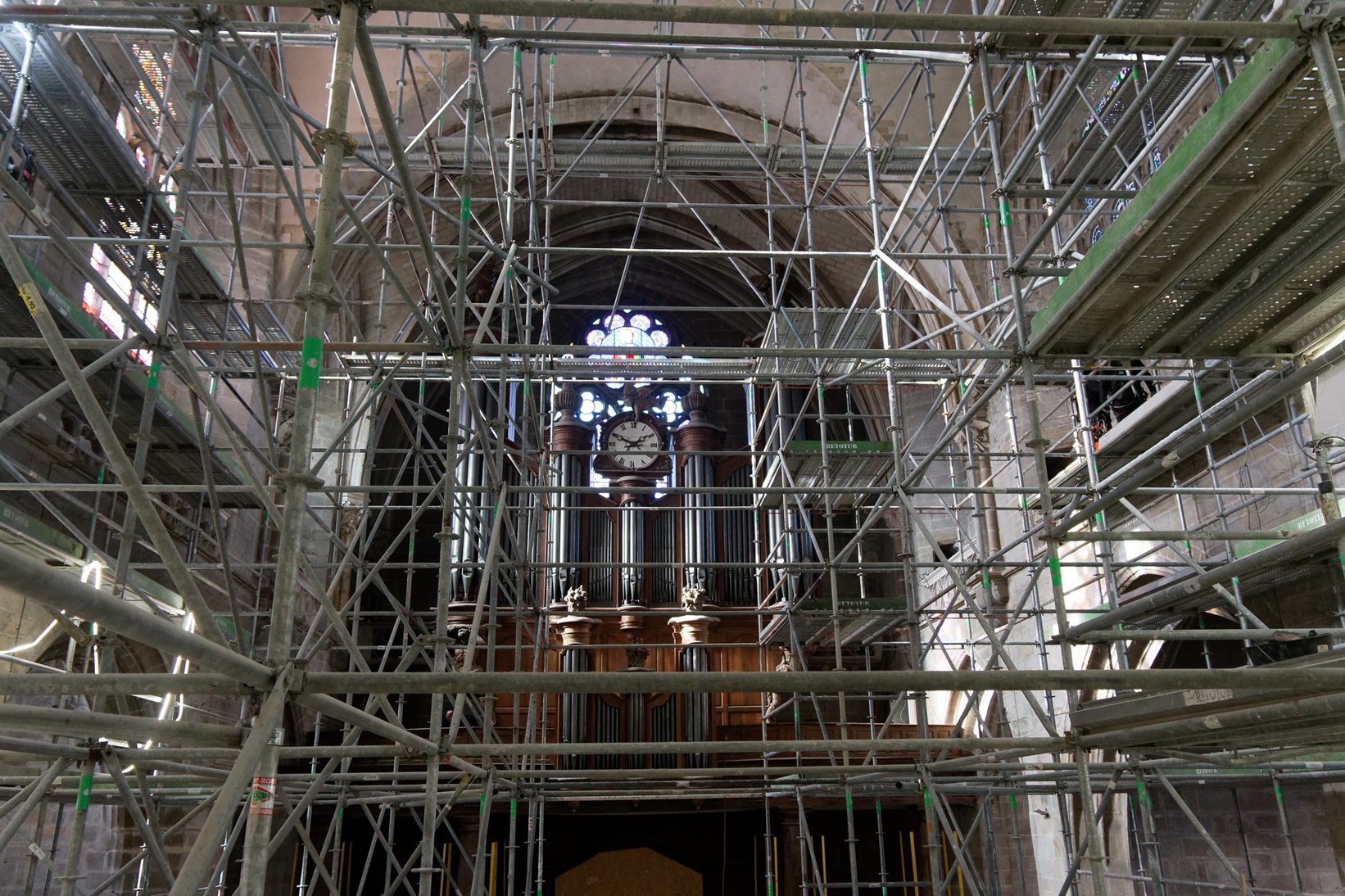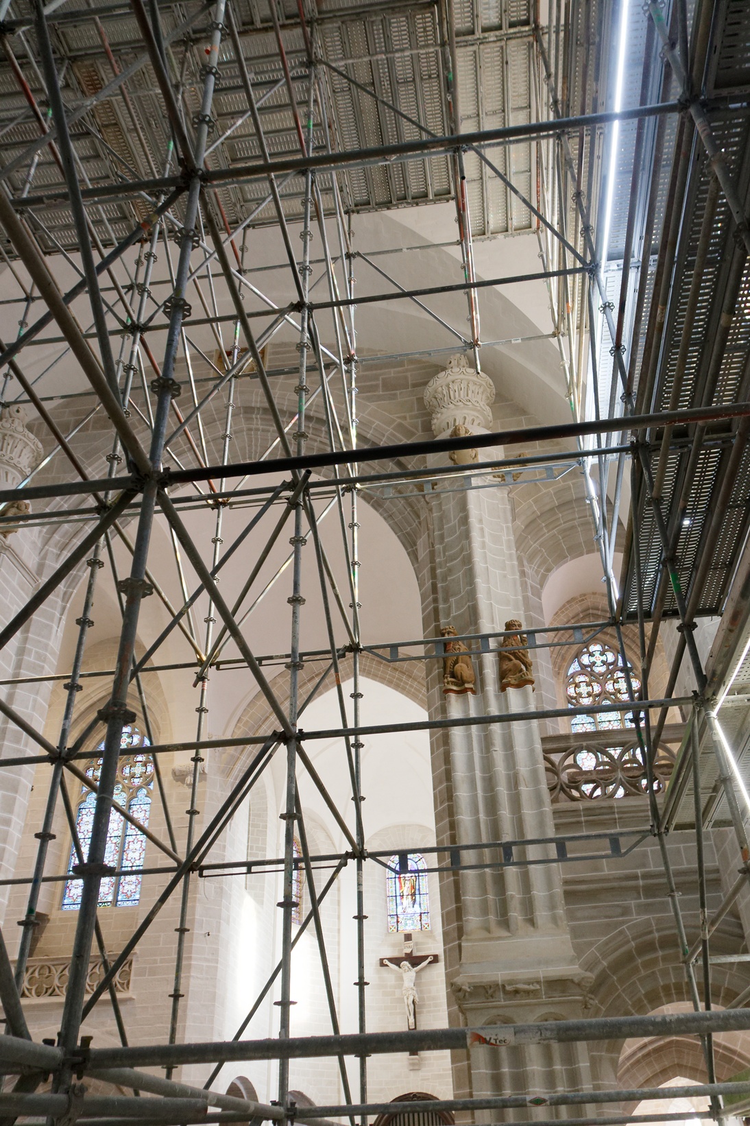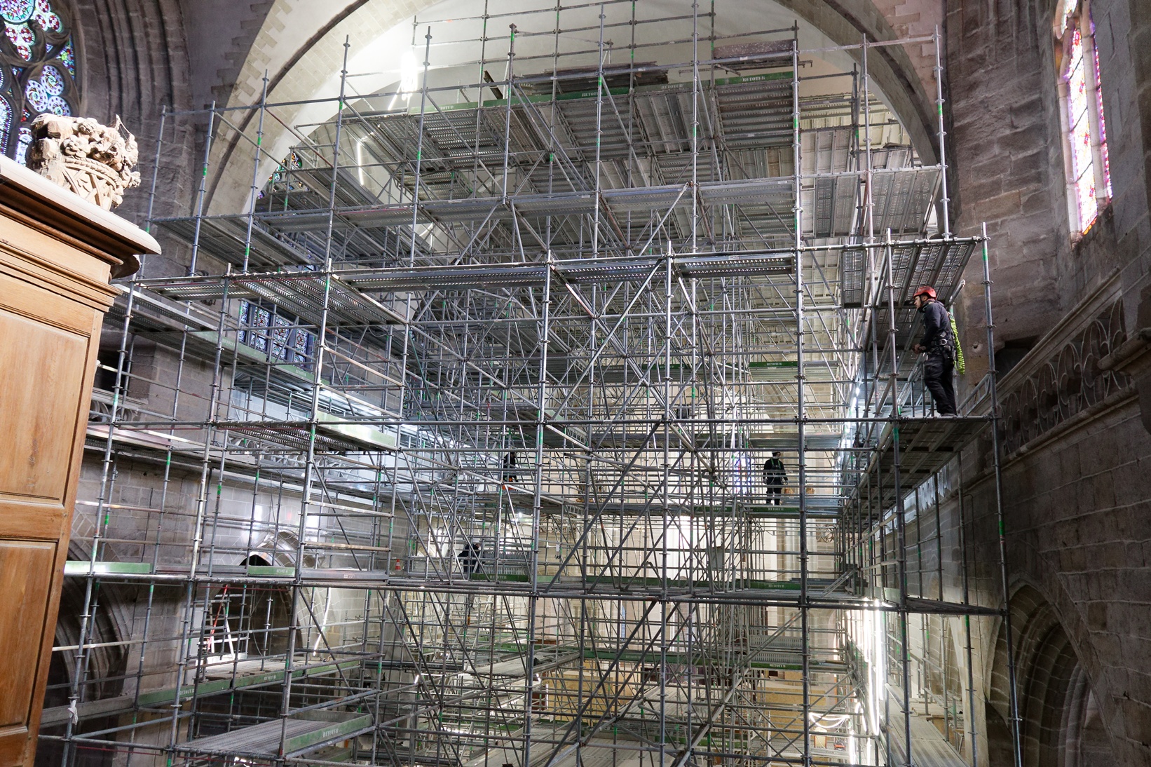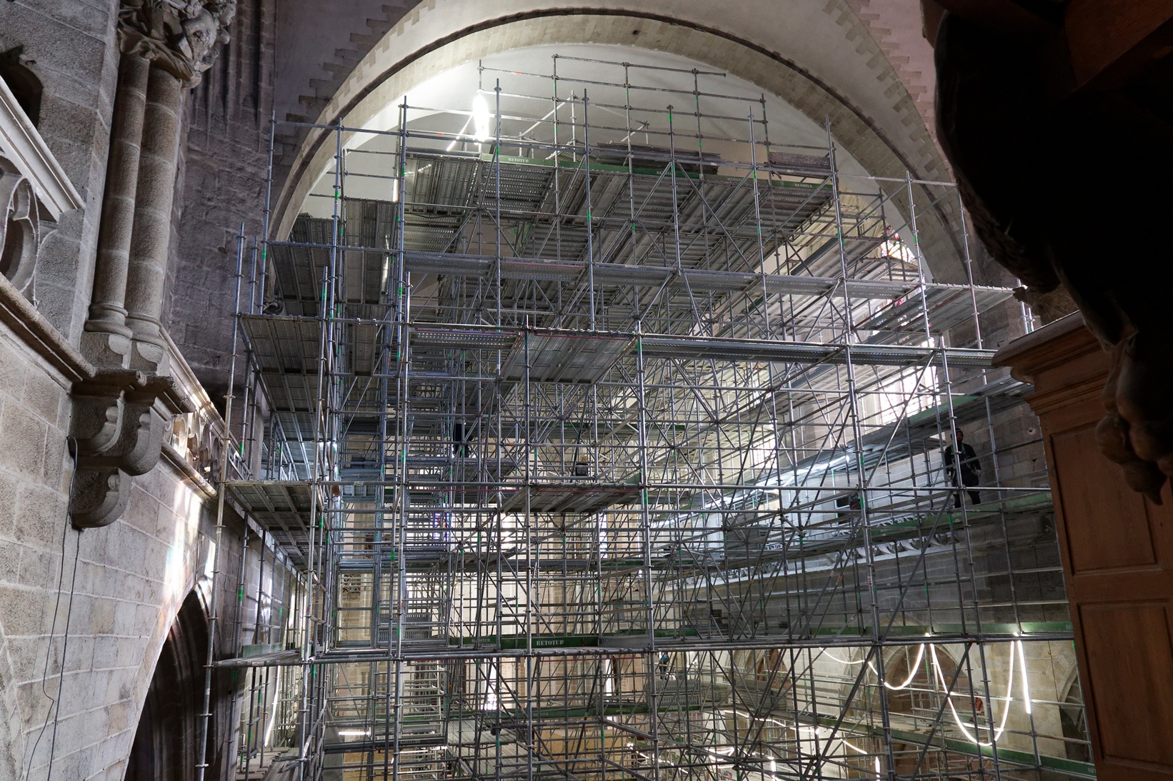 Malgré le démontage de la moitié des échafaudages, ceux qui restent afin de poursuivre les travaux vers la tribune de l'orgue, sont vraiment impressionnants ! Une vraie forêt de tubes métalliques.
