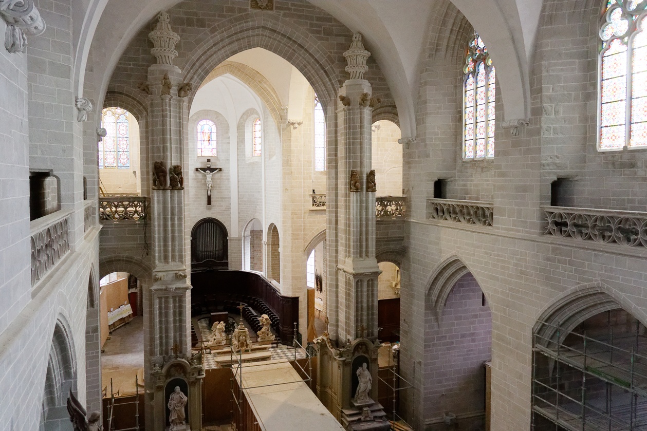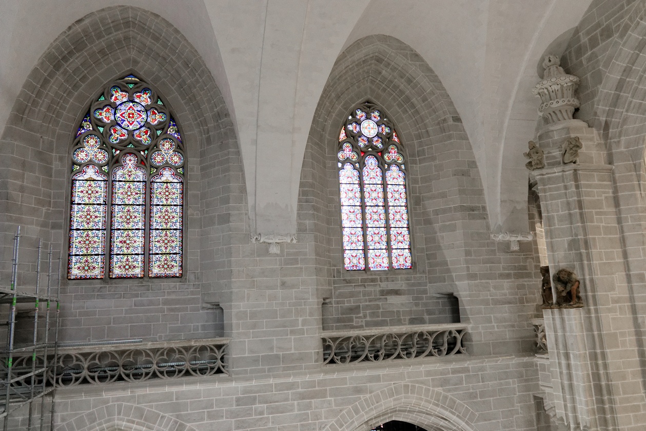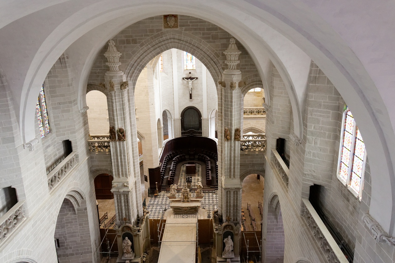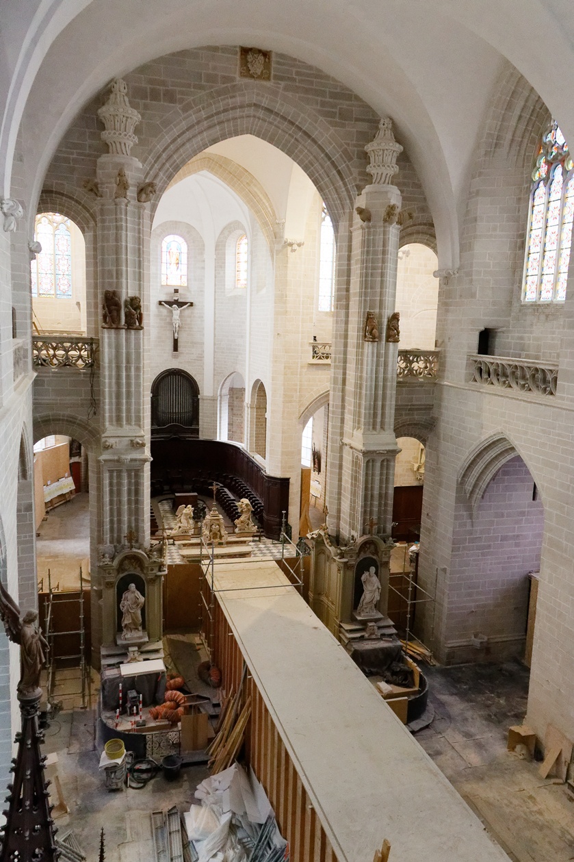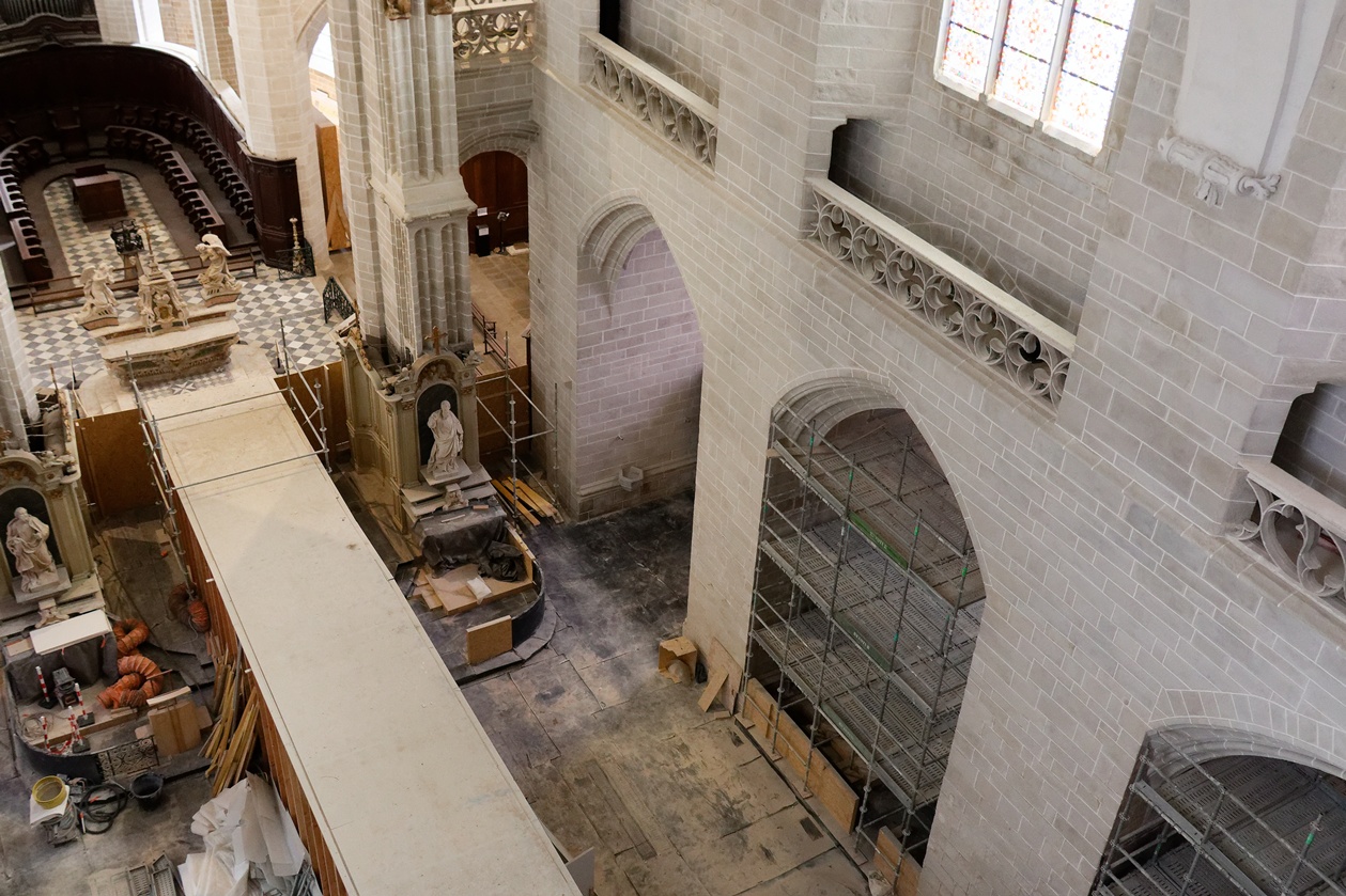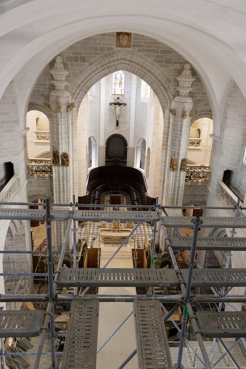 Les échafaudages se retirent progressivement de la nef et laissent entrevoir le magnifique travail réalisé sur les pans de murs dont la blancheur retrouvée s'harmonise maintenant avec l'arrière-choeur que l'on aperçoit tout au fond.