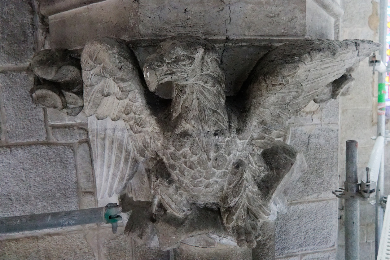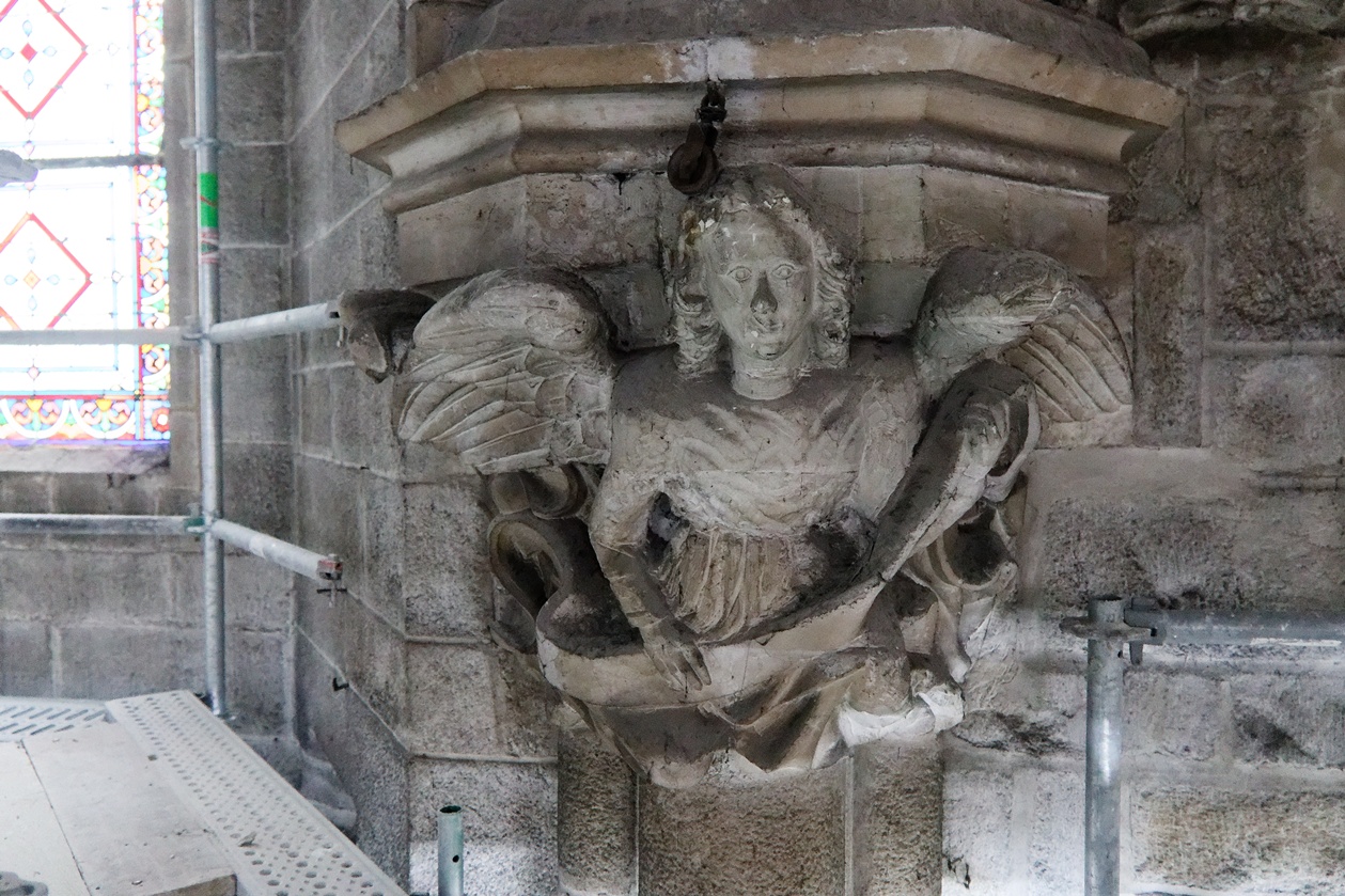 Il reste encore des fissures à reprendre sur quelques montants des voûtes et plusieurs scupltures bien abimées au sommet des piliers.